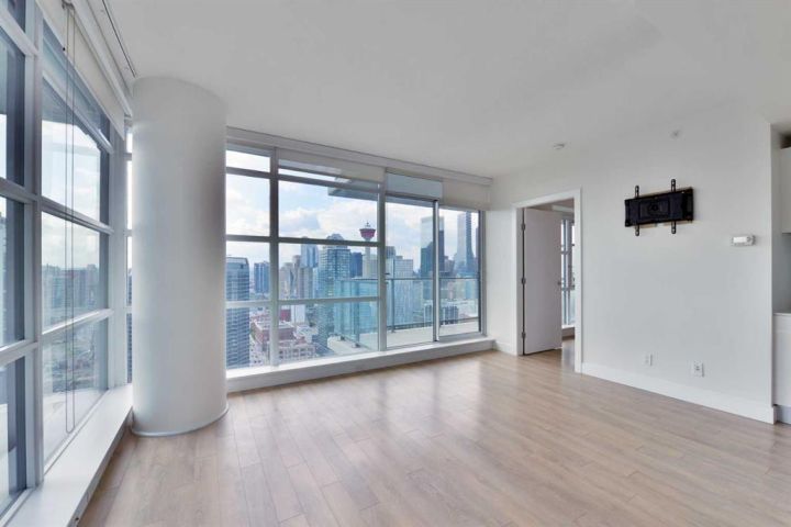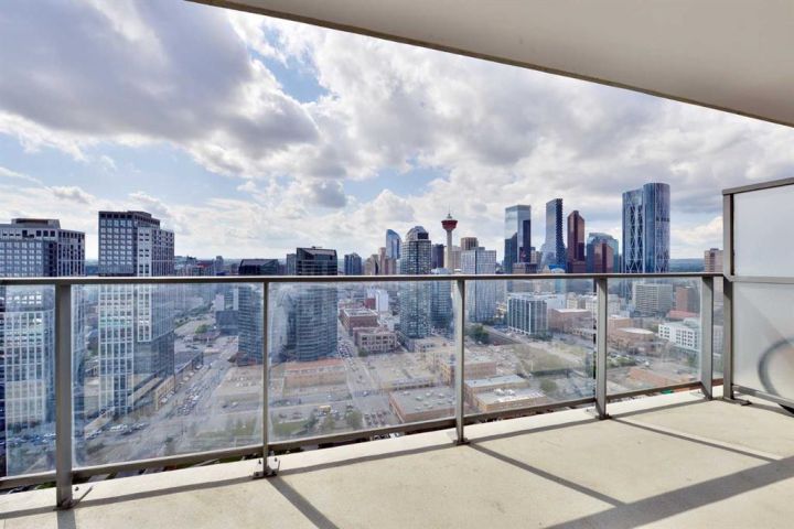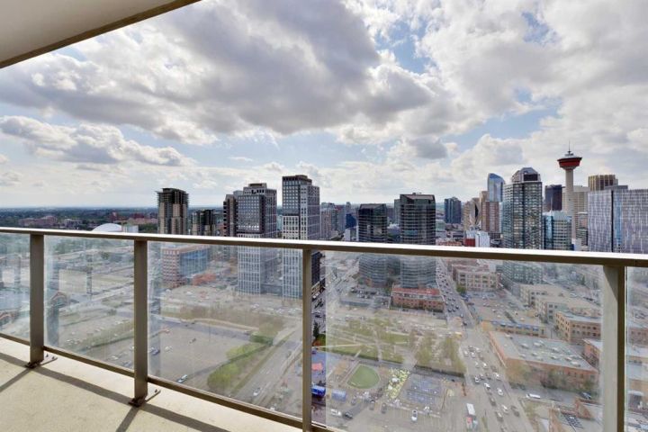Welcome to this immaculate 2-bedroom, 2-bathroom southwest corner unit on the 29th floor, perfectly positioned in the heart of Calgary’s vibrant entertainment district. With breathtaking views of the downtown skyline and sweeping west to the mountains, this executive condo offers style, comfort, and an unbeatable location. Designed for modern living, this spacious home features light oak hardwood flooring and an open-concept layout that’s both functional and inviting. The European-inspired kitchen is a showstopper, showcasing sleek Italian cabinetry, quartz countertops, a contemporary glass backsplash, and stainless steel appliances. Whether you're cooking for one or entertaining a crowd, the generous counter space and smart storage are sure to impress. The living room is a peaceful retreat, ideal for relaxing and recharging, while the dining area provides a welcoming space to gather with friends and family. Floor-to-ceiling windows flood the home with natural light and capture stunning panoramic views from every angle. The private primary suite offers a cozy sanctuary, complete with a custom closet and a stylish 4-piece ensuite. The second bedroom is just as versatile—perfect for guests, a home office, or a roommate. A second full bathroom and in-suite laundry add to the everyday convenience, while the included tandem parking stall and additional storage provide even more value. Step out onto your large west-facing balcony to enjoy golden hour views and warm summer evenings, or take full advantage of everything The Guardian has to offer. This fully air-conditioned, professionally managed building includes daily concierge service and is just steps from the Bow River Pathway, East Village, Eau Claire, and the LRT. Trendy shops, restaurants, and cafés are right outside your door. This is downtown living at its best. Don’t miss your chance—book your showing today!