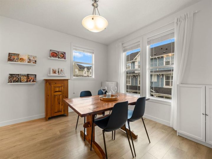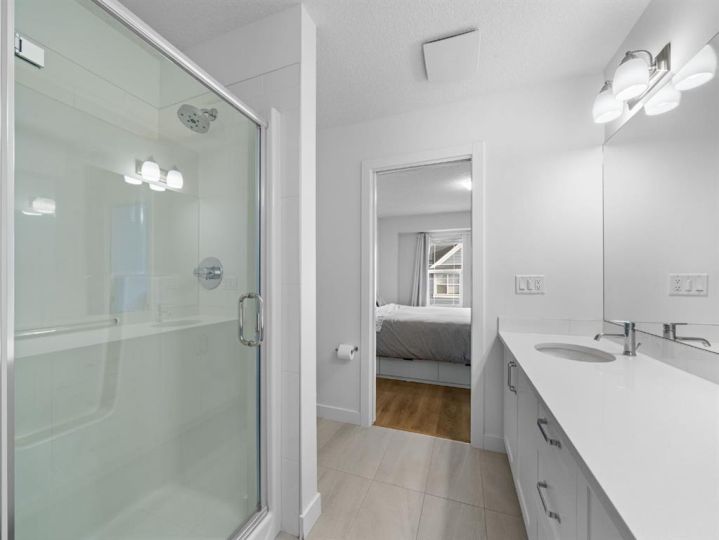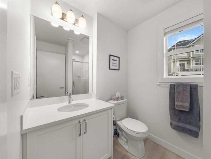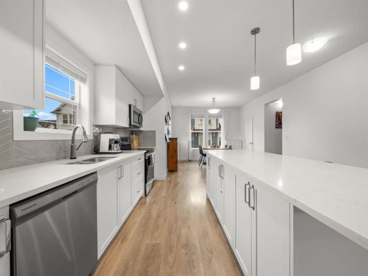 Welcome to this large, fully finished, CORNER UNIT townhome in the heart of Copperfield! This 3 bedroom 3.5 bathroom home blends modern design with everyday comfort. The bright open concept home features upgraded pot lights, wide plank laminate flooring (carpet only on stairs), an electric fireplace, and a spacious kitchen with quartz countertops, stainless steel appliances, herringbone backsplash, large island, and an induction stove with a gas line available if preferred. The rare WRAP AROUND SOUTH FACING balcony is perfect for relaxing or entertaining and includes a gas line for your BBQ. The lower level flex space with a full bathroom offers endless possibilities for a home office, gym, living room, or guest area. Upstairs, all 3 bedrooms let in a ton of natural light and the primary suite features a double sink ensuite and walk-in closet. Additional highlights include AIR CONDITIONING, a water filtration system, upgraded shaker style cabinetry, vanity with extra storage in the powder room, extra windows, and a DOUBLE ATTACHED GARAGE with a MAN DOOR and extended driveway; rare to only specific corner units in the complex. Ideally located just a 3 minute walk to Copperfield School, close to parks, pathways, and all community amenities, this bright and well maintained home is move in ready. Reach out to book your showing today and make sure to check out the 3D Tour!