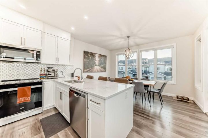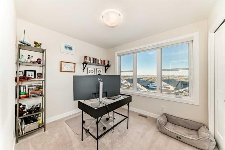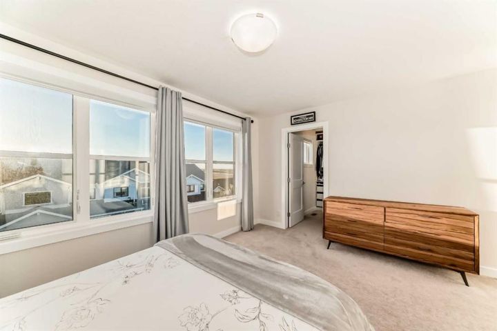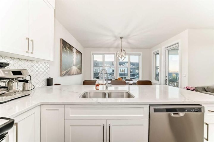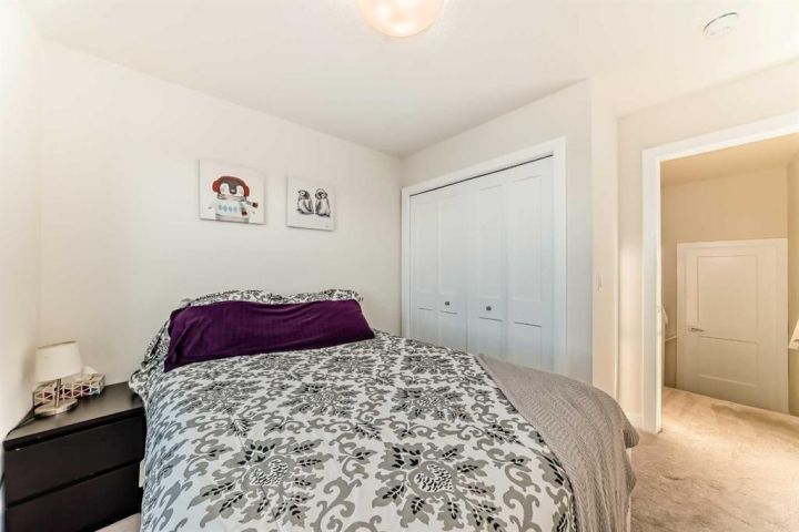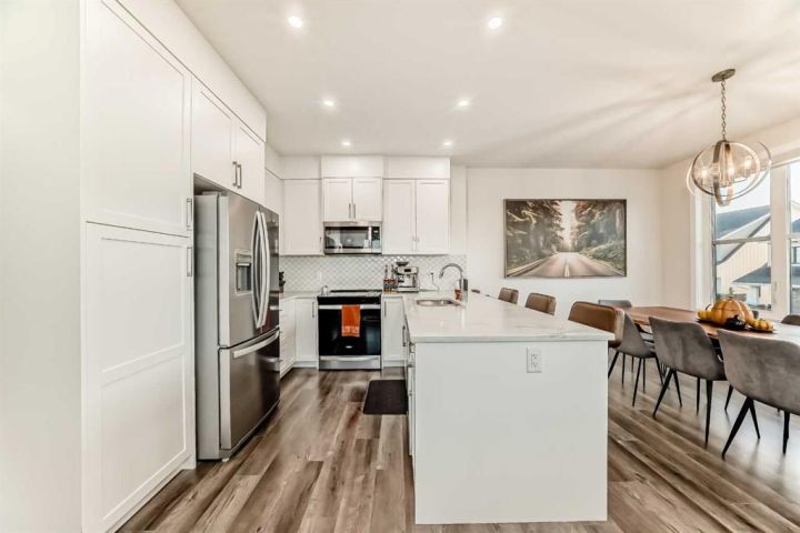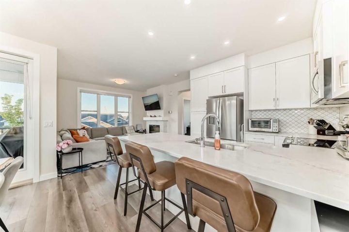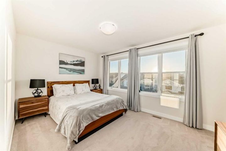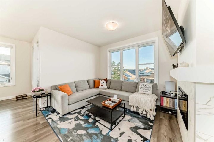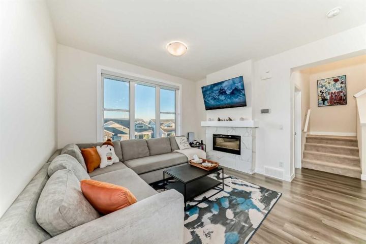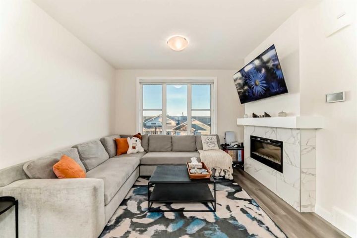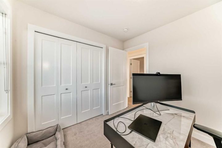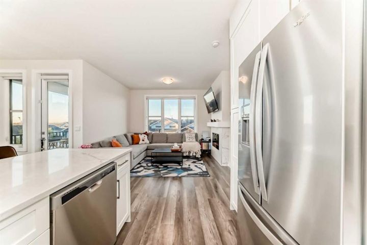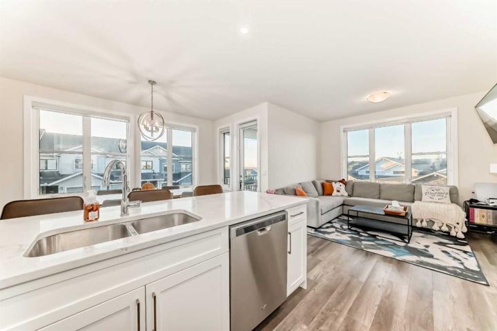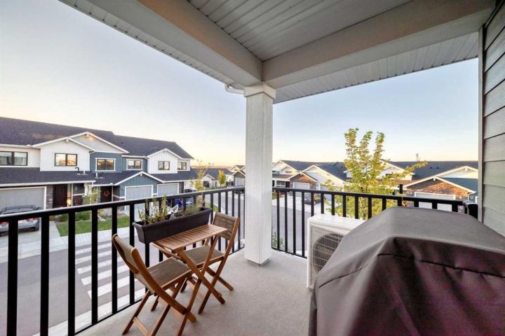 Welcome home to this bright and beautifully designed 3 bedroom, 2.5 bath townhouse featuring a double attached garage and a thoughtful, open concept floorplan. The main level offers a versatile home office perfect for remote work or creative projects and flows seamlessly into a spacious living area with an electric tiled fireplace. The sleek kitchen showcases stainless steel appliances, ample cabinetry, and elegant finishes, opening onto a balcony with sunset views. Upstairs, the primary suite impresses with a walk-in closet complete with built-in organizers, while two additional bedrooms provide plenty of room for family or guests. Set on a corner lot, this home is conveniently located close to parks, ponds, and walking paths. A large storage/furnace room adds extra functionality to this modern retreat. Enjoy the perfect balance of comfort, style, and convenience in a location surrounded by natural beauty.