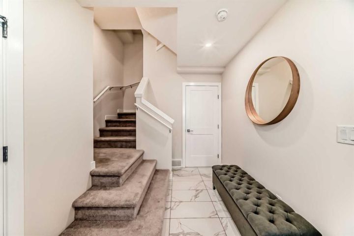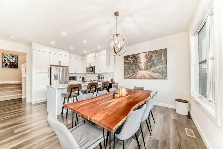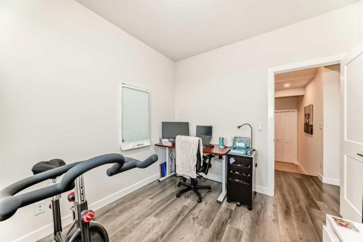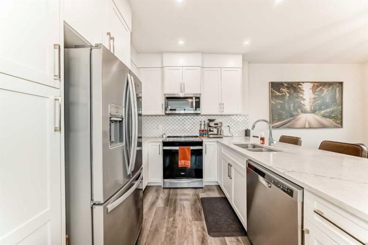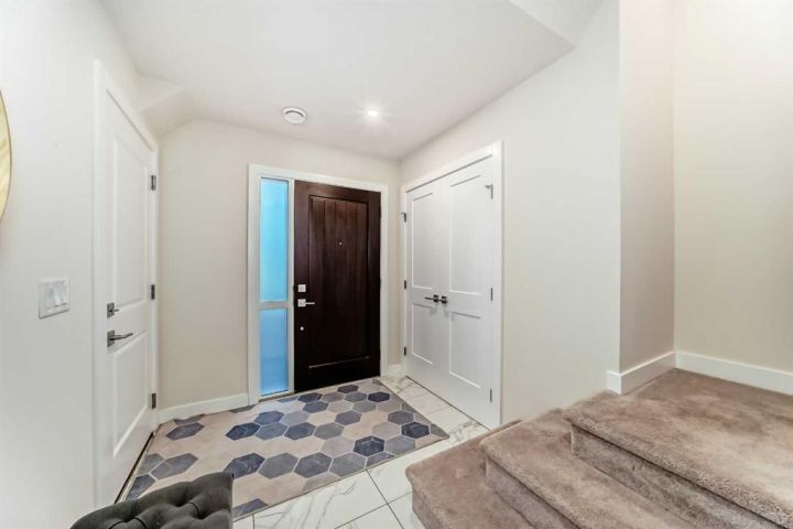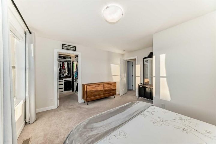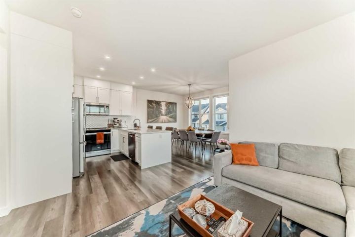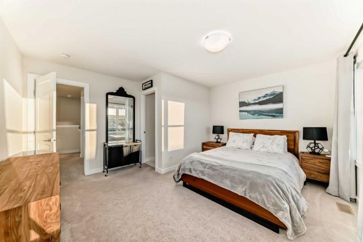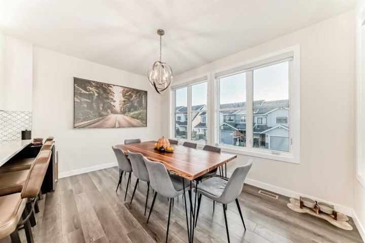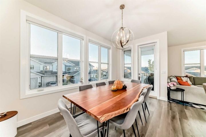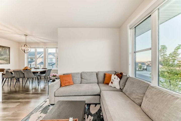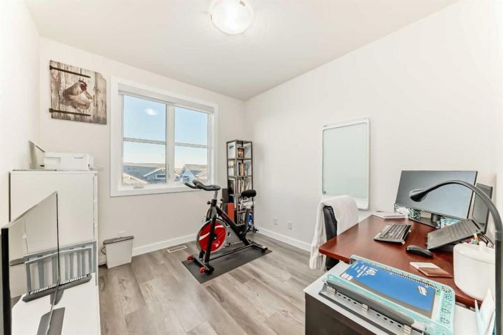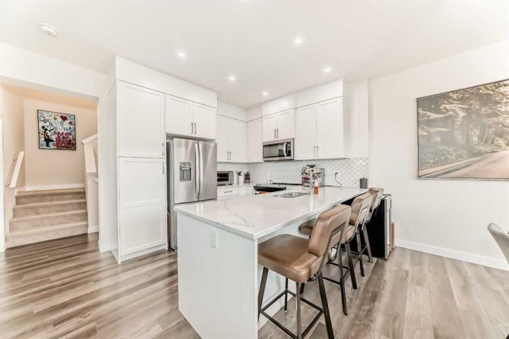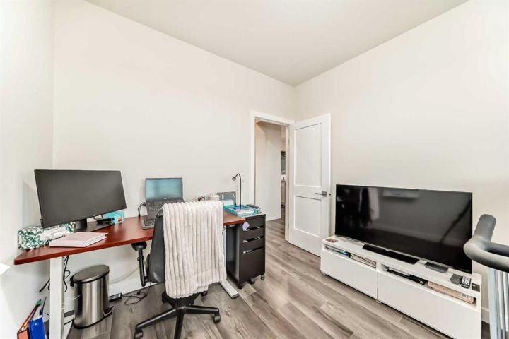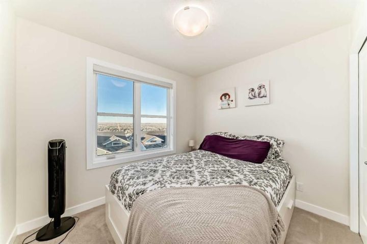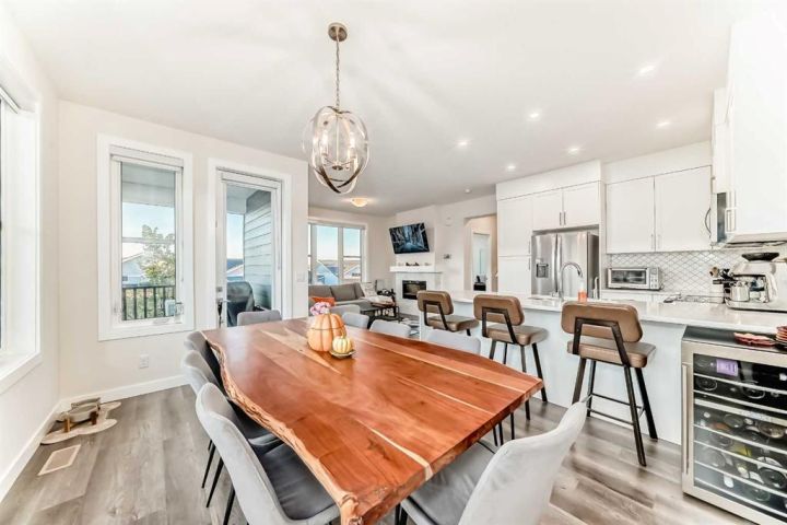 Welcome home to this bright and beautifully designed 3 bedroom, 2.5 bath townhouse featuring a double attached garage and a thoughtful, open concept floorplan. The main level offers a versatile home office perfect for remote work or creative projects and flows seamlessly into a spacious living area with an electric tiled fireplace. The sleek kitchen showcases stainless steel appliances, ample cabinetry, and elegant finishes, opening onto a balcony with sunset views. Upstairs, the primary suite impresses with a walk-in closet complete with built-in organizers, while two additional bedrooms provide plenty of room for family or guests. Set on a corner lot, this home is conveniently located close to parks, ponds, and walking paths. A large storage/furnace room adds extra functionality to this modern retreat. Enjoy the perfect balance of comfort, style, and convenience in a location surrounded by natural beauty.