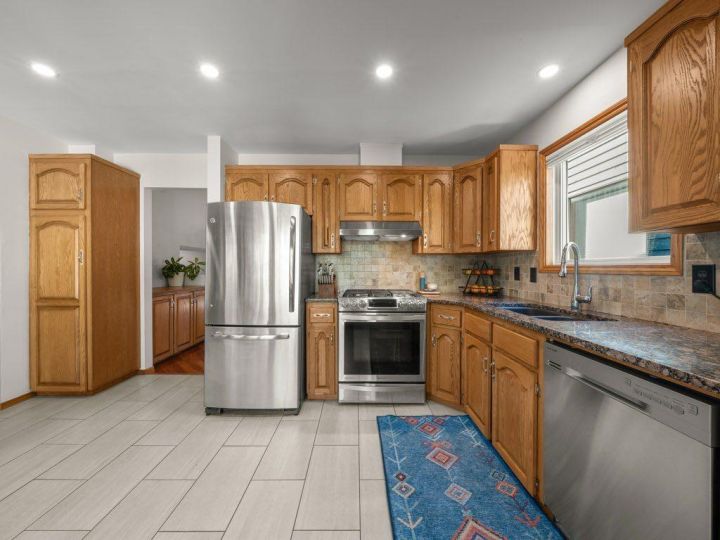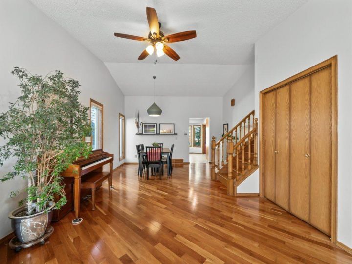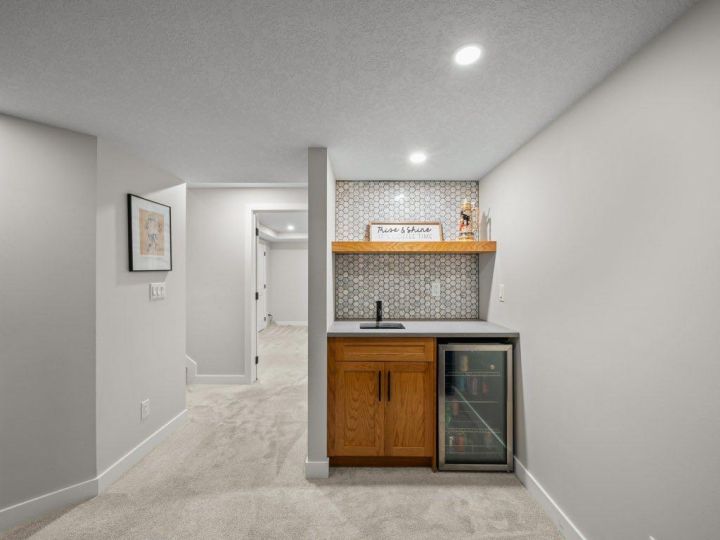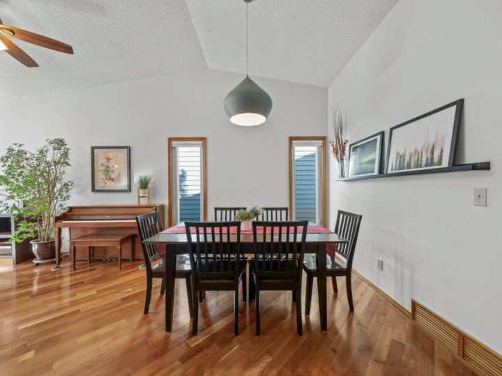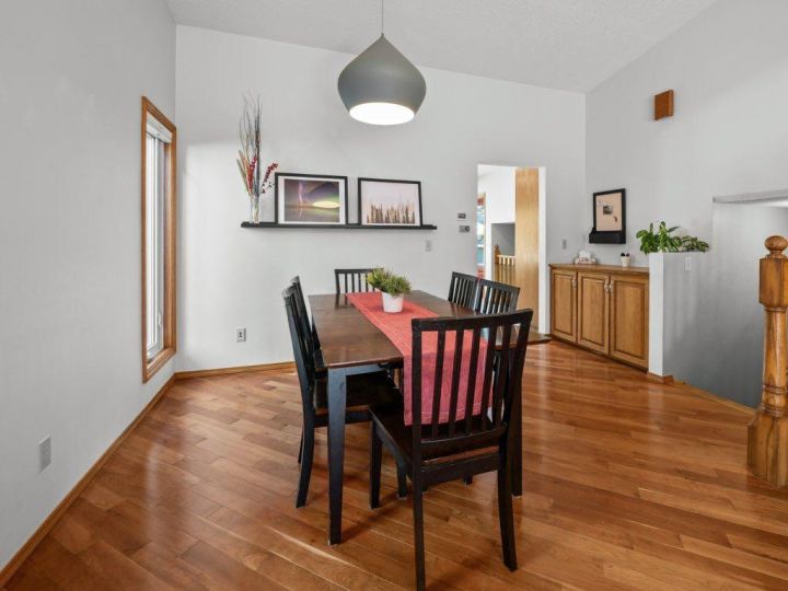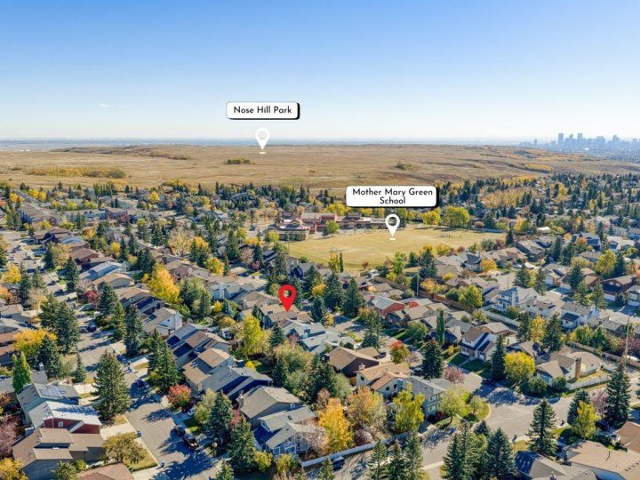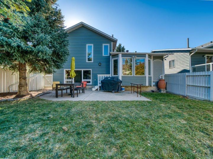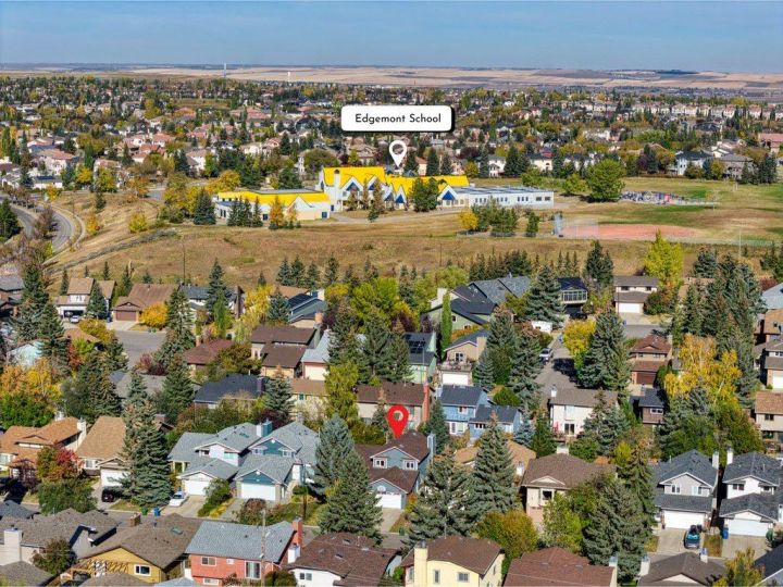Located in upper Edgemont on a mature, tree-lined lot, this 5-bedroom split level offers over 1,850 sq ft across the three levels, plus a fully developed basement. A practical layout with vaulted ceilings and cherry hardwood supports comfortable day-to-day living. The kitchen adds function with granite counters, a full stainless appliance package, tile backsplash, updated tile flooring, and pot lights. Upstairs are three bedrooms, including a primary with ensuite, while a main-level bedroom works well as a home office next to the powder room. The renovated basement provides added flexibility with a rec room, wet bar, built-in fireplace, a fifth bedroom, and generous crawl-space storage. Recent improvements include a modern exterior repaint, newer high-efficiency furnace and central A/C, and updated windows for comfort and efficiency. Set on a quiet street with mature landscaping and close access to neighbourhood schools and Nose Hill Park.