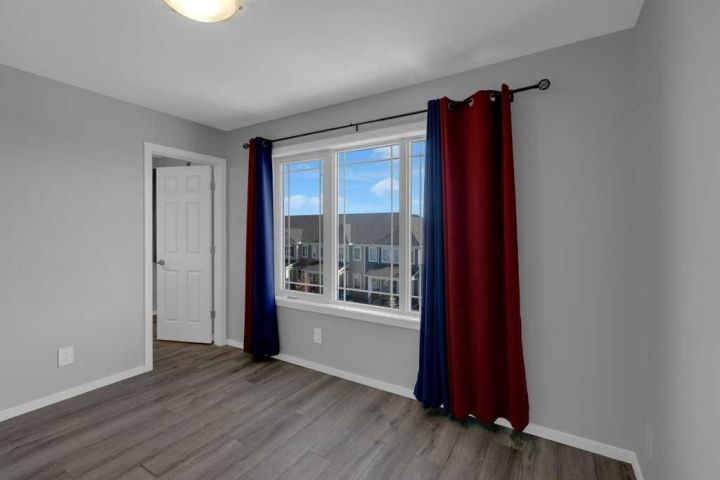 Modern End-Unit in Windsong! Set on a sunny corner in Windsong, this townhome blends contemporary finishes with a smart three-level layout and a single attached garage. Offering 3 bedrooms and 2.5 baths, and lots of living space, this home is move-in ready. The ground level welcomes you with a bright foyer and a large utility/storage room, and access to your own single attached garage. Upstairs on the second level, you will fall in love with the natural light that pours into the open, airy main floor, anchored by a sleek kitchen featuring quartz countertops and an oversized island with seating. A convenient 2-piece powder room sits nearby. Dine inside or step out from the dining area to a spacious southwest-facing balcony, perfect for evening sun. The generous living room easily accommodates a sectional and media setup, framed by big windows. On the top level, you’ll find two comfortable bedrooms, a laundry room, and an upgraded 4-piece bath. The private primary suite includes a walk-in closet and its own 4-piece ensuite. Additional highlights include luxury vinyl plank flooring, upgraded finishes throughout, a single attached garage, and a small front yard, great for pets. The location checks every box: steps to playgrounds, pathways, and a pond, with shopping, restaurants, schools, transit, and parks close by. Commuters will appreciate quick access to Highway 2 and the short drive into Calgary.