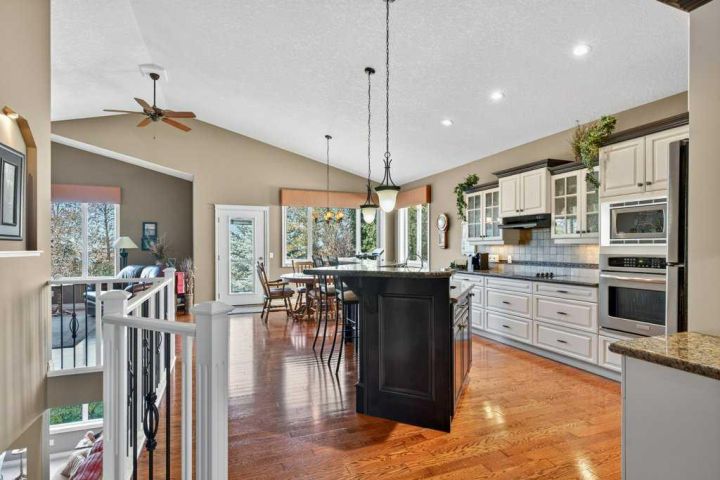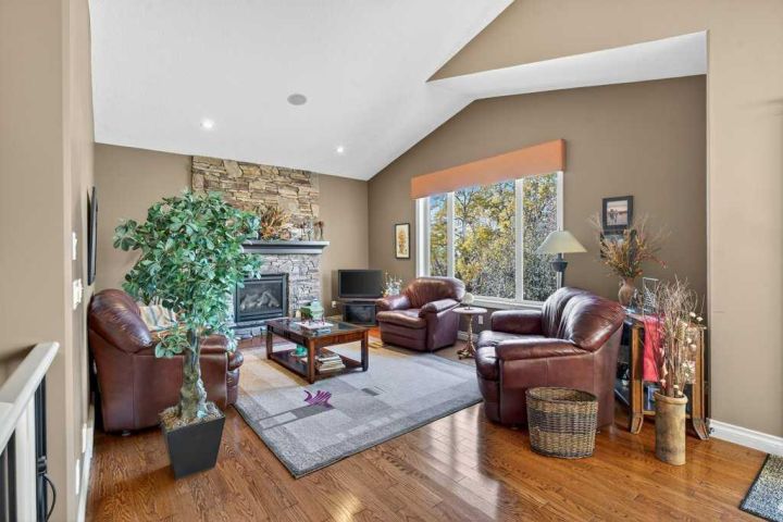 Hardwood floors flow throughout the kitchen and living area. The kitchen features two-tone cabinetry, stone countertops, and a spacious sit-up island, perfect for cooking or entertaining. The living room centers around a stone-clad fireplace, creating a warm, inviting atmosphere.