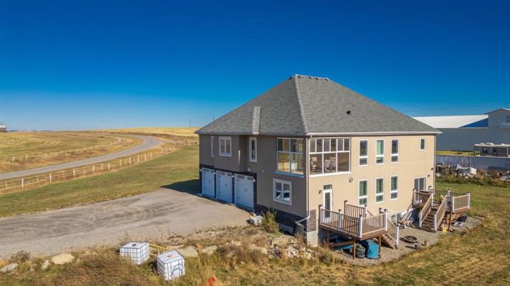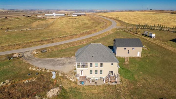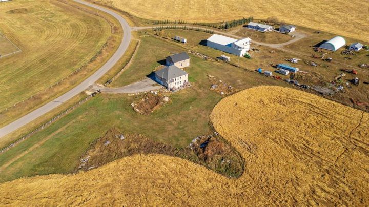 Stunning 18-Acre Estate with Panoramic Mountain Views, Geothermal Heating & Executive Workshop Welcome to an extraordinary country retreat just minutes south of Okotoks and a short drive to Calgary — a one-of-a-kind residence combining cutting-edge construction, elegant design, and breathtaking mountain vistas. Set on 18 serene acres along Clear Mountain Drive, this grand home showcases superior energy efficiency, exceptional craftsmanship, and room to live, work, and play. Impeccable Construction & Design. Built to impress, the home features ICF (Insulated Concrete Form) basement walls and SIP (Structural Insulated Panel) construction on the first and second floors, ensuring remarkable strength and energy efficiency. Triple-pane windows throughout the home enhance comfort and quiet. Inside, enjoy 10-foot ceilings in the grand room, 9-foot ceilings throughout the main level, and elegant coved ceilings on every floor, including the dining room and office. Elegant Interiors The main floor is graced with marble and hardwood flooring, a welcoming two-storey vaulted foyer, and a sunken living room warmed by a cozy gas fireplace. The spacious dining area flows into a gourmet kitchen boasting an oversized island with built-in beverage cooler, double built-in ovens, a gas cooktop, elegant crown moulding, and abundant cabinetry. A main-floor office provides an ideal workspace. Luxurious Upper Level Upstairs, a bright and generous loft offers a retractable screen for a home theatre. The primary suite includes a four-piece ensuite bath, walk-in closet, and a private enclosed balcony framing panoramic mountain views. Two additional bedrooms share a Jack-and-Jill bath, and a convenient upper-floor laundry completes the level. Expansive Lower Level The basement includes a second kitchen, two more bedrooms, a finished gym, storage area, and a poured, partially completed indoor swimming pool, awaiting your finishing touches. A sprinkler system is roughed in on all levels for added peace of mind. Exceptional Energy Efficiency The entire home is heated and cooled by a 6-ton geothermal energy system, offering environmentally friendly comfort year-round. Triple Garage (suspended, with pool underneath) & Professional Workshop in a separate building For the hobbyist or business owner, a fully finished 1,500 sq. ft. shop awaits — large enough to accommodate a 40-foot RV, complete with mezzanine level, ready for power and water hookups. Country Living, City Convenience Enjoy the best of both worlds — country privacy and space paired with city proximity. Whether you envision an equestrian estate, family compound, or simply room to breathe, this property offers endless potential.