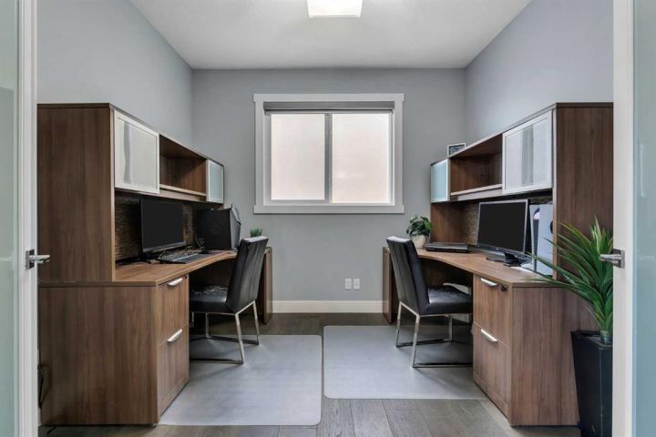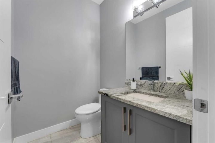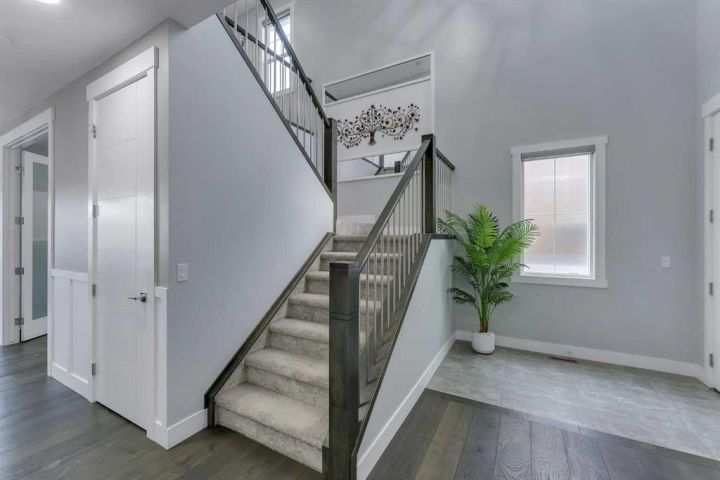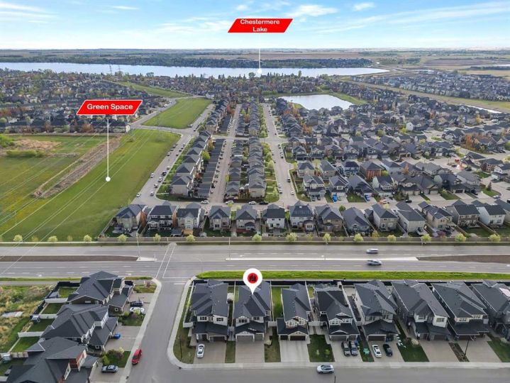 Experience luxury living in this 2700+ sqft custom-built home located in the heart of Chestermere—just steps from the canal, ideal for peaceful walks or bike rides to Calgary for those with an active lifestyle. This west-facing home offers striking curb appeal with an exposed aggregate driveway, vinyl fencing, extended cement walkway, and a maintenance-free backyard patio with BBQ gas line. Step into a grand open-to-below foyer with 8ft doors throughout the main level, paired with 9ft knockdown ceilings, wainscoting, feature walls, and engineered hardwood floors. The main level also features a dedicated flex room, open mudroom with dual coat closets, motorized blinds throughout, and is roughed-in for central vacuum. The chef’s kitchen is a true showstopper, complete with an oversized island, granite countertops throughout, soft-close cabinetry to the ceiling, two gas ranges, two dishwashers, a built-in oven and microwave, high-powered hood fan, and a fully equipped spice kitchen with garburator. The great room showcases a floor-to-ceiling tiled gas fireplace with in-ceiling speakers, creating a perfect space for hosting. Upstairs features 4 spacious bedrooms, including 2 master suites. The primary retreat boasts a spa-like 5-piece ensuite with a standalone tub, custom steam shower, double vanity, ceiling-height mirrors, toilet with window, and a walk-in closet with built-ins. The second master includes its own 4-piece ensuite with stand-up shower. Two additional bedrooms and a full bath with stand-up shower complete the upper level, along with a bonus room with feature wall, laundry room with sink, and Cat5 wiring. The fully finished basement features a separate side entrance, 2 bedrooms, a full bathroom with tiled stand-up shower, laundry and kitchen rough-ins, a storage room, and a large open family room—ideal for extended family or future suite development (subject to approval and permitting by the city/municipality). Additional highlights include a heated, insulated garage with gas line, home security system with 7 cameras + NVR, AC rough-in, and the peace of mind of remaining new home warranty!