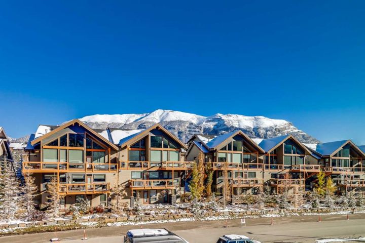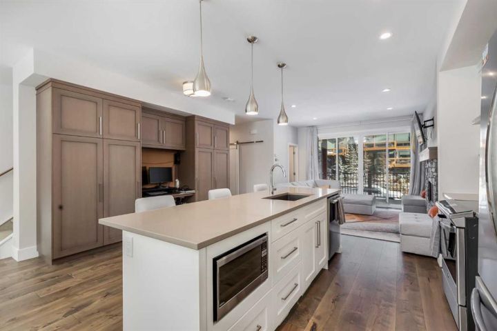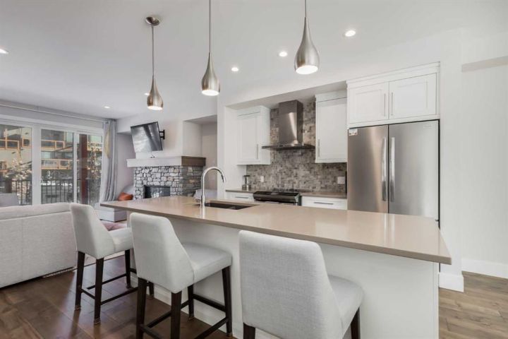 Beautifully maintained three-bedroom townhouse in Stewart Creek featuring over 1,700 sq ft of stylish living space and a double attached garage. Located in sought-after Three Sisters Mountain Village, this bright and inviting home showcases an open-concept main floor with a chef's kitchen offering quartz countertops, modern cabinetry, stainless steel appliances, and recent upgrades including air conditioning, a gas range, and a new refrigerator. The spacious dining area is perfect for entertaining and flows into a comfortable living room with a cozy fireplace and access to a deck boasting breathtaking mountain views. Upstairs you'll find a serene primary bedroom complete with a walk-in closet and ensuite bath, along with two additional bedrooms and another full bathroom. With engineered hardwood floors throughout, abundant natural light, and excellent storage options including a large gear room, this home blends luxury and practicality. The upcoming Gateway at Three Sisters commercial development will soon add nearby shops, grocery stores, and restaurants, enhancing the convenience of this exceptional mountain property.