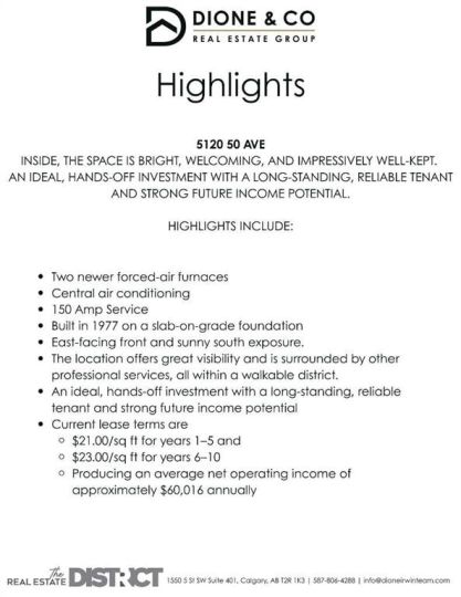 Here’s your chance to own a fully leased, stand-alone commercial property right in the vibrant core of Uptown Olds. Spanning 2,537 sq ft, this solid masonry building has been home to a trusted physiotherapy clinic for over two decades. The tenant recently committed to a brand-new 10-year Triple Net lease—complete with a rent increase at the halfway mark—meaning they cover all operating costs, including taxes, insurance, and maintenance. For you, that translates into a dependable, low-maintenance income stream. Inside, the space is bright, welcoming, and impressively well-kept. The layout includes five private treatment rooms, a large open exercise area with two additional treatment spaces, a professional reception and waiting area, an office, file storage, two washrooms (one with a shower), and a laundry room. Comfort is ensured with two newer forced-air furnaces and central air conditioning. Built in 1977 on a slab-on-grade foundation, the property benefits from excellent natural light thanks to its east-facing front and sunny south exposure. The location offers great visibility and is surrounded by other professional services, all within a walkable district. Current lease terms are $21.00/sq ft for years 1–5 and $23.00/sq ft for years 6–10, producing an average net operating income of approximately $60,016 annually. An ideal, hands-off investment with a long-standing, reliable tenant and strong future income potential.