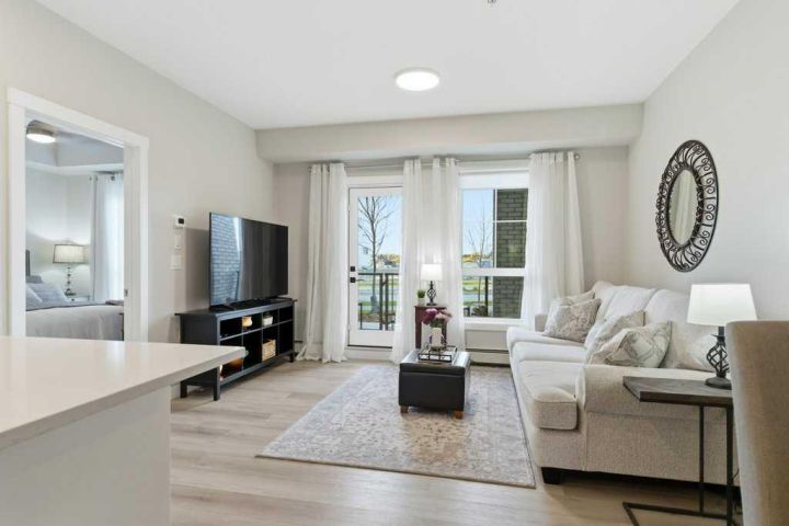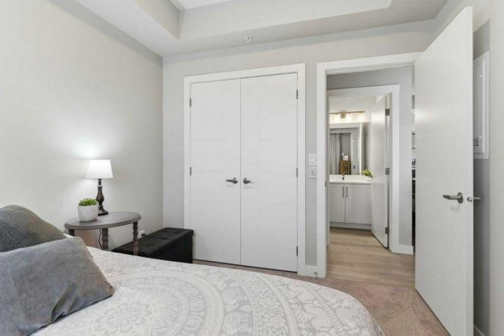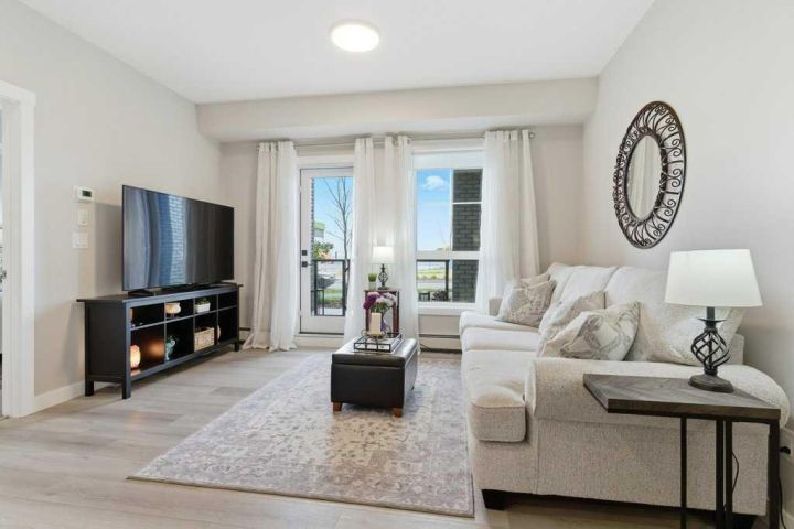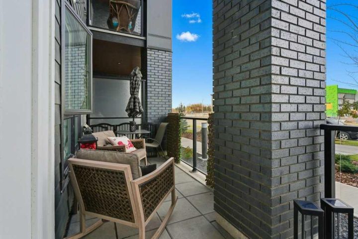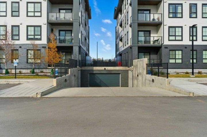 Welcome to #1107, 100 Banister Dr at the beautiful Lawrie Park Condos. This brand new Ava model condo offers the perfect blend of style, functionality, and location. Featuring 2 bedrooms, 2 bathrooms, and over 840 sq ft of thoughtfully designed living space, this home is ideal for anyone seeking comfort, convenience, and modern living. Only 15 minutes south of Calgary in one of Okotoks newest communities, this location has it all. Step inside to discover a bright open-concept layout with luxury vinyl plank throughout the unit, beautiful shaker-style cabinets, extra pull-out drawers in the kitchen, quartz counter tops and a seamless flow between the living, dining, and kitchen areas. The primary suite includes a spacious walk-in shower and a custom linen closet for added storage and organization. What truly sets this unit apart is its massive walkout patio — the largest in the entire complex (34 feet)! Other units in the complex have walkouts as well, but none as big and spacious as this one! Enjoy direct street access, making it easy for guests or pet owners to come and go. A phantom screen door and patio gate add extra comfort and convenience. This pet-friendly building also boasts low condo fees, offering exceptional value and peace of mind. Additional features include underground parking, a separate storage locker, and ample street parking right out front. The location can’t be beat — just steps from basketball courts, community garden plots, playground, bike park, a nearby shopping centre, golf courses, enclosed dog park, and a scenic pond with walking paths. Whether you’re looking to enjoy nature, stay active, or explore local amenities, everything you need is right at your doorstep. Move-in ready and loaded with upgrades, this beautiful condo combines modern finishes with unbeatable functionality. Don’t miss your opportunity to call this brand-new home your own — book your showing today!