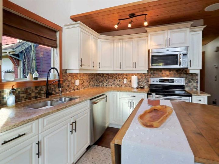 Step inside to an inviting open-concept floor plan highlighted by vaulted pine ceilings, expansive windows, and skylights that flood the space with natural light. The sunny kitchen features granite countertops, abundant cabinetry, and a lovely view of the front porch opens up to a cozy living area—ideal for relaxing or entertaining.