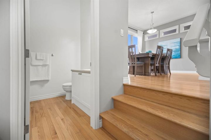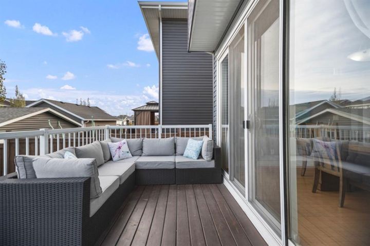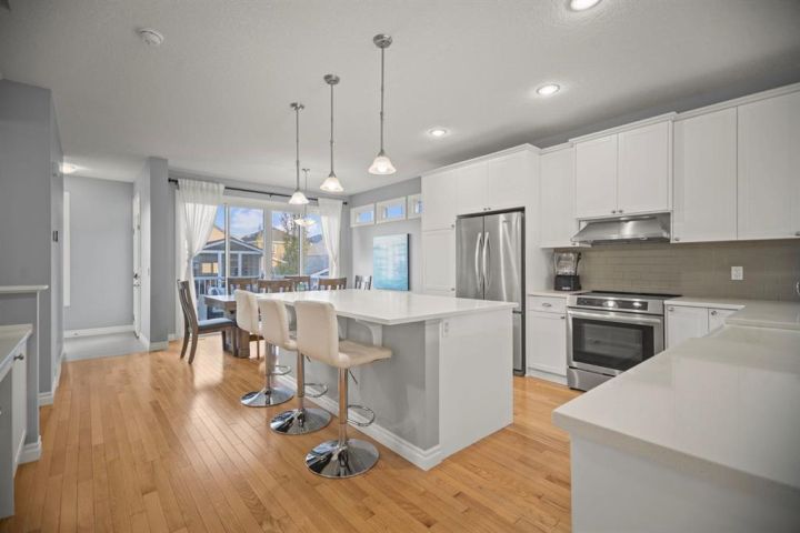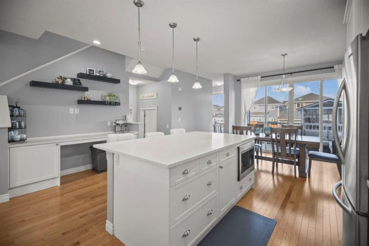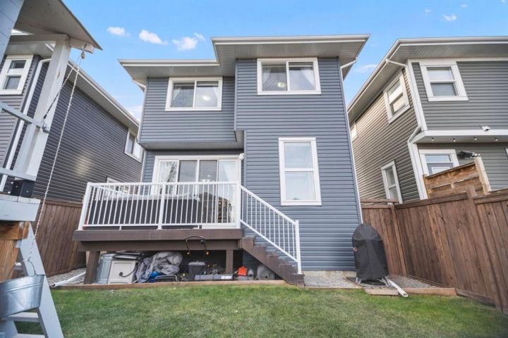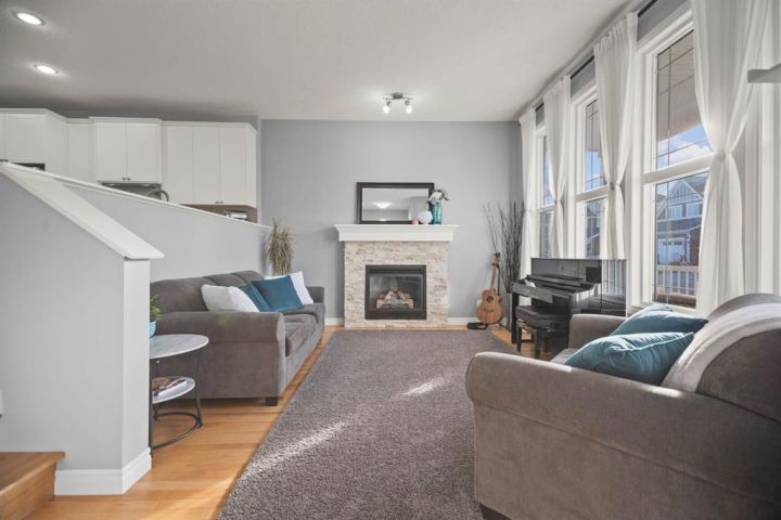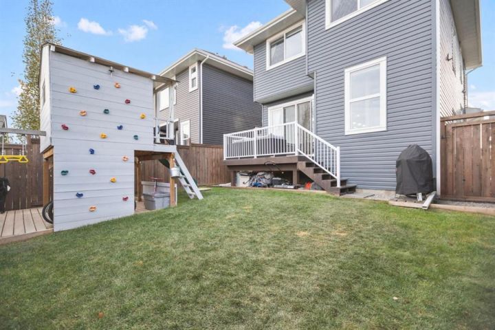 Welcome to 411 River Heights Crescent, a beautifully appointed home where timeless design meets modern sustainability. Thoughtfully designed with high ceilings, expansive windows, and a naturally flowing floor plan, this residence offers a perfect blend of light, space, and comfort. The main level features a bright and open living area anchored by a striking stone-surround gas fireplace and framed by large south-facing windows. The elegant kitchen is a true centerpiece showcasing timeless white cabinetry, a farmhouse sink, quartz countertops, hidden microwave, and a large uninterrupted island ideal for baking, entertaining, or family meals. Hardwood floating shelves add warmth and charm, while a 3rd rack dishwasher and spacious pantry enhance everyday functionality. Upstairs, the primary suite is a tranquil retreat with oversized windows, a large walk-in closet, and a spa-inspired ensuite with large vanity with generous storage, and a relaxing corner tub. Two additional bedrooms and a full bathroom with a large vanity complete the upper level. The fully developed basement extends the living space with a large, versatile recreation area perfect for hobbies, fitness, or family movie nights along with an additional bedroom and tons of storage space. This home stands apart with its professionally installed 7.36 kW Net Zero Solar System, designed for peak efficiency and long-term savings - generating over 40,900 kWh of energy in its first 5 years. Over its lifetime it will offset 151,000 lbs of coal; this system delivers near net-zero electricity costs averaging under $100/month for a family of six. Environmentally, it’s equivalent to planting 3,600+ trees or removing a vehicle from the road each year. Outside, the beautifully landscaped yard features raised garden beds, established perennials, and both north- and south-facing outdoor living spaces, a sunny front veranda and a private back deck off the dining room that has double sliding doors to extend the space naturally for summer gatherings. It has a great size yard with a playhouse for the kids to enjoy. Located in a quiet, low-traffic section of River Heights Crescent, this home offers quick access to parks, playgrounds, schools, and walking paths, with easy routes to downtown Cochrane and Calgary. It’s a rare opportunity to enjoy timeless craftsmanship, a smart layout, and modern energy independence all in one remarkable home.