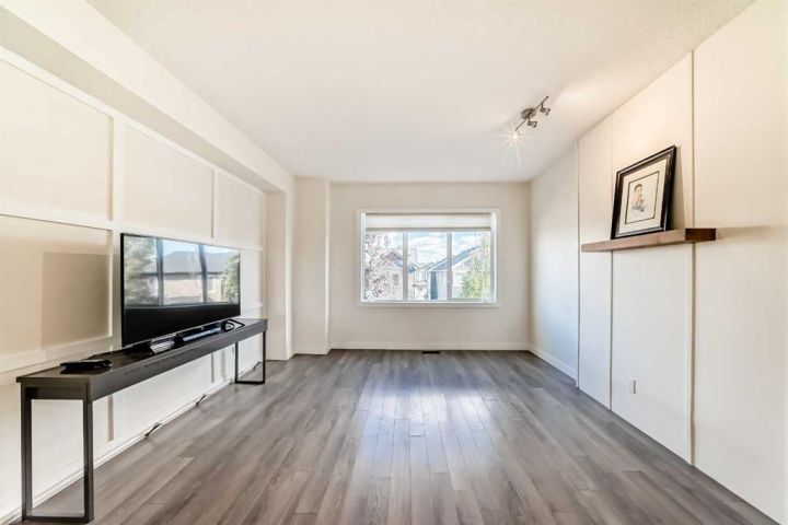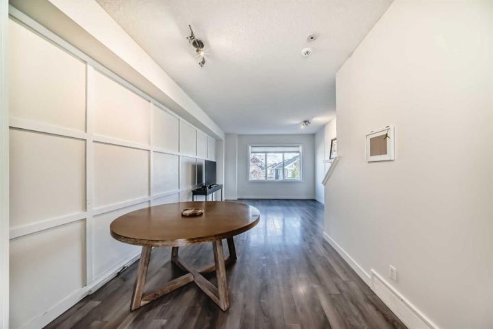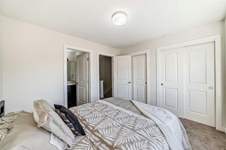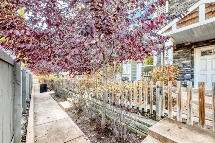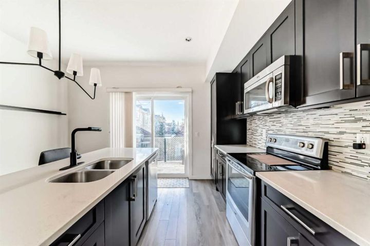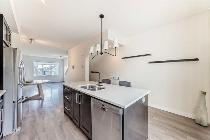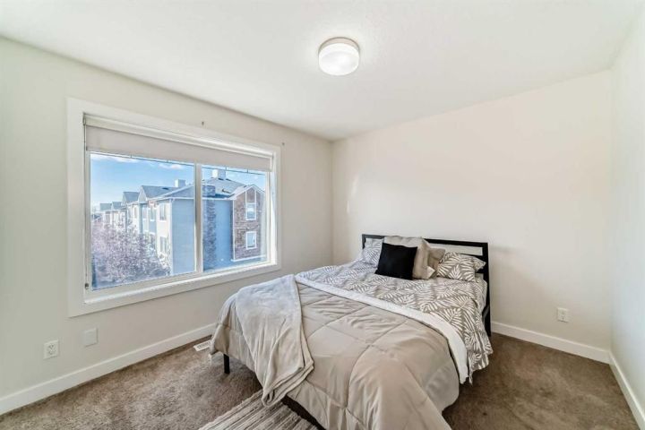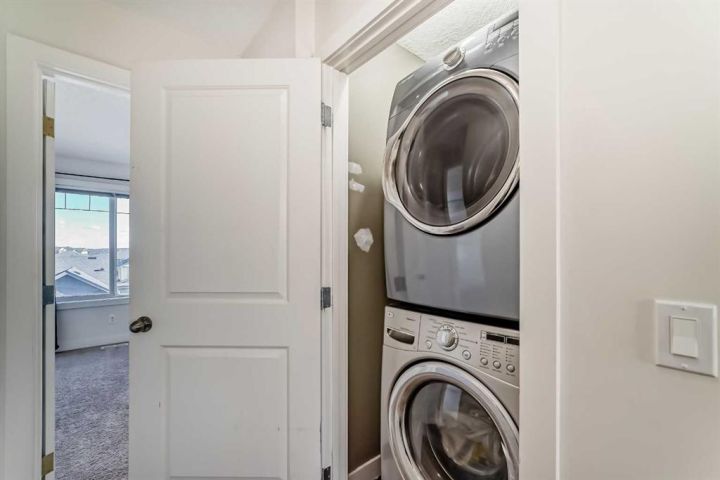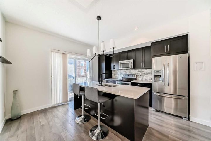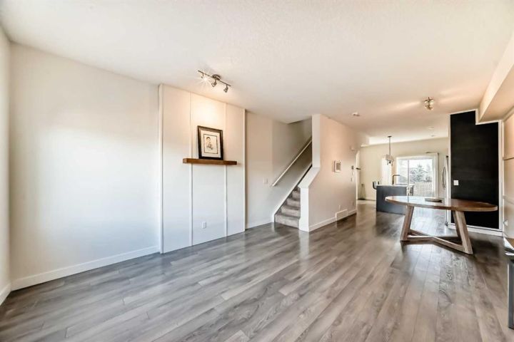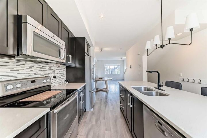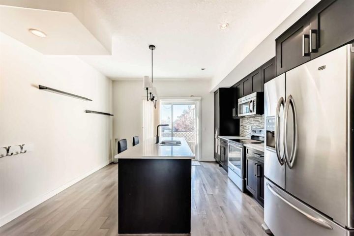The ground floor entrance near garage leads to fabulous office workspace with built in desk and shelving. Entrance foyer with large closet and access to 2 pc bath, as well as inside entrance to garage where you will find the furnace/mechanical room. Carpeted stairs lead up to a beautiful open, spacious full of natural light main living area. There is a beautiful accent wall in dining and living room plus almost full width windows which floods the room with natural light. Kitchen features lots of rich dark natural wood cabinetry which highlights the gorgeous white quartz countertops and island. Gleaming stainless steel appliances complete your dream kitchen. Sliding patio doors lead to a balcony with enough room for the whole family. The upper level has 3 spacious bedrooms including a primary bedroom with a 3 piece ensuite and 2 double clothes closets. The upper level laundry room with stackable washer/dryer is a real step saver. Front yard is a fenced and private mini oasis with low maintenance landscaping with trees and bushes providing almost total privacy. Call your favourite Realtor to view this great family home.