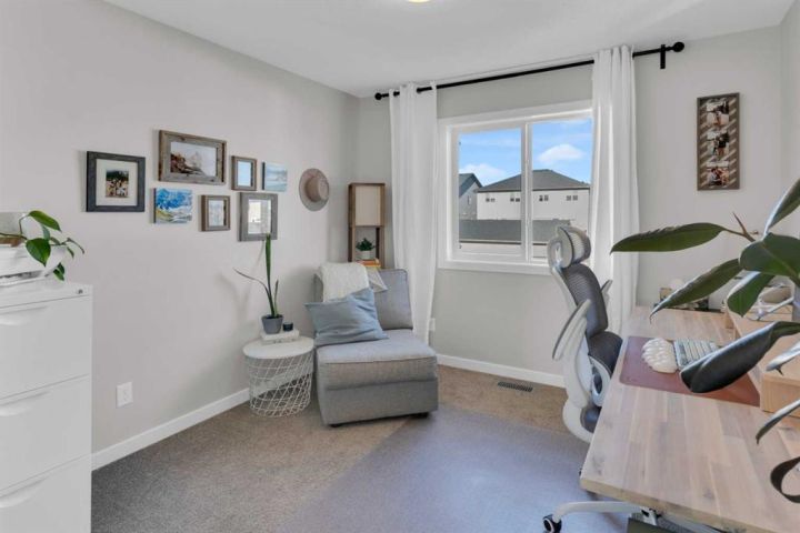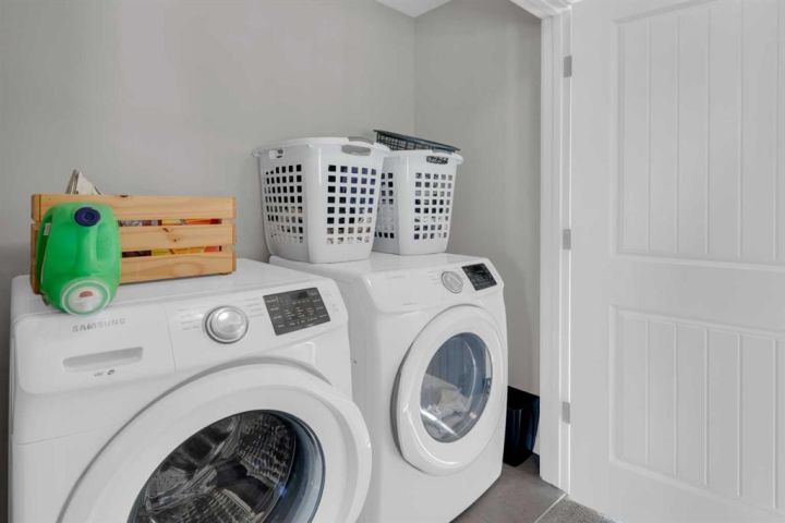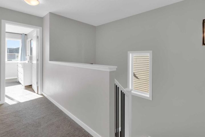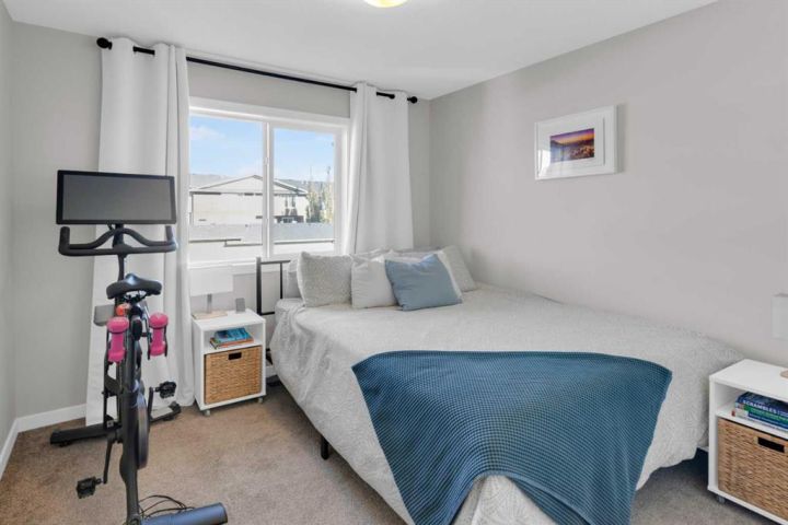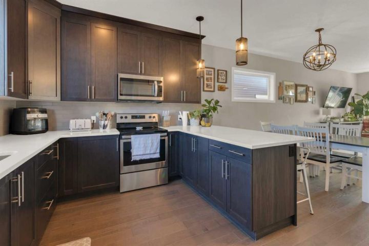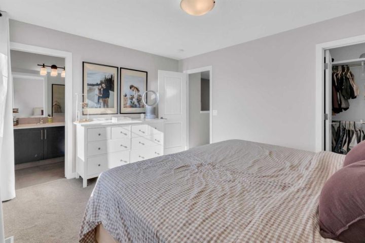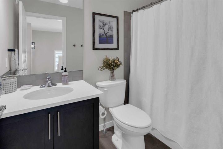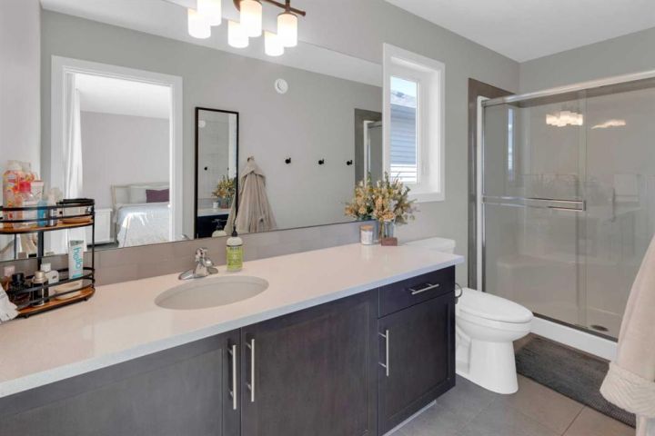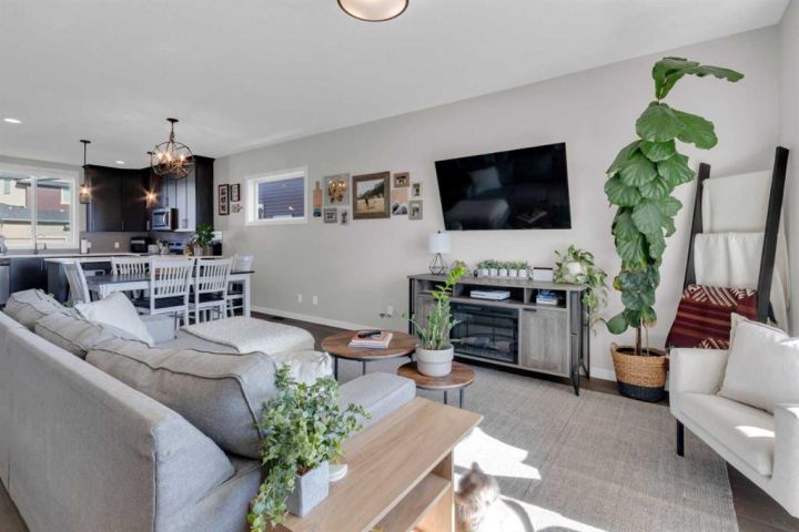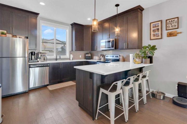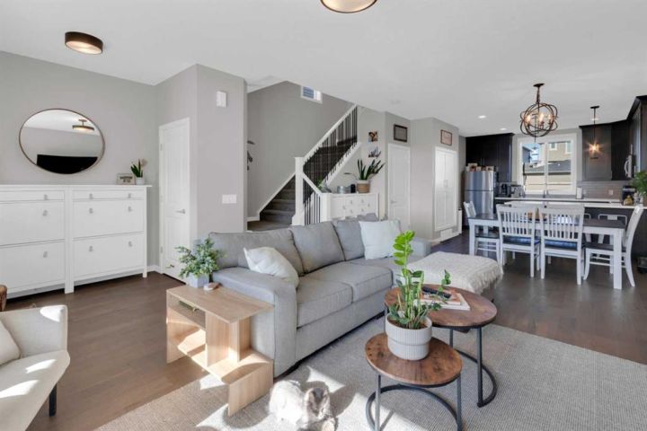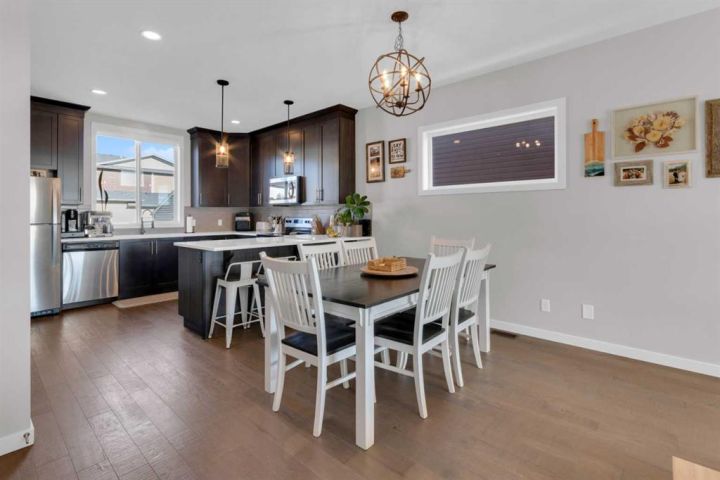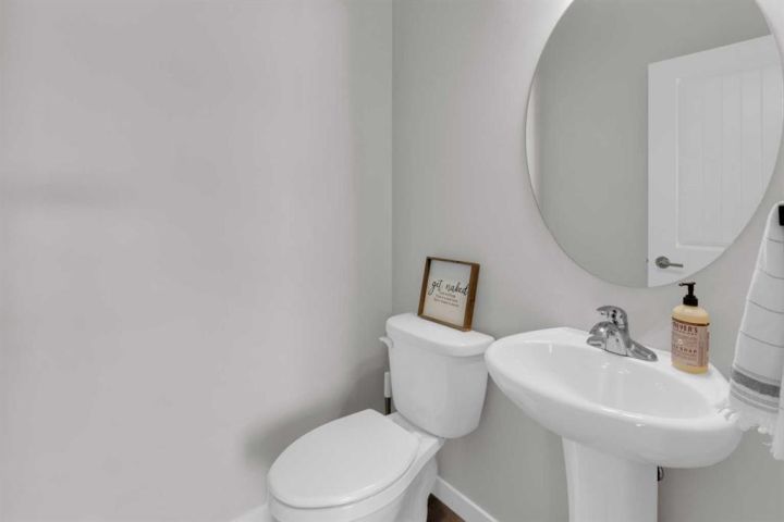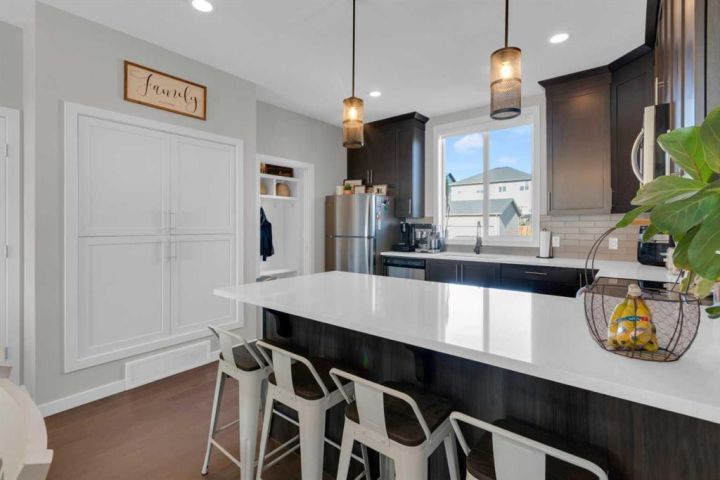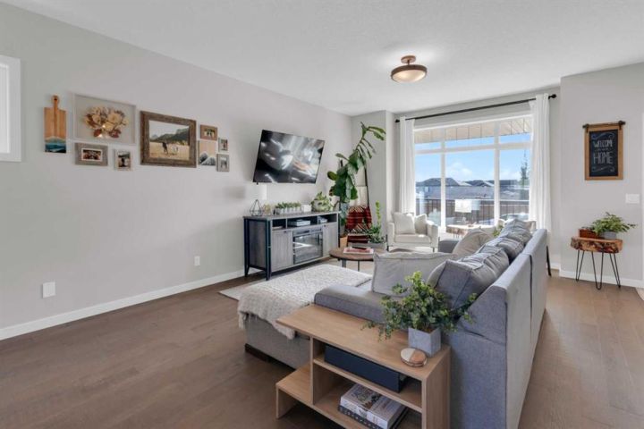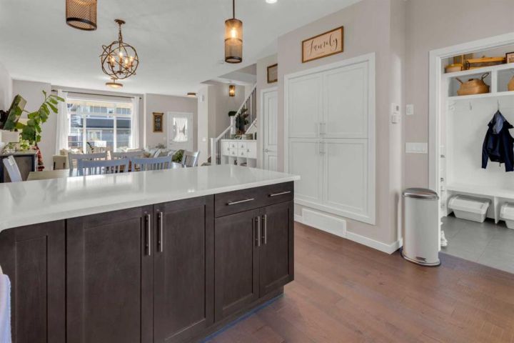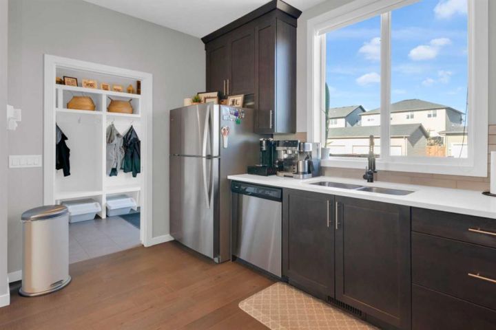 This bright and sunny, open-concept main floor plan embraces a warm & modern aesthetic with 9’ knock-down ceilings and hardwood floors. The spacious living room flows seamlessly into the dining area & kitchen boasting full-height cabinets, soft close drawers and doors, double door -built in pantry, quartz counters and generous breakfast bar. This dream kitchen is not only a joy to prepare meals in, but a space family & friends will gravitate to. Access the rear deck and fenced yard through the back entrance boasting convenient and attractive mud room with custom wood lockers and 2-piece bath. Upper level includes spacious, sunny, primary retreat, roomy ensuite with extra-long quartz counters and oversized walk-in shower. Convenient laundry space, 4-piece bath with quartz counters & two additional bedrooms complete the upper floor. custom site-built wooden shelving in closets throughout. Low E PVC windows, high efficiency furnace, HRV-Heat Recovery Ventilation system, and 50-gal gas hot water tank. Roughed in plumbing in basement and double-car, gravelled parking pad off paved lane for future development. Enjoy the south facing front covered porch year-round, the miles of pathways throughout the community and hundreds of acres of nature reserve. Walking distance to school, parks, shopping & transit and easy access in and out of the community with two entrance points.