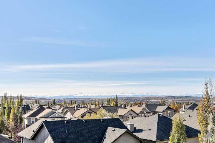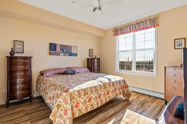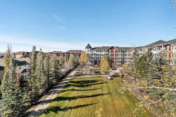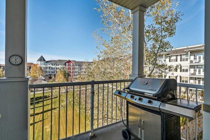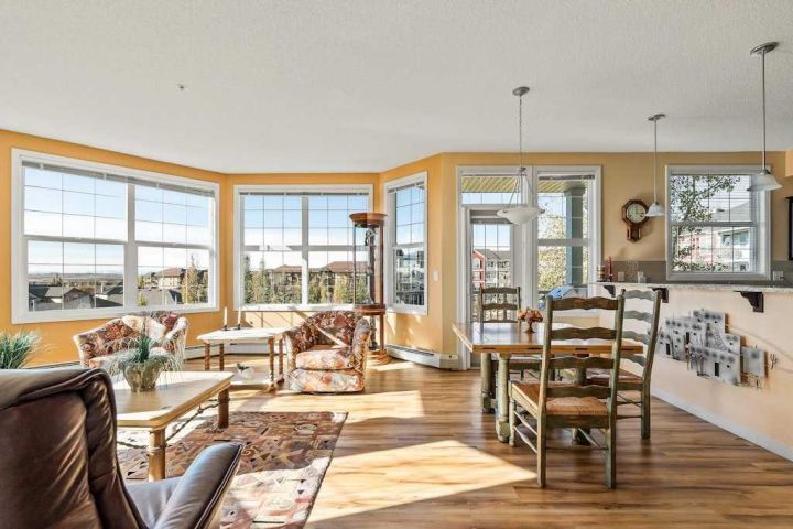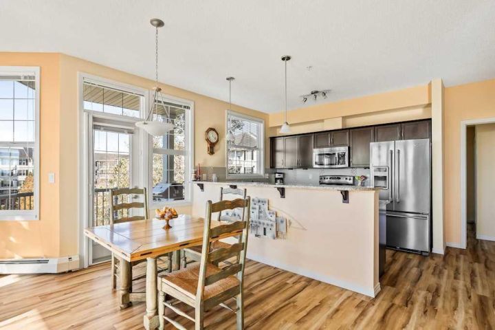Filled with natural light from its sunny South and West exposures, this oversized 2-bed, 2-bath corner unit blends quiet luxury with everyday ease. Surrounded by windows, the living room showcases beautiful mountain views and overlooks the building’s private courtyard, creating a bright and peaceful retreat all day long. The open-concept layout features elegant laminate flooring, installed in 2019, and warm tones that add a cheerful ambiance for both daily living and entertaining. The granite-topped kitchen counters pair perfectly with stainless steel appliances and espresso-stained cabinetry, offering a stylish space to cook and gather. The split-bedroom plan enhances privacy, with the serene primary suite featuring a full ensuite and walk-in closet. The spacious second bedroom includes a Murphy bed, allowing it to easily function as a guest room or home office, complemented by a second full bath nearby. Thoughtful building amenities, such as a weight room, indoor putting green, and reading lounge on each floor, elevate daily life, while two titled underground parking stalls ensure year-round convenience. HOA and lake fees provide access to the community’s lake and beach amenities. Set within a well-maintained, rarely available building near top-rated schools, convenient shopping, a golf course, and beach access, this sunlit, move-in-ready home offers an elevated Okotoks lifestyle.