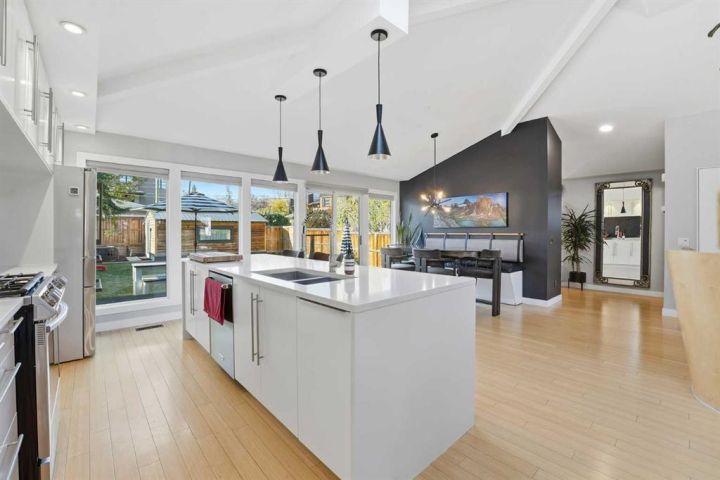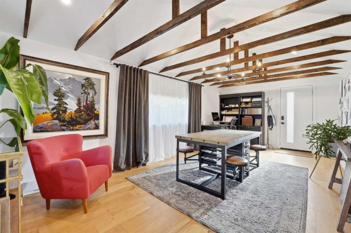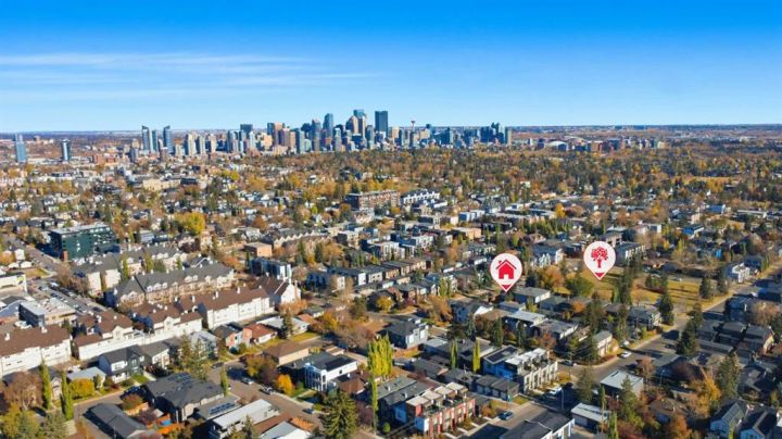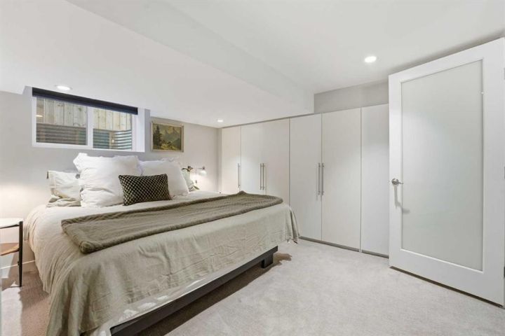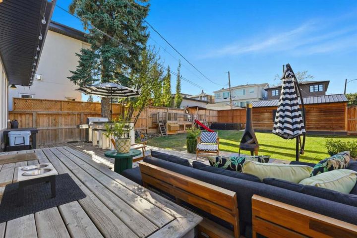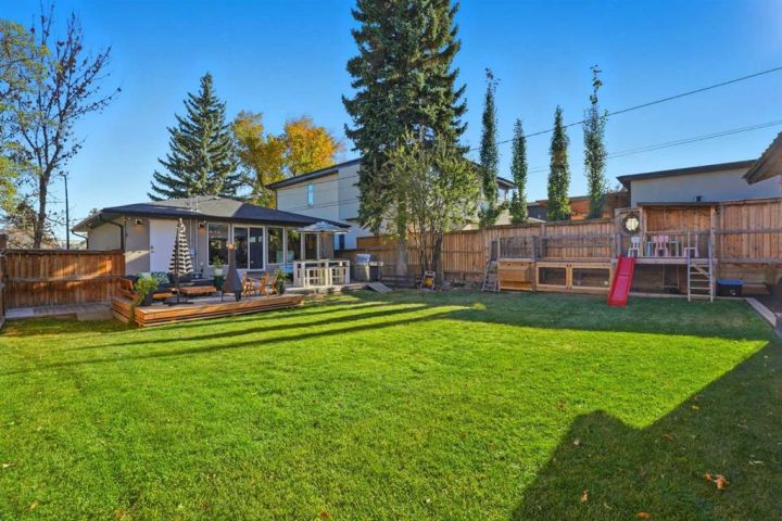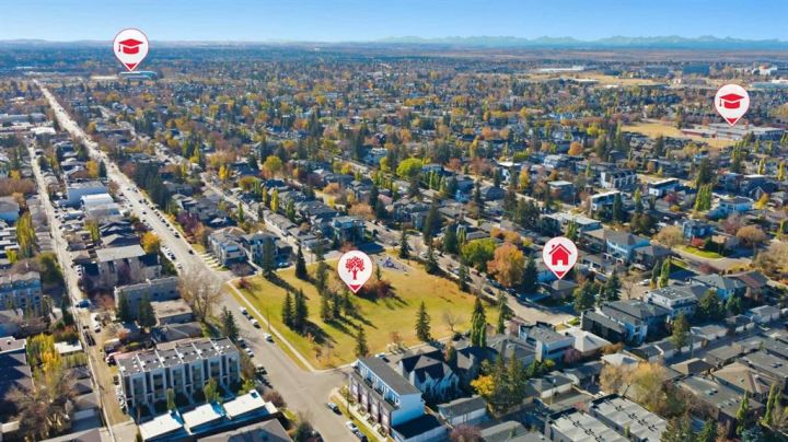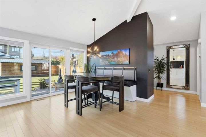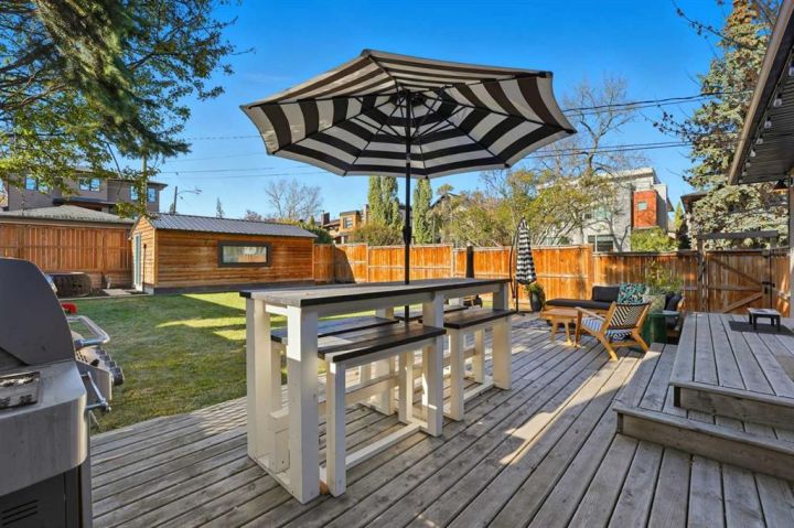 Perfectly positioned across from Kiwanis Park in Altadore, this fully renovated vaulted bungalow pairs modern design with everyday comfort. The striking curb appeal begins with a modern façade, low-maintenance landscaping and a welcoming front patio shaded by mature evergreens. Inside, soaring vaulted ceilings and sunny skylights create a bright, airy living room anchored by a gas fireplace surrounded by clever built-ins and shelving. Oversized windows capture leafy park views, while built-in speakers add ambience for relaxing or entertaining. The chef’s kitchen impresses with sleek full-height cabinetry, a designer tile backsplash, gas stove, stainless steel appliances and a waterfall-edge island perfect for casual dining or conversation. A wall of glass frames the backyard and floods the space with natural light, connecting seamlessly to the adjacent dining area where patio sliders open to the west-facing deck for effortless indoor/outdoor living. The main level continues with a showstopping creative studio featuring exposed wood beams, custom lighting and generous workspace ideal for design, art or a home office. A comfortable guest bedroom enjoys park views, complemented by a stylish powder room. Downstairs, the family-friendly layout continues with a large recreation room designed for movie and game nights. The spacious primary retreat features a built-in closet system and a luxurious ensuite with dual sinks and an oversized rain shower. Two additional bedrooms, each with large windows, share a modern 4-piece bathroom. The beautifully finished laundry area adds thoughtful function with built-in storage and folding space. Outside, a massive west-facing yard invites outdoor enjoyment with a huge deck for barbeques, lounge areas for warm weather gatherings and plenty of grassy play space for kids and pets to play. Comfort is ensured year-round with central air conditioning, on-demand hot water, a high-efficiency furnace and a water softener. Set on a corner lot within walking distance to River Park, Sandy Beach, and the boutiques and cafés of Marda Loop, this home embodies the best of Altadore living, design-forward, functional and outstandingly located! Open house Sat/Sun 12-2.