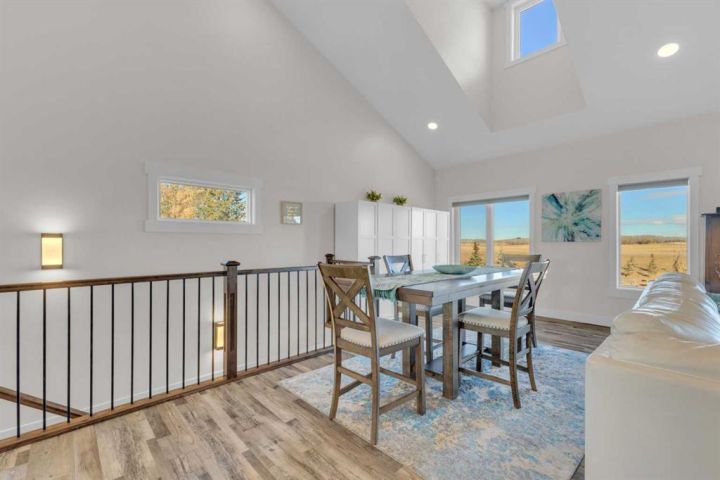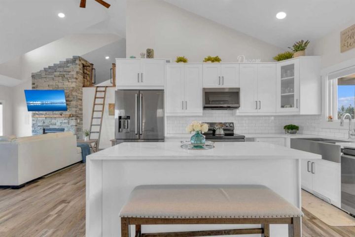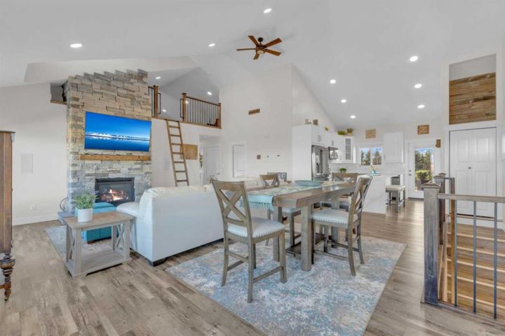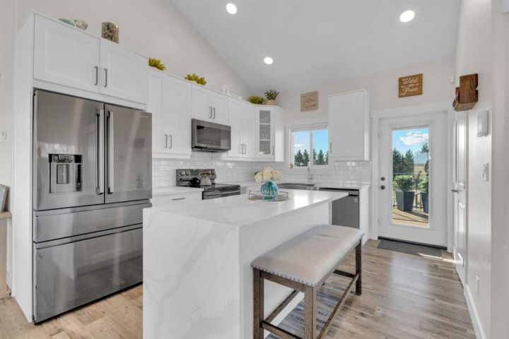 Tucked onto 3 serene acres just north of Sylvan Lake, this property gives you the rare mix of freedom, space, and connection. Downtown is just 7 minutes away, Red Deer is only 20, but it feels like a different world in Silver Springs. For anyone who lights up at the idea of a dream garage, this one’s something else. Heated by gas or the wood stove, with 13-foot ceilings, drive-through doors, a half bath and nearly 1,300 square feet to play with, it’s more than a garage. It’s a shop, a retreat, a space to build, fix, create, workout or just hang out. Upstairs, the home is a pinch of country, but heavy on luxury. Think wide-open spaces, vaulted ceilings, skylit dormers, and a show-stopping stone fireplace. The kitchen pops with white cabinetry, quartz waterfall counters and sleek black stainless appliances. From the main living area, step onto the composite deck and breathe in the Southwestern view of treetops, big skies, and glimpses of the lake. The primary suite is its own little hideaway, complete with a walk-in closet, makeup desk, four-piece ensuite, and a private patio perfect for morning coffee or an evening nightcap. Two more bright bedrooms and a stylish main bath with stand-alone tub and separate shower offer comfort for kids or guests. If the adults all have their space, then the upper loft is the ultimate kid zone, ideal for a playroom, homework space or sleepovers. Outside, everything has its place. Three matching sheds, RV parking with power, a firepit by the seasonal pond, and mature spruce trees that offer shelter and privacy, but could open up for even more of that lake view. This home is loaded with thoughtful extras: central A/C, water softener, central vac, outdoor shower, Sonos system, smart lighting, plugs, thermostats, all the little things that make life smoother and more connected. A paved road leads you straight to the property, making every drive in feel like a breath of fresh air. Whether you're a young couple, a hands-on creator, or someone craving more sky and stillness, this home isn't just about square footage, it's about breathing room, balance, and the kind of place that sparks inspiration.