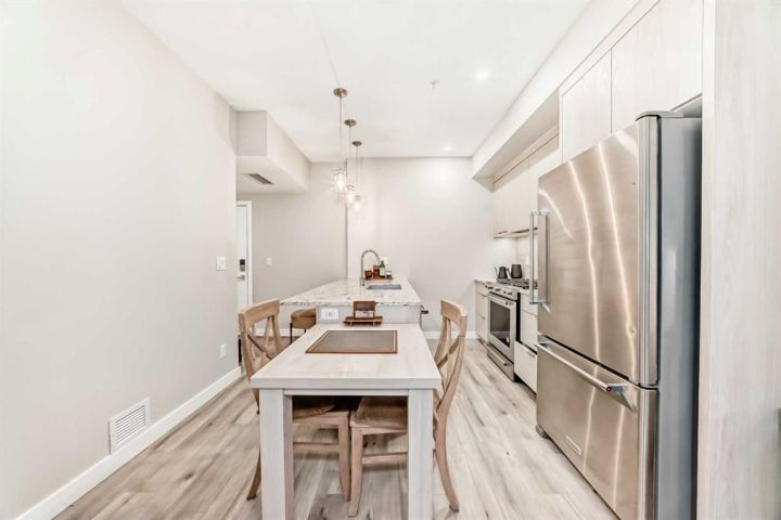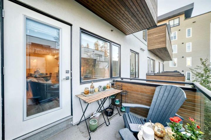 Open House Saturday 25 from 2-4:30pm. Welcome to The COCO, your pet-friendly slice of accessible luxury in the vibrant heart of Marda Loop! This stunning one-bedroom, one-bath condo feels like new and is packed with thoughtful upgrades that make everyday living a breeze. Step inside this 538sq ft third floor gem and discover a bright, open space with 9-foot ceilings, gorgeous laminate flooring, and a peaceful vibe that instantly feels like home. The modern kitchen is a showstopper—perfect for foodies or casual cooks alike. Whip up meals with ease using the stainless steel gas stove with convection oven, spacious fridge with bottom freezer, and sleek quartz countertops accented by a chic chevron-patterned backsplash. Full-height cabinets with soft-close features and a built-in dining table make this space as functional as it is stylish. Unwind in the cozy bedroom, complete with plush carpeting and room for a queen-sized bed. The walk-in closet flows seamlessly into the gleaming 4-piece bathroom, featuring ceramic tile, quartz counters, and a tiled tub/shower combo. A full-size washer and dryer are included, keeping chores simple and convenient. Step outside to your private balcony, a serene retreat overlooking a lush, tree-filled courtyard—perfect for morning coffee or evening barbecues with the handy gas line. Despite being steps from Marda Loop’s bustling shops and restaurants, this unit feels like a quiet oasis. The COCO elevates condo living with fantastic amenities: stay cool with central air conditioning, park effortlessly in your titled, heated underground spot (with underground visitor parking available too), and store your gear in a secure locker or bike room. Got a furry friend? The indoor dog wash station and nearby parks make this a pet lover’s paradise. Need space for guests? Rent the building’s guest suite instead of paying for an extra bedroom you rarely use! Stay active in the private yoga/workout flex space, and enjoy the convenience of a water bottle filling station. With fob-access entry, you’ll feel safe and secure in this tight-knit community. Plus, low condo fees cover heat, water, A/C, and more! Living in Marda Loop is a lifestyle like no other. With over 190 shops, restaurants, and services just a short stroll away, you’re at the heart of Southwest Calgary’s walkable, vibrant scene. Transit is nearby, and downtown is easily accessible. Whether you’re grabbing coffee, dining out, or exploring local boutiques, everything you need is at your doorstep. Priced to sell and move-in ready, this condo is your chance to own a piece of Marda Loop magic. Come see it for yourself at the open house or book a private tour today!