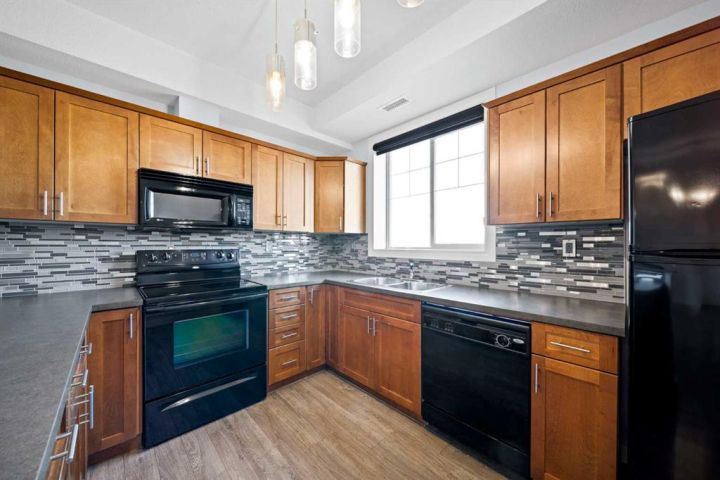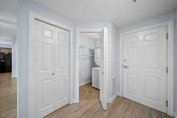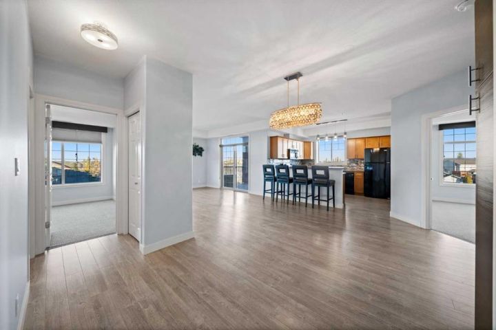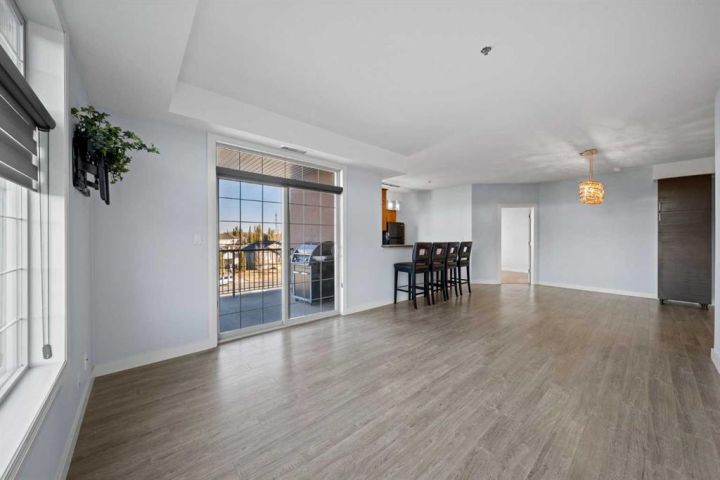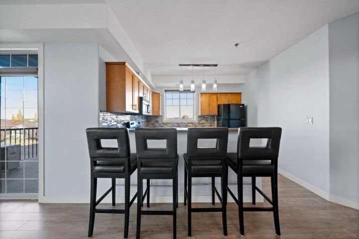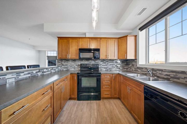 Welcome home to this bright and stylish 1,023 sq ft condo featuring 2 bedrooms and 2 full bathrooms. The open-concept layout is perfect for entertaining, with a spacious kitchen offering plenty of cabinetry, a raised breakfast bar, and a glass tile backsplash that adds a modern touch. The primary bedroom includes a walk-in closet and a 4-piece ensuite. The unit has just been freshly painted in a warm, neutral tone, creating a fresh and inviting feel throughout. Enjoy the covered west-facing balcony complete with a BBQ gas line—ideal for relaxing or hosting friends. Additional highlights include a high-end lighting package, large stand up storage unit with pull out drawers, glass tile accents in both bathrooms, and two assigned parking stalls—one underground and one surface stall. Conveniently located close to shopping, restaurants, walking paths, and with easy access in and out of the city, this home offers both comfort and convenience!