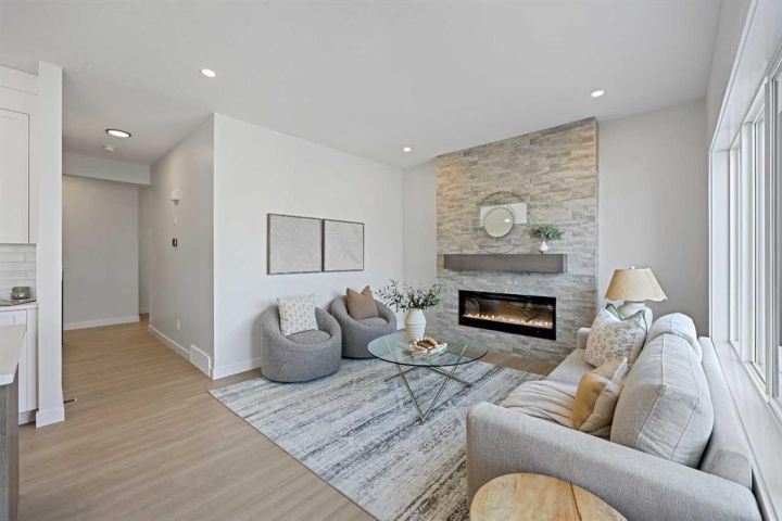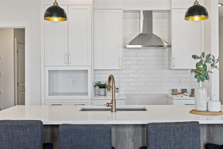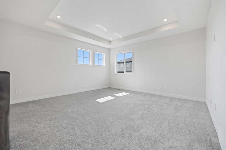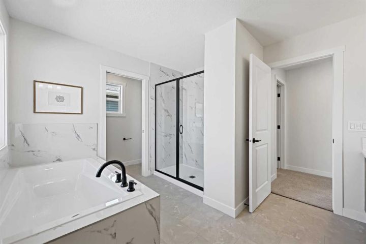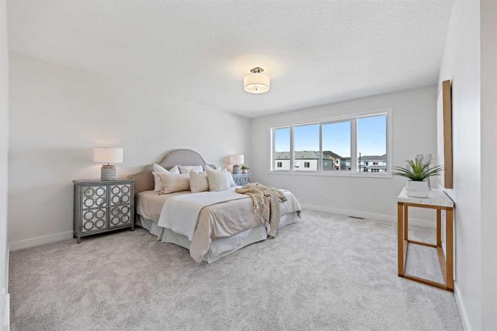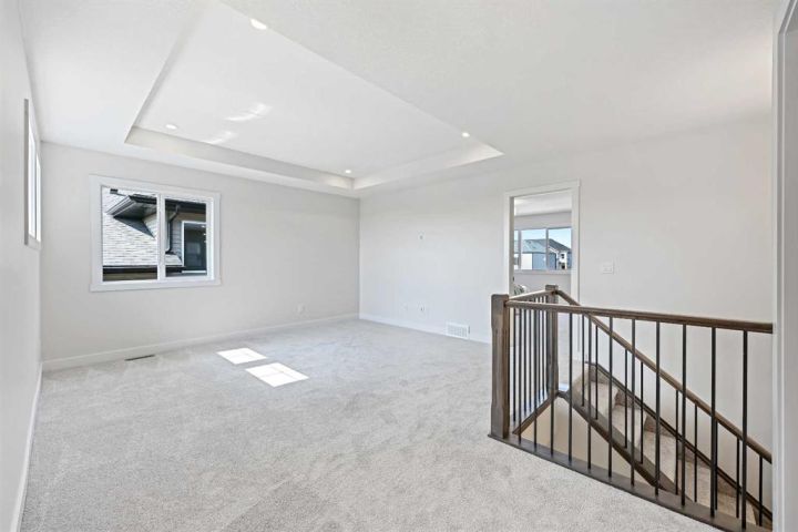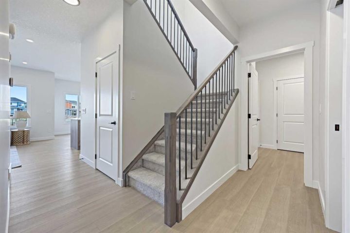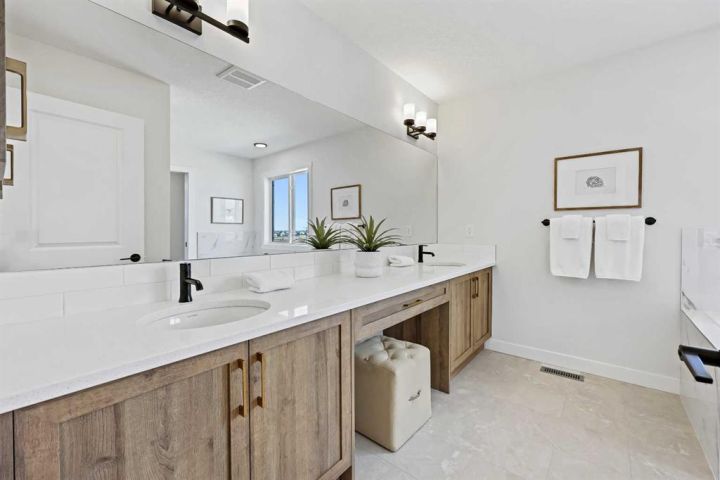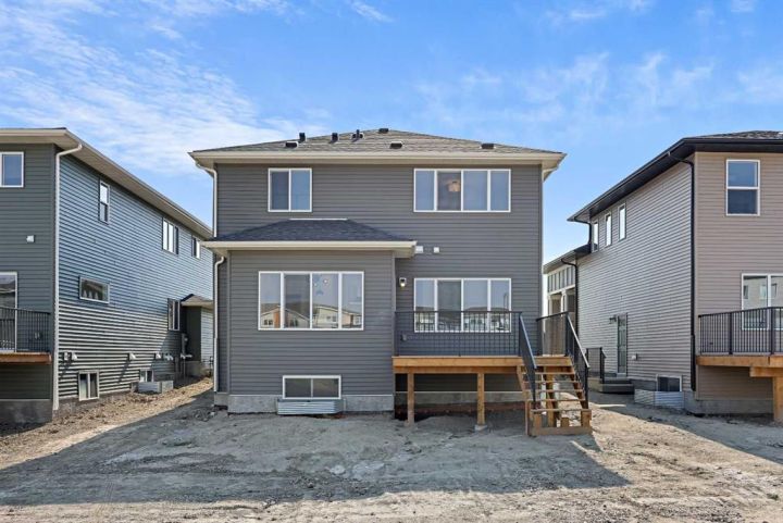 Genesis Builders presents the Ashdale, a thoughtfully designed 3 bedroom 2.5 bathroom home offering more than 2200 square feet along with a main floor office. Stepping inside, you are greeted by the warm ambiance of neutral tones and airy 9' ceilings. The luxury vinyl plank flooring guides you through the open concept main floor living space. The heart of the home is the chef’s kitchen with cabinetry finished in chantilly lace, accented by black and gold hardware, a wood grain island, a glossy white herringbone tile backsplash, and bright quartz countertops paired with a stainless steel appliance package. The open concept living area offers a generous dining room that flows into the living room and provides access to the north backyard where you will enjoy sunny evenings and beautiful sunsets. A stone faced feature fireplace anchors the living room and adds warmth and style. Complimenting the main floor is a private office, a powder room, and a convenient walk through pantry from the mudroom that connects to the double attached garage. Upstairs, a central bonus room with a tray ceiling greets you and separates the primary bedroom from the second and third bedrooms. The primary bedroom is a spacious retreat with an ensuite bathroom that includes double sinks, an oversized tiled shower, and a large walk in closet. The additional bedrooms are generous in size and function perfectly for kids or guests. A beautifully finished full bathroom and a laundry room complete this floor. The basement is a blank canvas with upgraded 9' ceilings and awaits your design ideas. Situated in the desirable bayview community, this family friendly neighborhood offers endless ways to get outside. You are steps from Nose Creek Elementary School, the pathways that wind along the scenic canals, a new playground, and so much more. *Area size was calculated by applying the RMS to the blueprints provided by the builder. Photos are representative colors and finishes may vary.