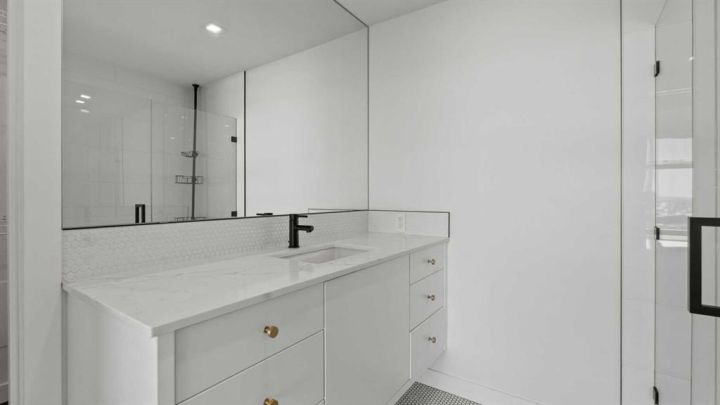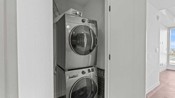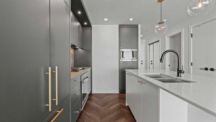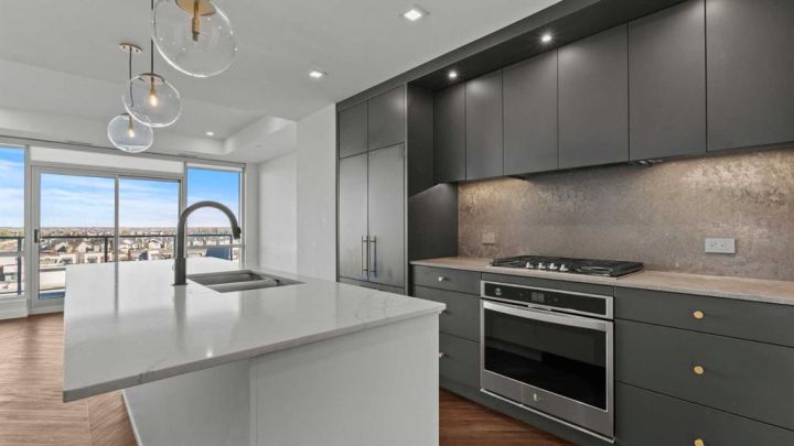 Welcome to Gateway by Truman in Calgary’s premier West District—where modern design meets urban convenience. This beautifully designed 2-bedroom, 2-bath condo offers 756 sq. ft. of elegant living space plus a private balcony off the living area, perfect for relaxing or entertaining outdoors. Step inside to an open-concept layout featuring a stunning designer kitchen with quartz countertops, full-height cabinetry, and built-in appliances that blend seamlessly into the space. The spacious living room flows naturally onto the balcony, allowing abundant natural light through large windows. The primary suite offers a walk-in closet and a luxurious 3-piece ensuite, while the second bedroom is ideal for guests or a home office, paired with a full 4-piece bathroom. Enjoy the comfort of air conditioning, in-suite laundry, and underground titled parking. The building also features an impressive lobby, retail shops on the main level, and nearby amenities including restaurants, grocery stores, and fitness studios—all just steps away. Situated in one of Calgary’s most sought-after communities, this condo delivers the perfect balance of lifestyle, luxury, and location—just minutes from downtown and surrounded by parks, pathways, and mountain views.