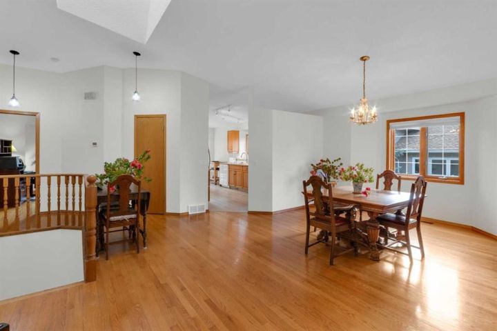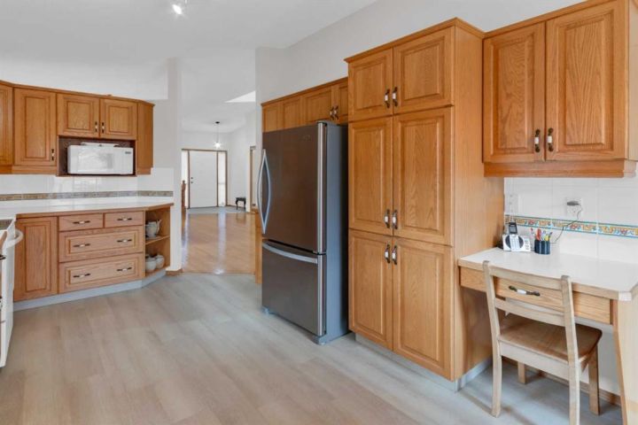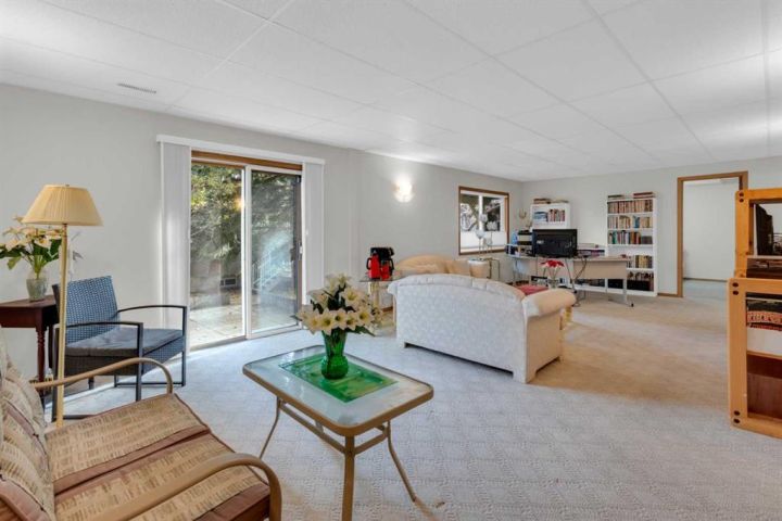 Over 2800 sq.ft. of developed living space in this exceptionally private, vaulted, walkout, villa style home in an amazing location! You will love the light airy feel of vaulted ceilings in the spacious main floor living, dining, kitchen, den/office, and bedroom areas. This surprisingly bright end unit walkout bungalow has sunlight spilling in all day from skylights plus large windows on 3 sides - south, west and east. Freshly painted in neutral designer colours throughout (Oct 2025) with vinyl plank flooring updates accenting hardwood floors in large functional living area with gas fireplace, dining and den areas. Enjoy sunrise coffees and cool evenings on the peaceful secluded and extended deck surrounded by birdsong in mature flowering trees. A big main level den or sitting room connected to a fresh white kitchen with a south facing box window which adds light to an already bright space. Generous walkout level family room with oversize windows and sliding doors to a private patio. Also features a large bedroom with adjacent full bath, plus 2 flex rooms and loads of storage. New HE furnace & HW tank, 2019. (NOTE: All the “Poly B” pipes have been replaced). Super convenient location - imagine walking literally just 1 block to Sunterra West Market Square, the L.R.T., coffee shops, pubs, and restaurants. Also close to natural ravine walking paths, dog parks & bike paths. Easy access to major commuting routes including Sarcee trail and the SW Ring Road. Click on 3D for interactive floorplans. Just move in, relax, and enjoy your easy care, lock and leave lifestyle!