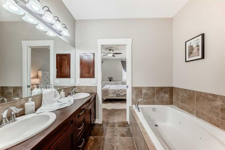 160 Sienna Passage! Welcome to your dream home in the heart of Rainbow Falls! This stunning bungalow style villa backs directly onto a tranquil canal, offering peaceful views and a lifestyle of comfort and elegance. With a total of three Bedrooms, 2.5 bathrooms and over 2,600 Sq Ft of living space, this property is not to be missed! Step inside to discover an open-concept layout with gleaming hardwood floors along with an abundant of natural light throughout! The spacious living room features a cozy two-way fireplace and overlooks mature trees and the serene canal, perfect for relaxing evenings or entertaining guests! Main Floor highlights include a versatile flex room ideal for a home office, formal dining room for hosting family gatherings and a bright breakfast nook with ample space for your table! The primary bedroom will hold all of your furniture including your king bed! The primary ensuite boasts dual sinks, a jetted tub, an oversized shower & large walk-in closet! There is convenient main floor laundry with its own handy utility sink and the two piece powder room completes this main floor! The fully developed walk out basement features a large rec room complete with its own entertainment area! There are two generously sized bedrooms, a full bathroom and storage room with an additional utility sink! Recent Upgrades Include: A New kitchen faucet, garburator & pantry enhancements with additional racks and motion sensor lighting! There is upgraded light fixtures throughout including staircase lighting, dimmer switches plus upgraded window coverings! Fresh neutral paint throughout, new shower heads in two of the bathrooms along with a water softener! Updated garage door opener & keypad! This immaculate home also features central air and offers the perfect blend of luxury, functionality, and location. Whether you're downsizing, upsizing, or simply seeking a peaceful retreat, 160 Sienna Passage is not to be missed! The monthly condo fee covers snow removal, landscaping and exterior maintenance! Schedule your private showing today and experience the charm of canal side living in Chestermere!