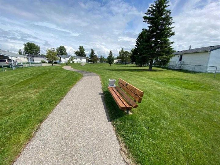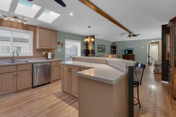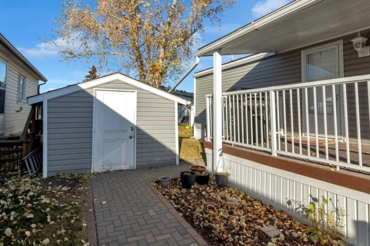 Welcome to this great mobile home in Watergrove, the premiere 45+ mobile home park in Calgary, boasting a fabulous clubhouse, outdoor pool, sauna, recreation room/party room, pool tables, and enough activities to keep you busy every single day! This 3 bed, 2 bath home with central A/C has been lovingly cared for and it shows. The spacious kitchen has a large breakfast bar, a generous amount of cabinetry, stainless appliances, a large dining area, and a skylight to bring in the sunshine. The living room easily accommodates a variety of furniture options and is accented by a vaulted beamed ceiling. This open floorplan offers two bedrooms and a full bath at this end of the home, with the large primary bedroom at the opposite end. The primary bedroom has a 4 pce ensuite and a large walk-in closet. This home has had many upgrades throughout the years as follows: 2016 hot water tank, new chimney replacement, 2017 new siding, skirting, asphalt application on the driveway and relevelled, 2018 Removal of Poly B to Pex waterlines, and a brick pathway to the shed. 2019 roof upgrade (repair and replace new shingles as required), skylights, deck expansion with roof addition. This home has modern touches with wide-plank laminate flooring, a spacious foyer, and a large living room window to bring in natural light, giving a bright, spacious feel. Located in a great location, with lovely curb appeal, close to the greenspace, and in an amenity filled community – this home is just waiting for its new owner. Nearby Crowfoot Centre provides every amenity you can imagine. Immediate possession available. Lot fee of $860 includes water/sewer, garbage pickup and recycling. Lease and pet approval is required.