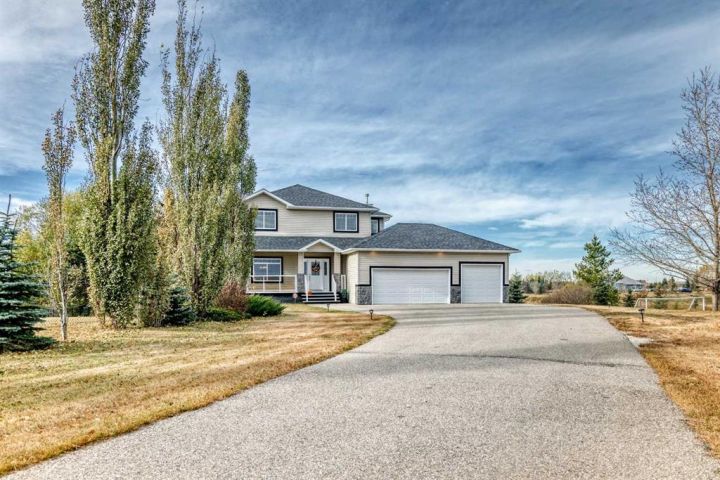 Welcome to this immaculate estate home in the highly sought-after community of Sharp Hill, where pride of ownership and quality craftsmanship shine throughout. Perfectly positioned on 2 private acres surrounded by mature trees and natural beauty, this property offers the ideal blend of peace, privacy, and convenience — just minutes from both Airdrie and Calgary. From the moment you arrive, the long, private driveway and exceptional curb appeal set the tone for this stunning residence. Spotless in every way and truly better than new, this home offers over 3,300 square feet of developed living space, thoughtfully designed for comfort and function. Step inside to an inviting, bright open-concept main floor with expansive windows that fill the home with natural light and showcase tranquil acreage views. The huge kitchen is the heart of the home, featuring newer solid surface countertops, abundant cabinetry, a large island, and plenty of prep space for the family chef. Adjoining the kitchen is a spacious breakfast nook, perfect for casual dining and morning coffee, while the formal dining room — a rare find in today’s newer builds — provides an elegant space for entertaining guests and hosting special occasions. The home includes five spacious bedrooms, including a relaxing primary retreat, and a fully developed walkout basement that extends your living space with room for a recreation area, media room, gym, or guest room. Large windows and a walkout patio invite natural light and connect you to the beautiful, tree-lined property beyond. Car lovers and outdoor enthusiasts will appreciate the triple car garage with one oversized garage door, ideal for trucks and larger vehicles, plus ample parking for all your toys — RVs, boats, trailers, and more — with space to spare. Every detail of this property has been carefully maintained and upgraded, offering a truly move-in-ready home that blends luxury, livability, and the charm of country life. If you’ve been searching for the perfect mix of acreage lifestyle, modern comfort, and unbeatable location, this Sharp Hill gem is the one you’ve been waiting for.