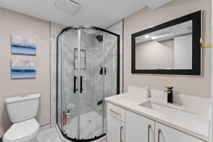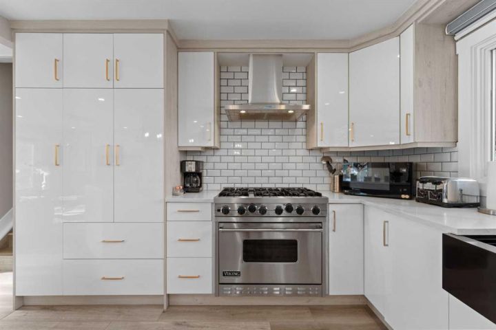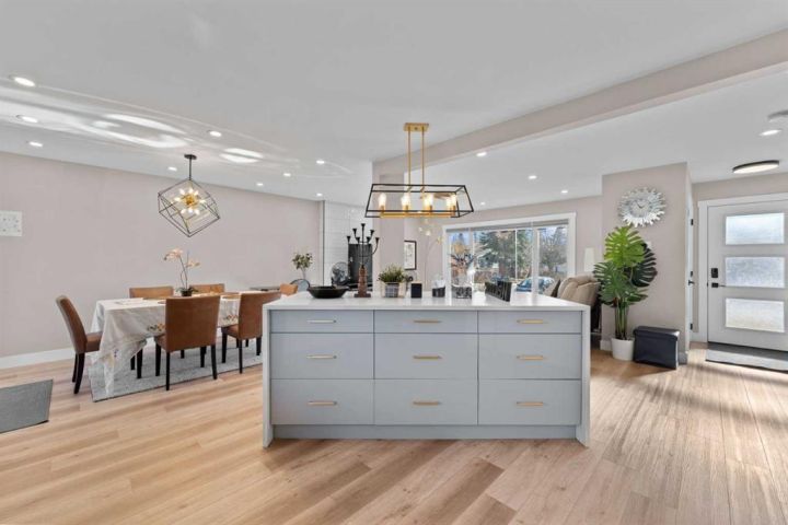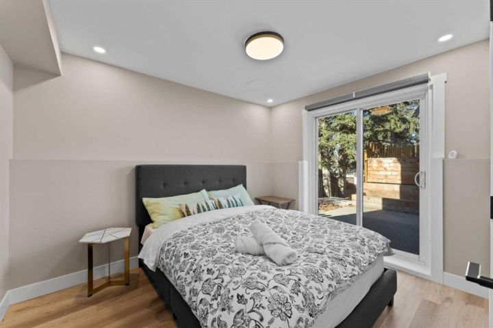 Welcome to this beautifully renovated 5-bedroom, 4-bathroom detached 4-level split offering nearly 2,500 sq. ft. of modern living space on a 7,200 sq. ft. south-facing corner lot overlooking a peaceful green space. This home has been completely remodeled and updated from top to bottom with high-end renovations in the last few years — a perfect blend of elegance, function, and comfort. Enjoy walking distance to Market Mall, U of C, Alberta Children’s Hospital, University District, Brentwood C-Train Station, and many green space/ parks. Families will appreciate the proximity to Sir Winston Churchill High, Marion Carson Elementary, F.E. Osborne Junior High, and St. Vincent de Paul Elementary. Inside, you’ll find a bright open-concept layout with LVP flooring, LED lighting, and modern finishes throughout. The chef-inspired kitchen features custom white cabinetry, quartz countertops, farmhouse sink, and premium appliances including a Viking 36” gas range, Sub-Zero 42” built-in refrigerator, and Fisher & Paykel dishwasher drawers. A cozy modern fireplace anchors the living room and creates an inviting atmosphere. The primary bedroom offers over 300 sq. ft. with a walk-in closet and a luxurious 5-pc ensuite featuring a tiled shower with massage jets, double vessel sinks, heated mirrors, and a deep soaker tub. A second bedroom and 4-pc bath complete the upper level. The third level includes a wet bar with wine cooler and washer/dryer, spacious family room /bedroom with Valor gas fireplace, office/4th bedroom with patio doors, and another full bath. The basement level features a large bedroom with walk-in closet, 3-pc bath, laundry area with Samsung smart washer & dryer, and a kitchenette with eating area (240V electrical outlet installed, ready for a future full stove). Major upgrades also include PEX plumbing, 200-amp electrical service, tankless hot water, high-efficiency furnace, and NEST thermostat. The oversized 24’x24’ garage is insulated and drywalled with 240V power (EV ready), gas line, and rooftop deck for private outdoor enjoyment. Professional landscaping features additional topsoil, drought-resistant sod, and a Wi-Fi-controlled irrigation system. The unique elevated backyard offers excellent potential for future walk-out basement development, either within the existing structure or in a future higher-storey rebuild, or for a garden / back-lane home — a rare-find opportunity in this area. Two decks, a patio, and large open yard complete the outdoor space. This exceptional property offers unbeatable location, luxury, and value — a true move-in ready gem in Calgary’s northwest!