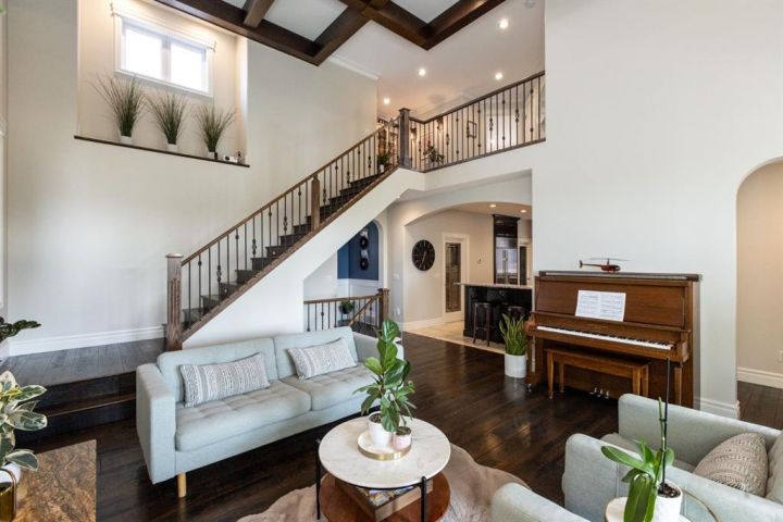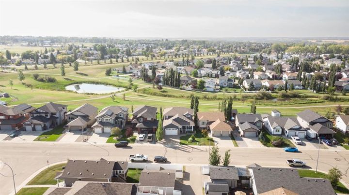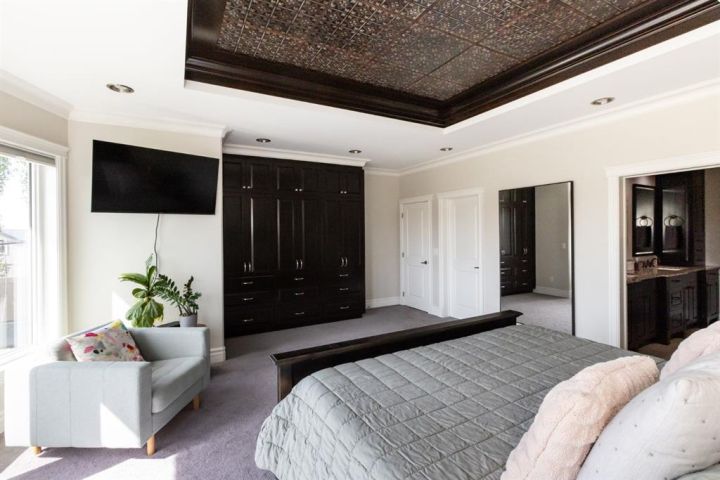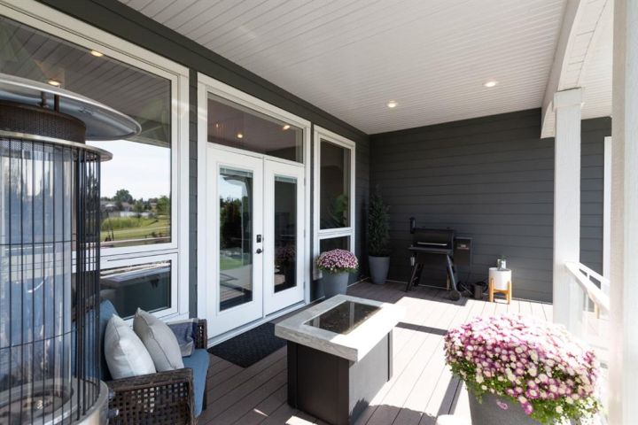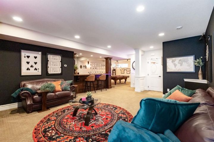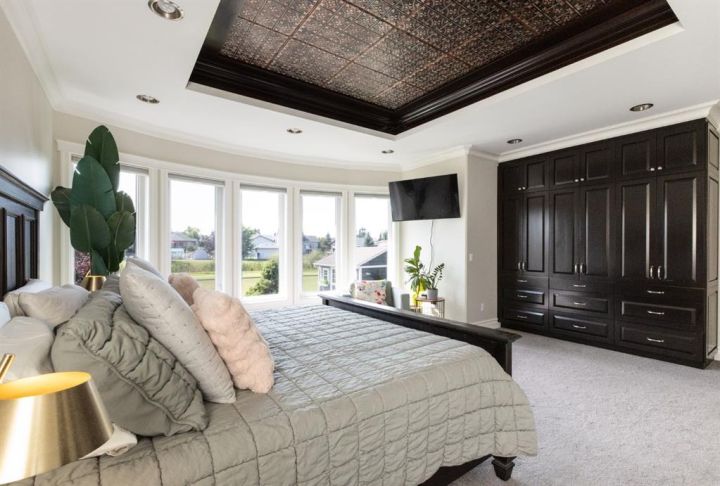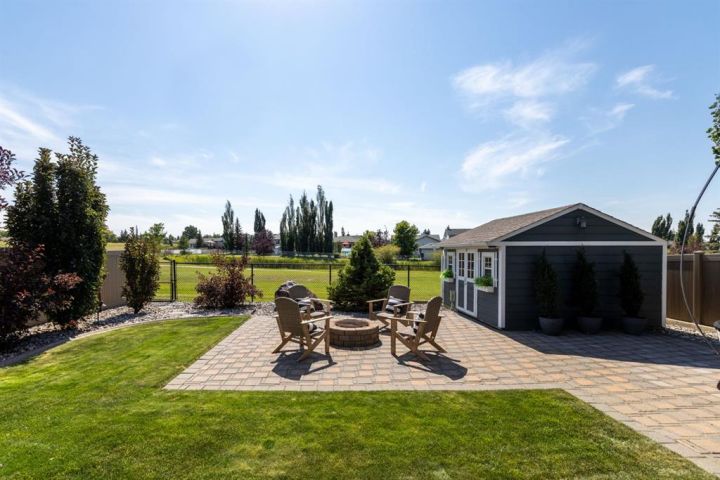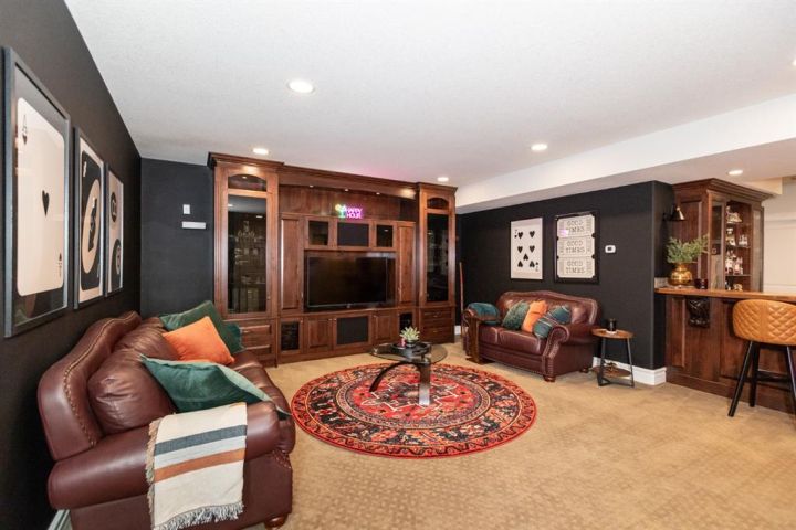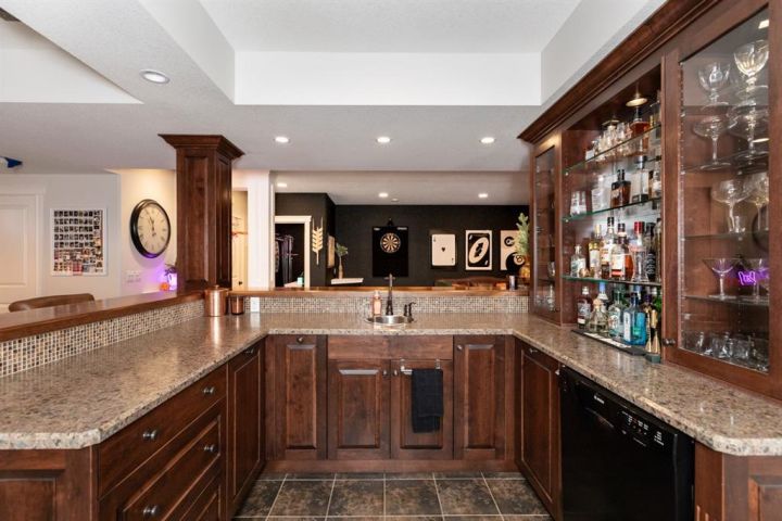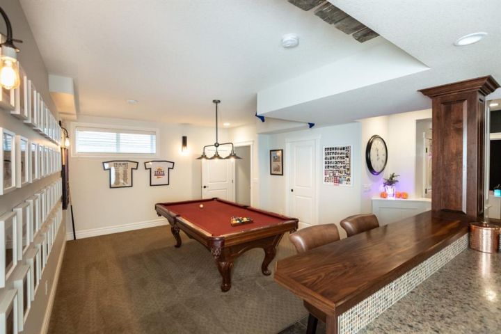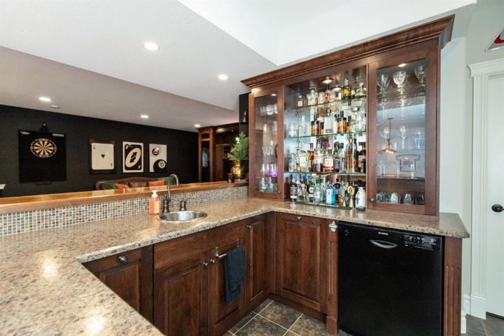 This Home Isn’t Just a House — It’s a Lifestyle. Attention to detail is evident the moment you walk through the stained glass front door. From top to bottom, this Bomaier Custom-Built Home radiates quality, warmth, and timeless elegance. Designed with connection and comfort in mind, this 5-bedroom, 5-bathroom home is where family gathers, friends linger, and memories are made. Step inside to soaring 18-foot ceilings and a breathtaking floor-to-ceiling stone fireplace with a granite hearth and an exotic African Bubinga hardwood mantle — a stunning center-piece that immediately sets the tone. The open-concept main level flows effortlessly into a traditional dining room framed with classic wainscoting walls, creating an inviting space for both elegant dinners and relaxed family meals. The kitchen is every chef’s dream, designed with entertaining and everyday living in mind. It features a double-oven six-burner Heartland stainless steel gas stove, a Sub-Zero side-by-side stainless steel fridge, granite countertops, a walk-in pantry, and a spacious breakfast bar — all surrounded by exceptional craftsmanship and finishes. The primary suite, conveniently located on the main floor, is a luxurious retreat overlooking the backyard and neighbourhood pond. It features a generous walk-in closet and a spa-inspired 4-piece ensuite complete with a large walk-in shower, double vanities, and in-floor heating for year-round comfort. Downstairs, the home continues to impress with a stunning Black Walnut bar and billiard room — the ultimate space for entertaining or unwinding. The lower level also includes a Bosch dishwasher, a second fridge, and plenty of room for a home gym, movie area, or guest accommodations. Every inch of this property showcases thoughtful updates and premium details. Gemstone lighting was added in 2022, along with a new hot water tank. The garage was upgraded with a forced-air heater in 2025 and new garage door windows in 2024. Enhanced insulation in all floors and walls boosts efficiency, comfort and a calm, quiet atmosphere. The extra-wide staircases, complete with lighting in the risers, add both grandeur and practicality. Outside, the backyard oasis offers tranquility and style with a rock water feature, timed landscape lighting, and irrigation in both the front and back yards. The yard is also wired for a hot tub, with the circuit breaker already installed in the shed. Additional features include central vacuum, ample parking across the street, and in-floor heating in the kitchen, bathrooms, ensuite, and basement. All appliances are included — from the Sub-Zero fridge to the Bosch dishwashers — and the pool table remains. Gym equipment and furniture are negotiable to make this beautiful home truly move-in ready. From the craftsmanship to the comforts, every detail has been designed to impress. This is more than a house — it’s a lifestyle of elegance, warmth, and connection, ready to welcome its next chapter.