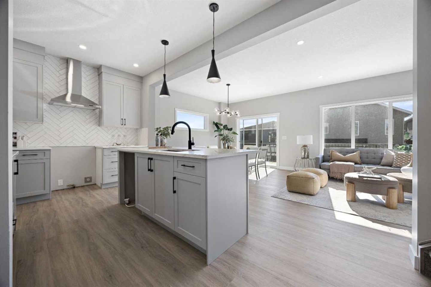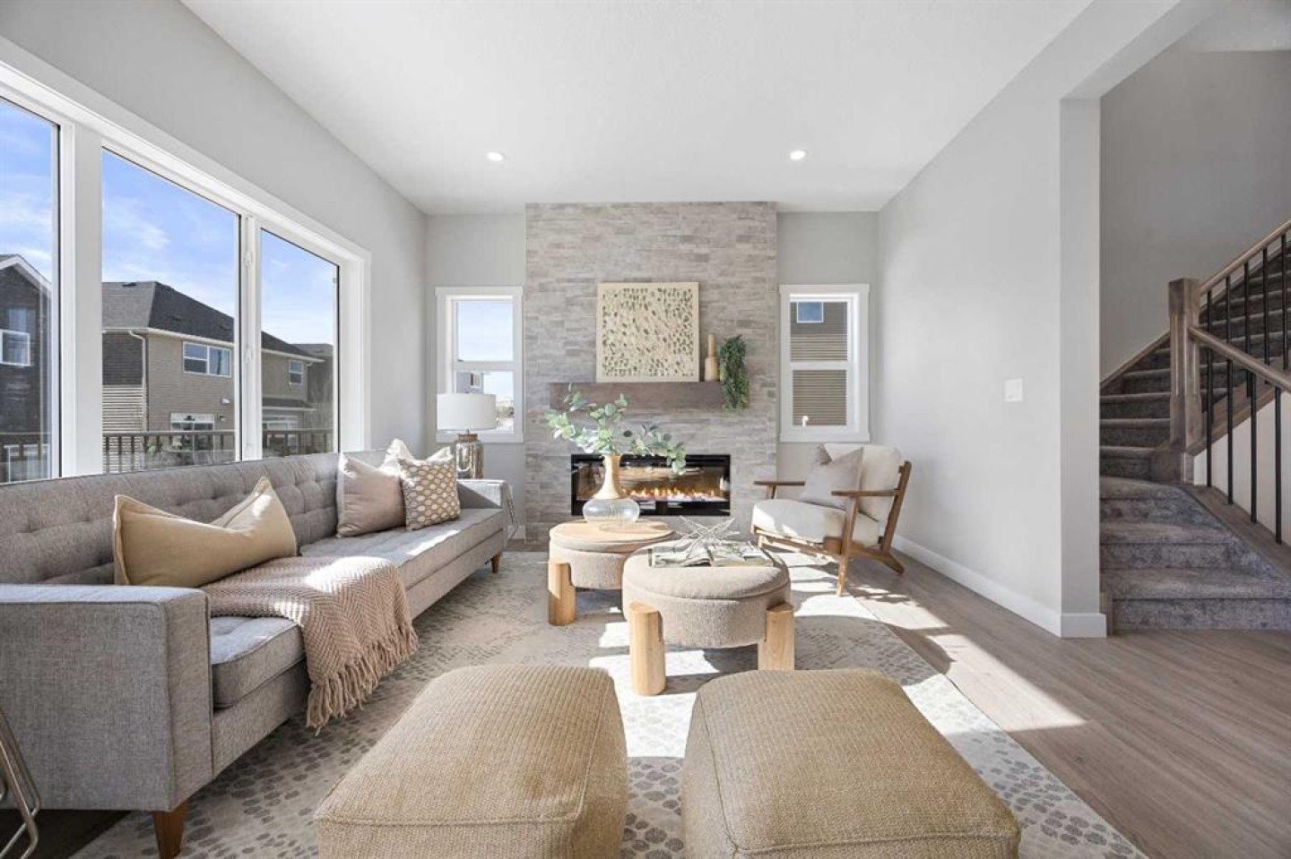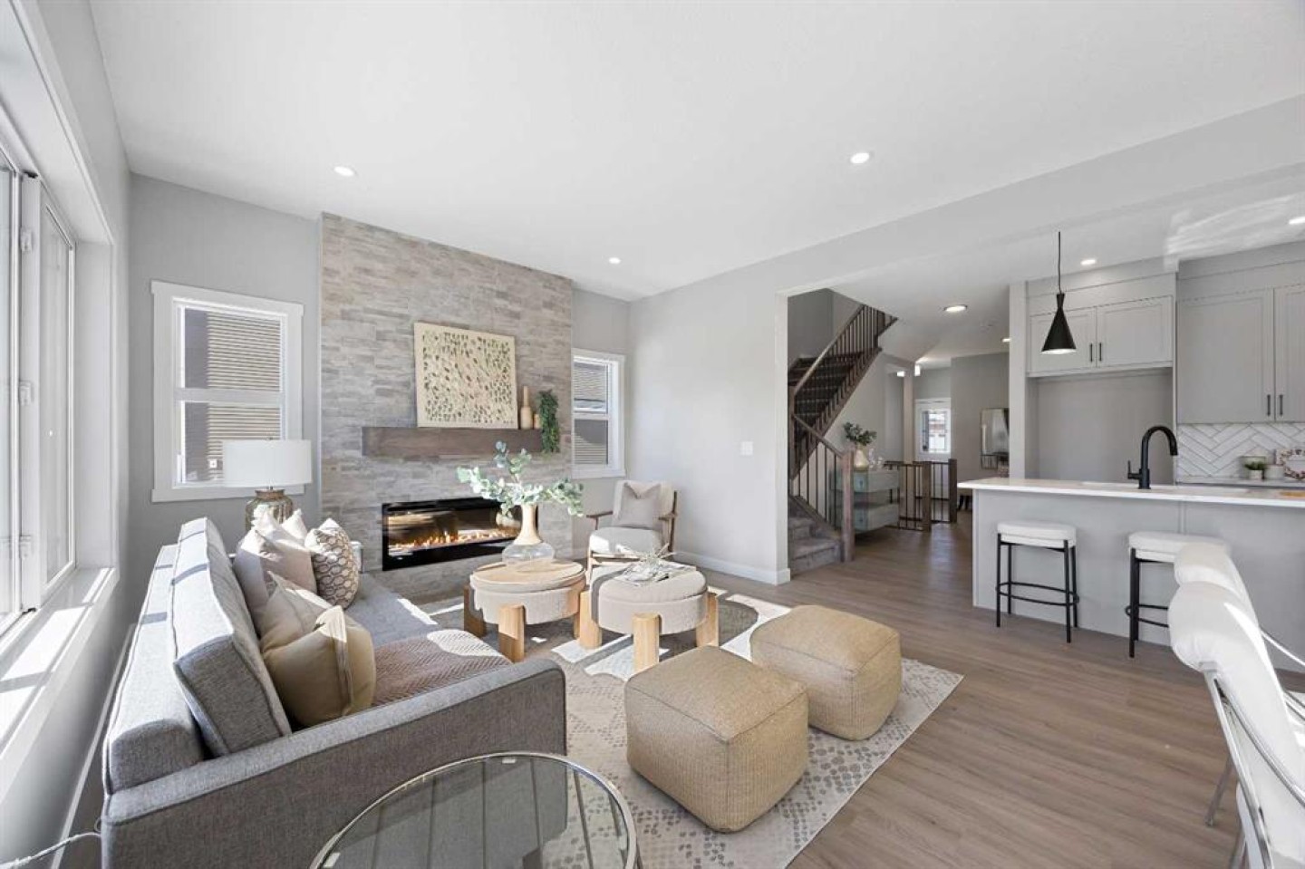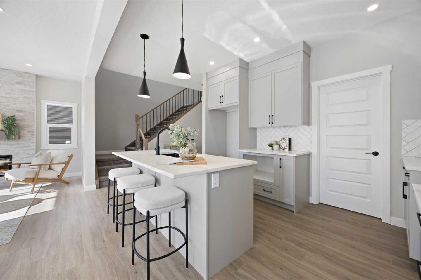 Welcome to 1414 Bayview Crescent, a beautifully designed 3-bedroom, 2.5 bathroom WALKOUT home with sunny south backyard exposure that floods the home with natural light. Step inside to a bright, inviting main floor featuring luxury vinyl plank flooring that spans the entire level and is complemented by 9-foot ceilings. The chef's kitchen showcases sleek grey cabinetry with stylish black hardware, paired with a crisp white tile backsplash, elegant quartz countertops, and stainless steel appliances. A convenient gas line is already installed, should you wish to upgrade to a gas range. The living room features a stunning floor-to-ceiling tiled feature wall, creating a beautiful focal point. Adjacent to the living space, the dining area is ideal for entertaining and flows seamlessly to the outdoors. Extend your living space to the outdoors and enjoy warm summer days on the full-width deck. Completing the main floor are a practical mudroom just off the double-attached garage, a spacious pantry, and a convenient powder room. Upstairs, you'll find a central bonus room that provides separation between the primary suite and the secondary bedrooms, offering both comfort and privacy. The primary retreat is generously sized and features a spa-inspired ensuite with dual sinks, a relaxing soaker tub, and an oversized shower, as well as a truly impressive walk-in closet. A full bathroom complements two additional well-sized bedrooms, while the upstairs laundry room adds everyday convenience. The unfinished walkout basement, with 9-foot ceilings, offers a blank canvas for your future development ideas.