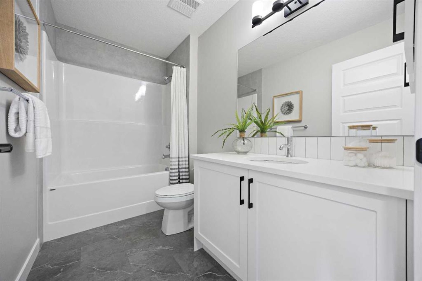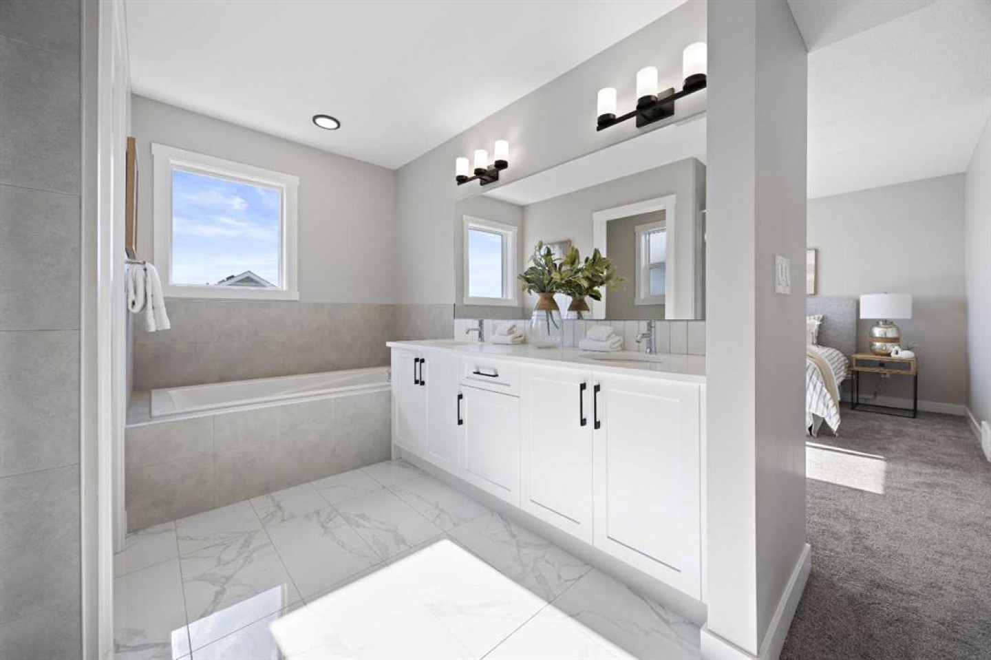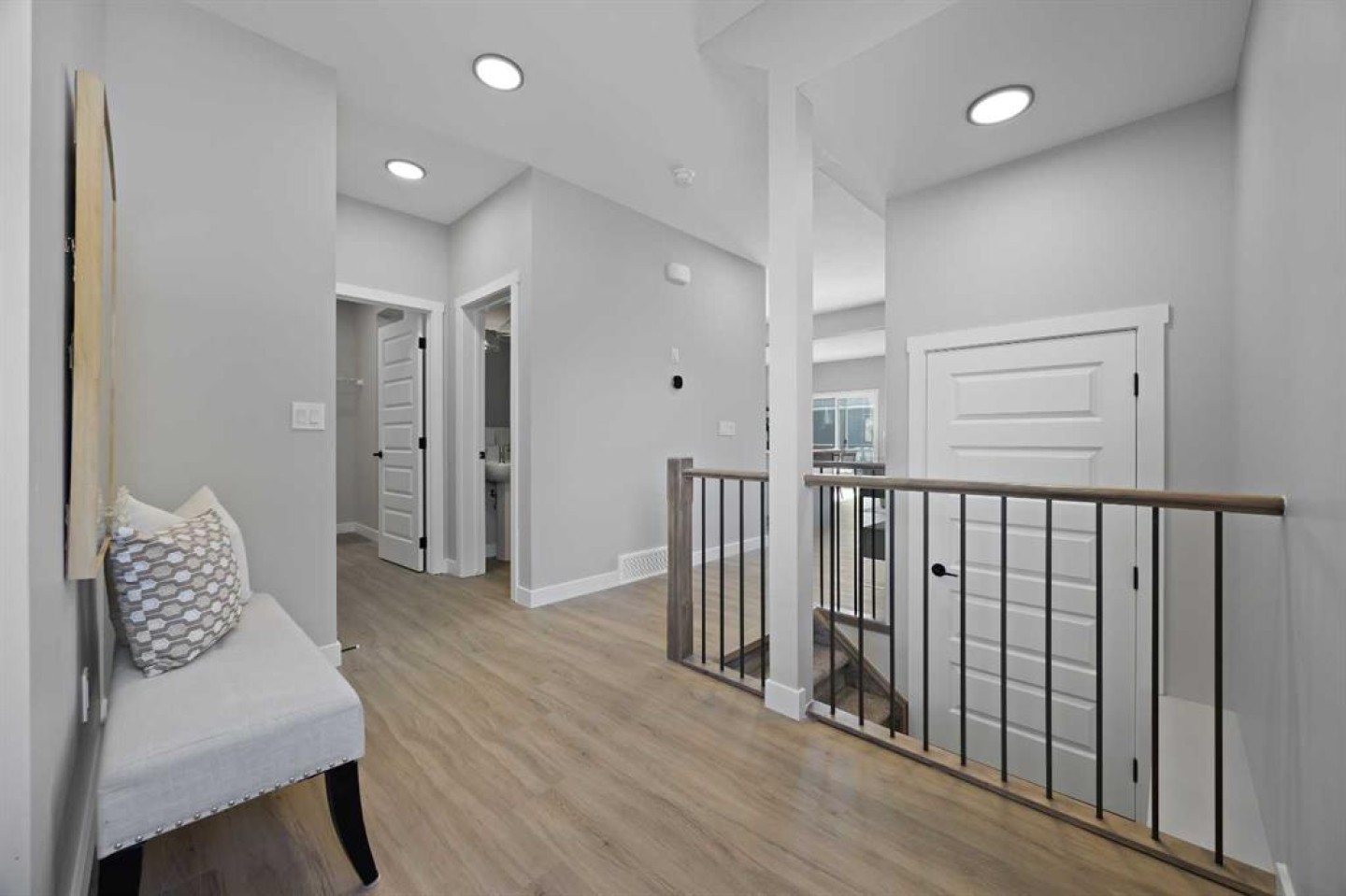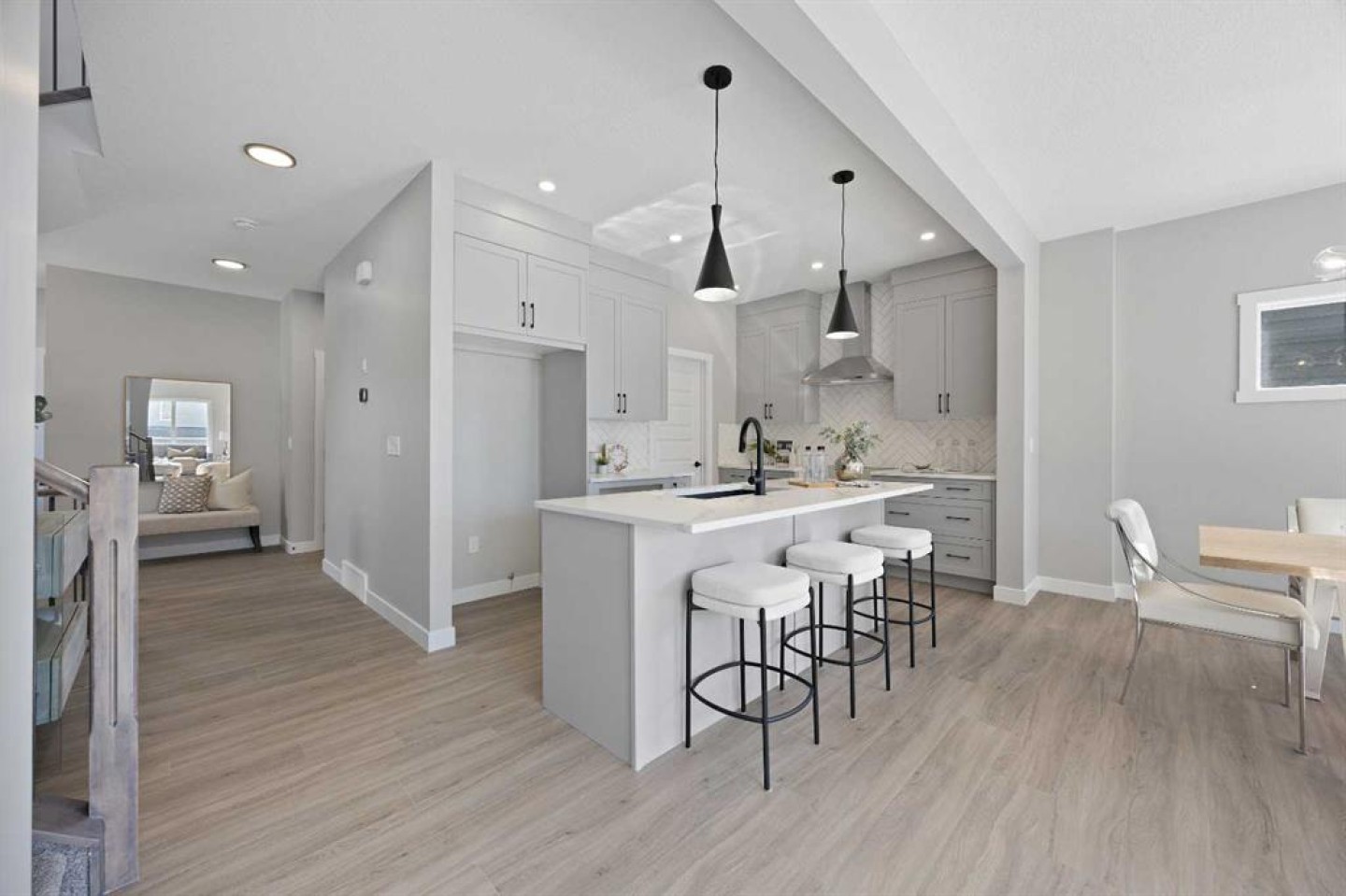 Welcome to 1414 Bayview Crescent, a beautifully designed 3-bedroom, 2.5 bathroom WALKOUT home with sunny south backyard exposure that floods the home with natural light. Step inside to a bright, inviting main floor featuring luxury vinyl plank flooring that spans the entire level and is complemented by 9-foot ceilings. The chef's kitchen showcases sleek grey cabinetry with stylish black hardware, paired with a crisp white tile backsplash, elegant quartz countertops, and stainless steel appliances. A convenient gas line is already installed, should you wish to upgrade to a gas range. The living room features a stunning floor-to-ceiling tiled feature wall, creating a beautiful focal point. Adjacent to the living space, the dining area is ideal for entertaining and flows seamlessly to the outdoors. Extend your living space to the outdoors and enjoy warm summer days on the full-width deck. Completing the main floor are a practical mudroom just off the double-attached garage, a spacious pantry, and a convenient powder room. Upstairs, you'll find a central bonus room that provides separation between the primary suite and the secondary bedrooms, offering both comfort and privacy. The primary retreat is generously sized and features a spa-inspired ensuite with dual sinks, a relaxing soaker tub, and an oversized shower, as well as a truly impressive walk-in closet. A full bathroom complements two additional well-sized bedrooms, while the upstairs laundry room adds everyday convenience. The unfinished walkout basement, with 9-foot ceilings, offers a blank canvas for your future development ideas.