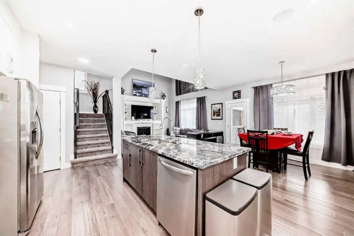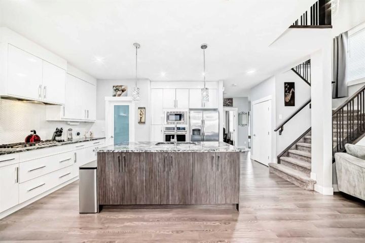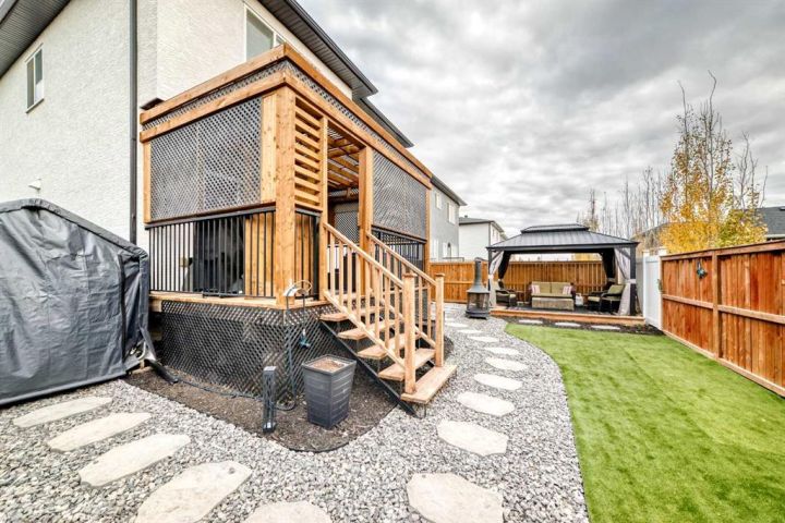 WELCOME TO YOUR DREAM HOME IN THE HEART OF CARSTAIRS! ... Move in For Christmas! This home is Tucked away in a quiet cul-de-sac. An exquisite 2-storey residence offering the perfect blend of luxury, comfort, and convenience. Just minutes from the golf course and downtown shopping. This beautifully designed home is ideal for families and professionals alike. Step inside to discover 9-foot knockdown ceilings and rich laminate flooring throughout the main level. Soaring 18-foot ceilings and expansive Low-E vinyl windows flood the space with natural light, creating an airy and inviting atmosphere. The high-end kitchen is a showstopper, featuring 42" high-gloss cabinets, granite countertops, stainless steel appliances, and a massive island, perfect for casual meals or entertaining. Enjoy cozy winter evenings by the fireplace in the spacious living room, complete with a stunning built-in surround with tile and contemporary shelving. This home boasts the addition of central air conditioning to keep you cool on all those hot summer nights. Enhanced with built-in kitchen and primary bedroom ceiling speakers roughed in for your future hidden sound system. French doors lead to a versatile main floor office/extra bedroom, offering flexibility for your lifestyle. Upstairs, the luxurious primary suite boasts a spa-like 5-piece ensuite with granite counters, a jetted tub, and a tiled shower. Two additional bedrooms, a full bathroom, and a wonderful bonus room for your extra large screen tv to provide a special space for family living, movie nights, or playtime. Step outside into your maintenance-free backyard retreat, featuring a pergola-covered deck, a separate gazebo for quiet getaways, and a cozy corner swing, all surrounded by artificial grass, decorative stones, and paving stones for easy upkeep. There's extra storage space and a dog run along the side yard and a separate entrance to the basement, offering even more flexibility. Car enthusiasts, hobbyists, or fitness lovers will be thrilled by the triple car garage, a true stunner with room for vehicles, tools, and exercise equipment. Located within walking distance to schools, parks, medical offices, the library, and Carstairs' finest restaurants. This home truly has it all. And with Calgary just 30 minutes away, you'll enjoy the perfect balance of small-town charm and city convenience. DON'T MISS YOUR CHANCE TO OWN THIS STUNNING HOME! SCHEDULE YOUR SHOWING TODAY.