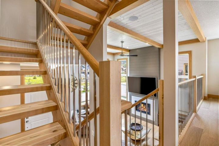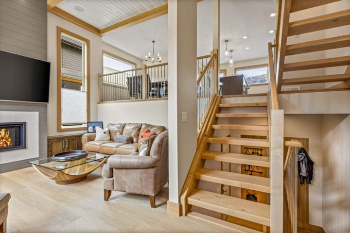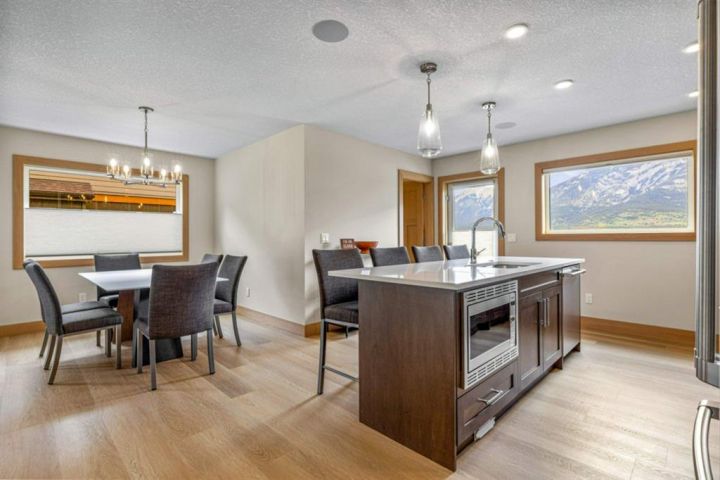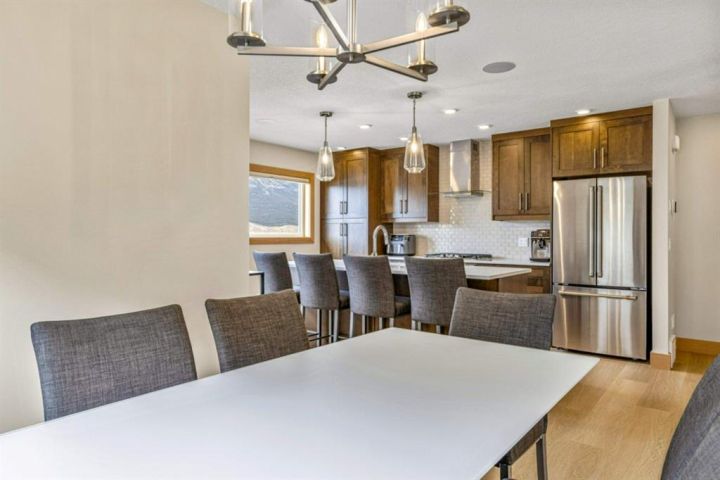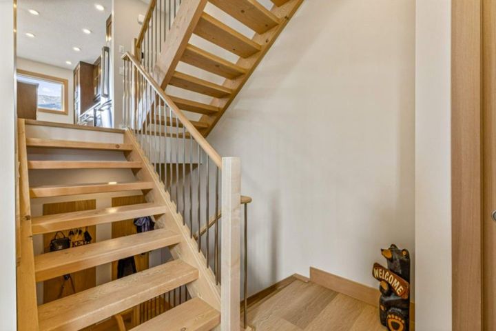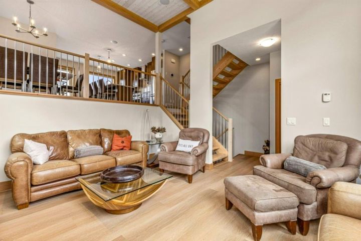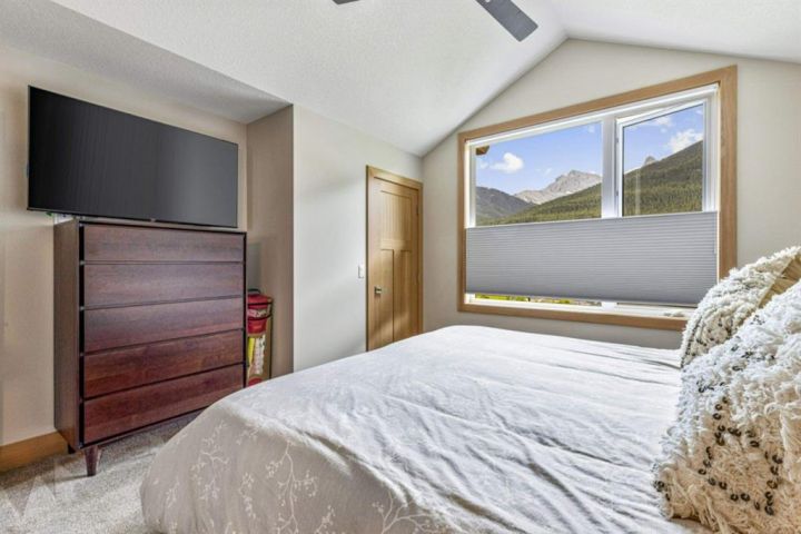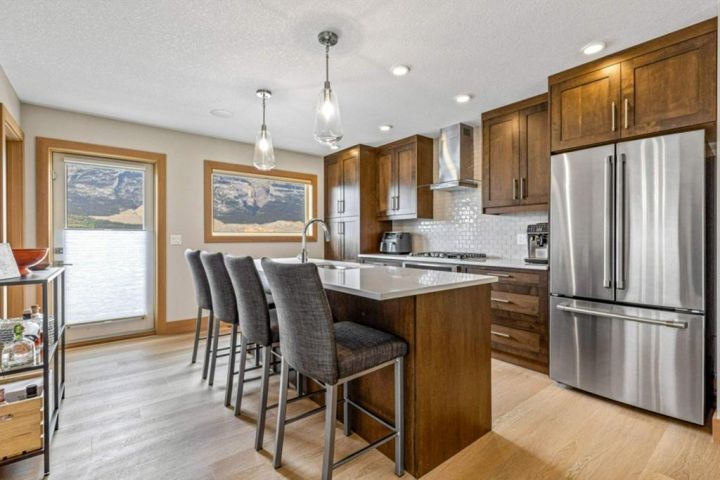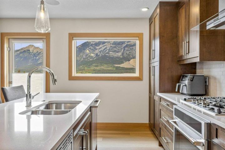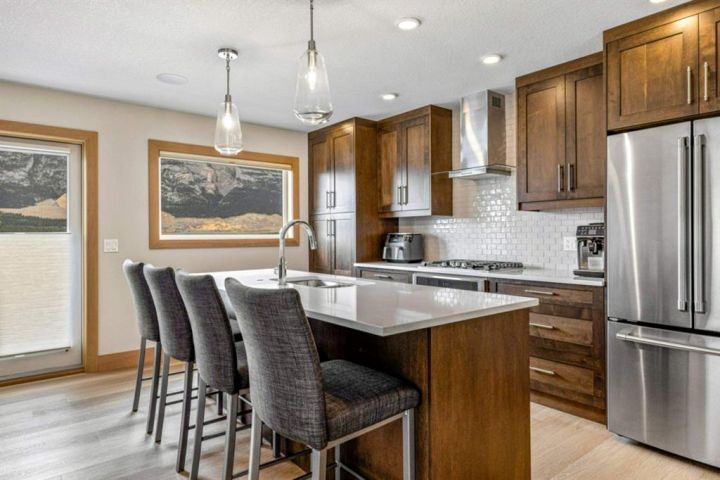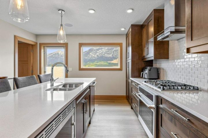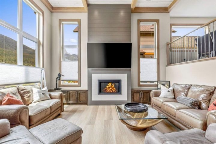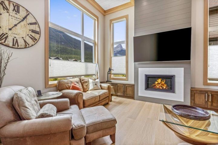Adjacent to the renowned Stewart Creek Golf Course, this remarkably upgraded mountain-modern home captures the essence of Canmore living. Vaulted ceilings, expansive windows, and 180° exposure flood the 1,850SF space with natural light while framing breathtaking mountain views. Thoughtful design details run throughout, including a custom wood ceiling, stained cabinetry, open-riser stairs, and striking wood beams. The chef’s kitchen showcases premium built in appliances (including a 6 burner gas cooktop), large quartz island, and direct access to a massive west-facing wraparound deck with a BBQ gas hookup—perfect for morning coffee or evening sunsets. From the kitchen, look out over the inviting family room, where a statement gas fireplace anchors the south-facing living space. Upstairs, the serene primary suite features a picture-frame window with views of the iconic Third Sister, a private ensuite with double sinks, and a generous walk-in closet. Two additional bedrooms and a 4-piece bath complete the upper level. The versatile lower level includes a fourth bedroom or flex space ideal for a media room, home office, or fitness area, along with a third full bath. The heated double garage offers epoxy flooring, a slatted wall organizing system, and ample gear storage—perfect for outdoor enthusiasts. Additional upgrades include hardwired speakers, a hot tub rough-in, EV charging rough-in, custom pantry shelving, built-in cabinetry, and low-maintenance landscaping.