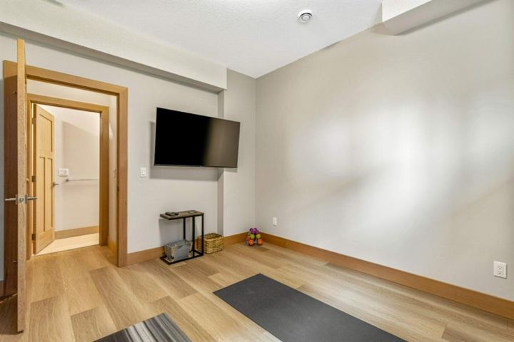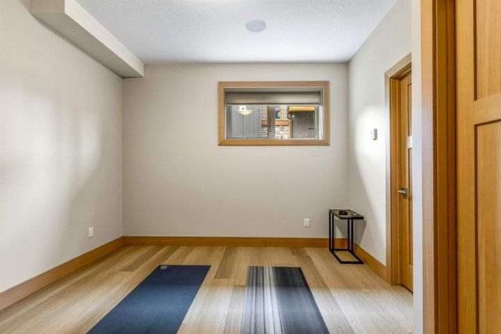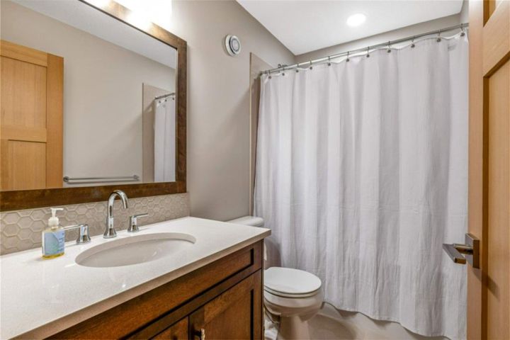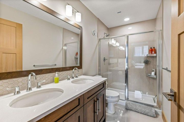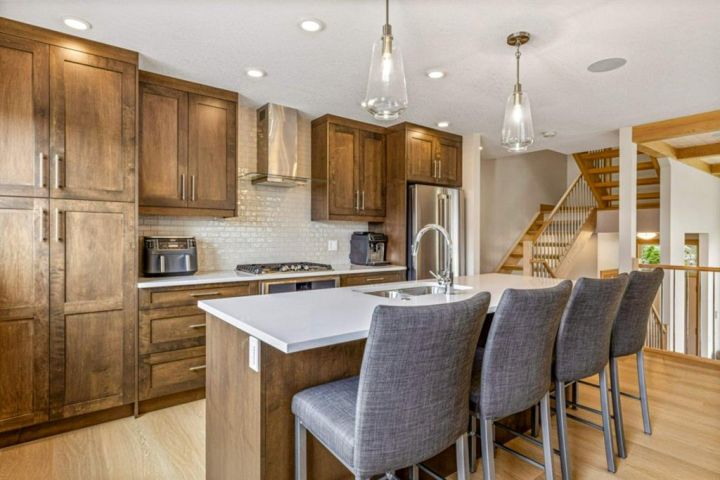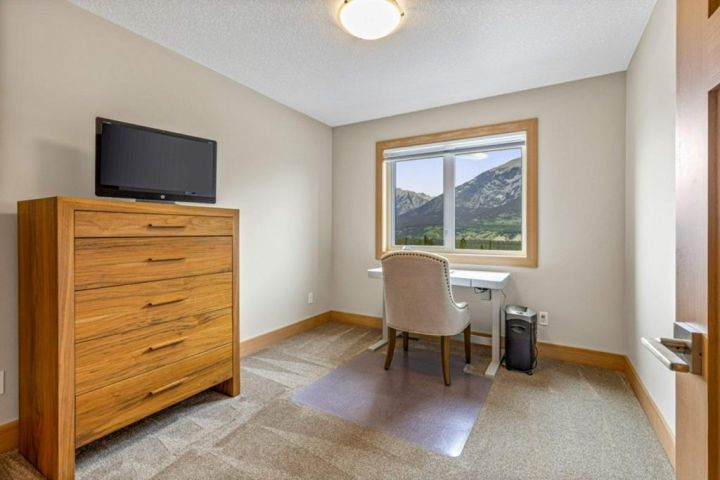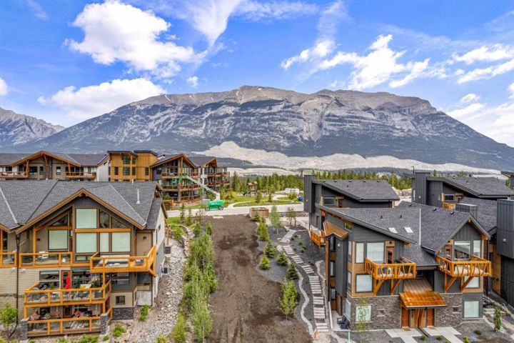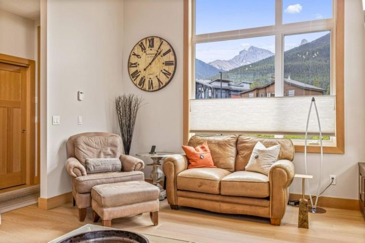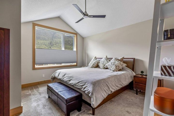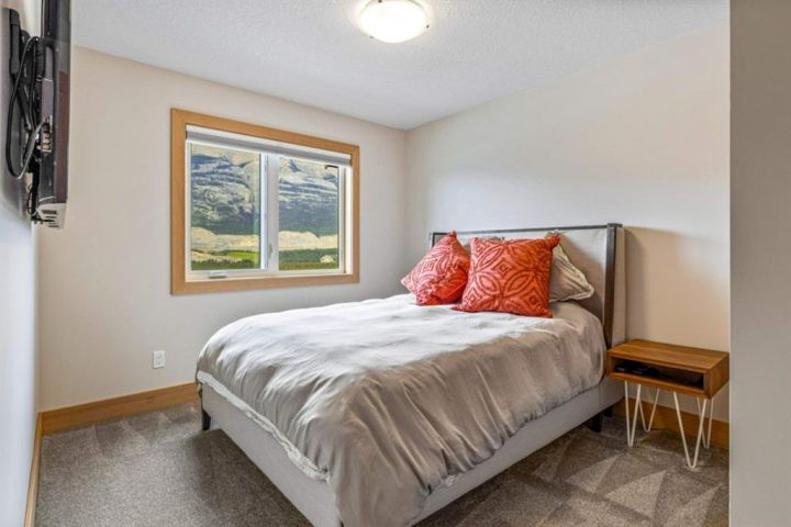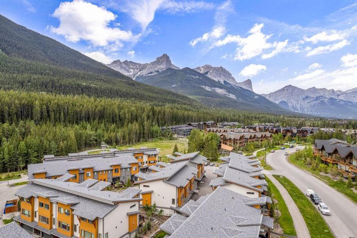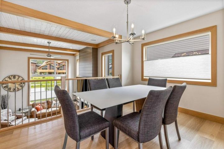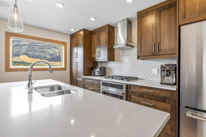 Adjacent to the renowned Stewart Creek Golf Course, this remarkably upgraded mountain-modern home captures the essence of Canmore living. Vaulted ceilings, expansive windows, and 180° exposure flood the 1,850SF space with natural light while framing breathtaking mountain views. Thoughtful design details run throughout, including a custom wood ceiling, stained cabinetry, open-riser stairs, and striking wood beams. The chef’s kitchen showcases premium built in appliances (including a 6 burner gas cooktop), large quartz island, and direct access to a massive west-facing wraparound deck with a BBQ gas hookup—perfect for morning coffee or evening sunsets. From the kitchen, look out over the inviting family room, where a statement gas fireplace anchors the south-facing living space. Upstairs, the serene primary suite features a picture-frame window with views of the iconic Third Sister, a private ensuite with double sinks, and a generous walk-in closet. Two additional bedrooms and a 4-piece bath complete the upper level. The versatile lower level includes a fourth bedroom or flex space ideal for a media room, home office, or fitness area, along with a third full bath. The heated double garage offers epoxy flooring, a slatted wall organizing system, and ample gear storage—perfect for outdoor enthusiasts. Additional upgrades include hardwired speakers, a hot tub rough-in, EV charging rough-in, custom pantry shelving, built-in cabinetry, and low-maintenance landscaping.