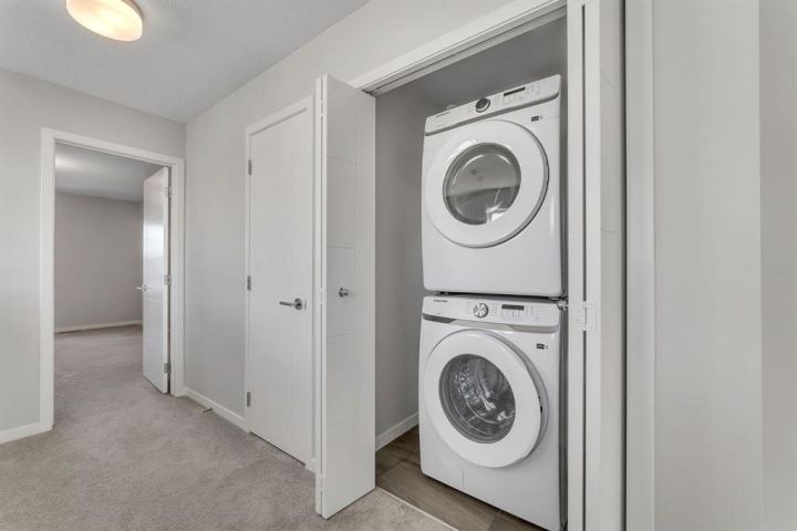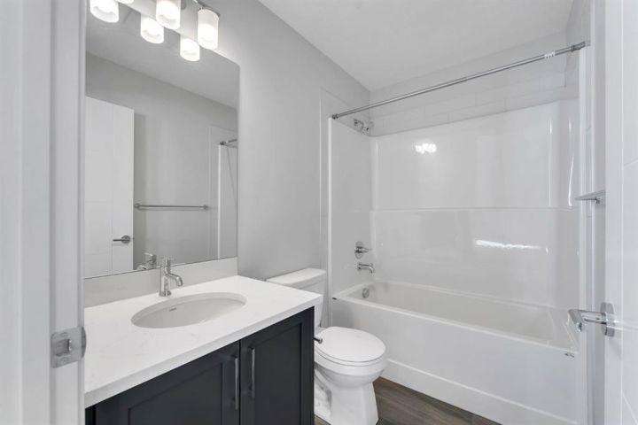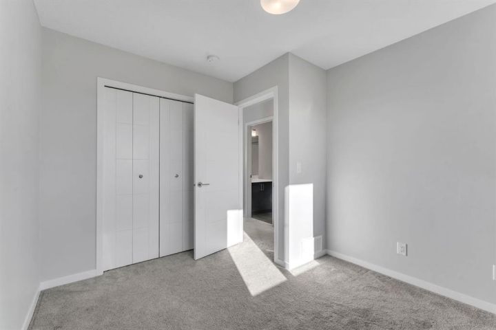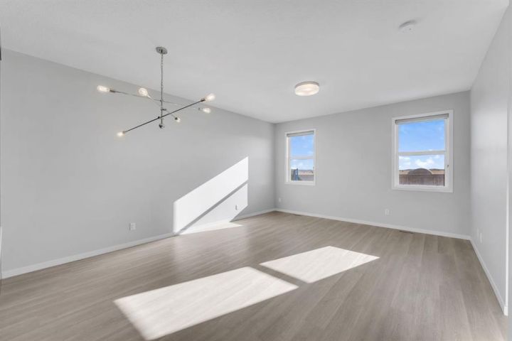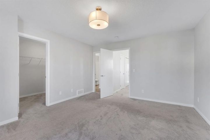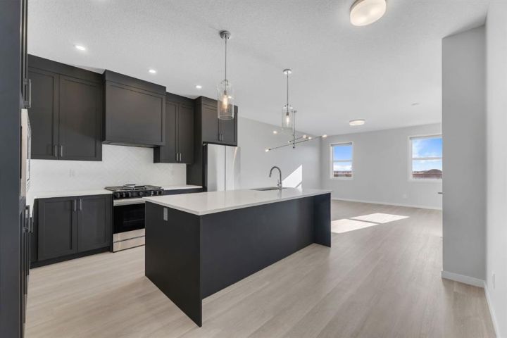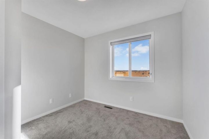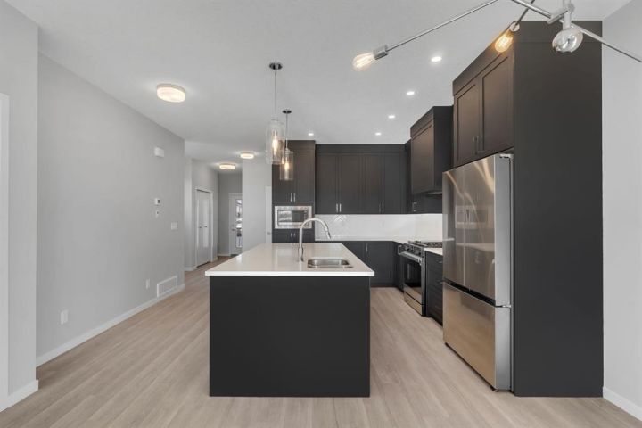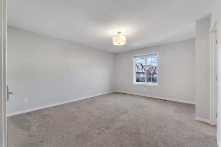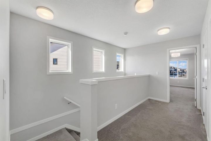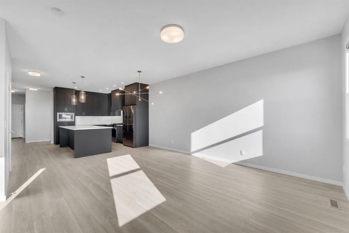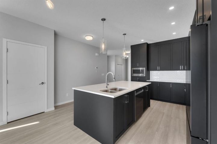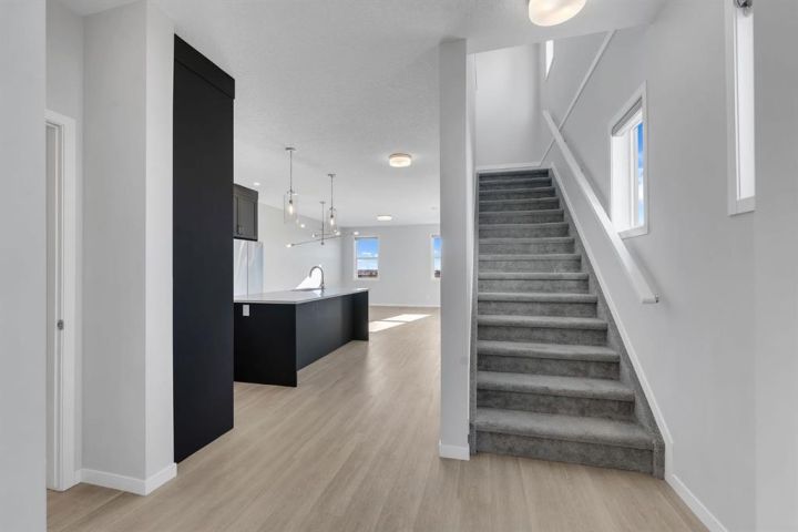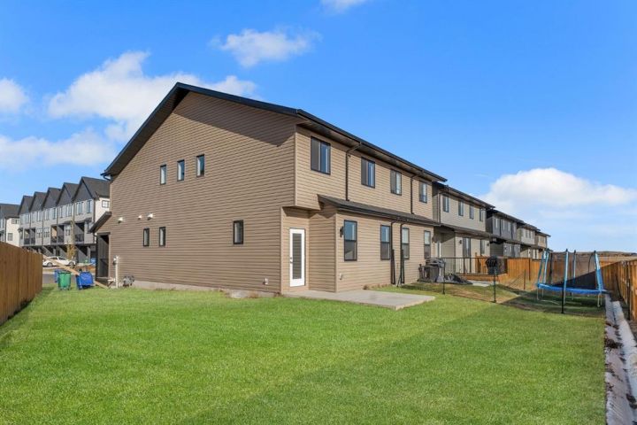 3 BEDROOMS | 2.5 BATHROOMS | FRONT ATTACHED GARAGE | NEWLY PAINTED | BIG PIE LOT | Welcome to this stunning newer 3-bedroom, 2.5-bath semi-detached home nestled on a massive pie-shaped lot in the desirable community of South Point, Airdrie. Perfectly located on a quiet, family-friendly street, this property combines modern comfort, functional design, and a spacious outdoor lifestyle — an ideal choice for young and growing families. Step inside to discover a bright, open-concept layout designed for modern living. The main floor greets you with abundant natural light streaming through large windows on multiple sides, highlighting the warm tones and contemporary finishes throughout. The chef-inspired kitchen features stainless steel appliances, quartz countertops, a built-in microwave, elegant cabinetry, and a large island — making it the heart of the home for family gatherings or entertaining friends. The open layout seamlessly connects the kitchen, dining area, and living room, creating a perfect flow for everyday living. Upstairs, retreat to the spacious primary suite complete with a luxurious 4-piece ensuite showcasing dual sinks, a walk-in shower, and modern fixtures. Two additional bedrooms offer ample space for kids, guests, or a home office, complemented by a full bath and convenient laundry area. The unfinished basement, with its large window, presents endless possibilities — whether you envision a recreation room, gym, or future legal suite(subject to city's approval). Outside, enjoy the large concrete patio and expansive backyard — a rare find on such a big lot — perfect for summer barbecues, gardening, or simply relaxing under the open sky. The front-attached garage adds convenience, while the meticulously maintained exterior reflects true pride of ownership. Located in the vibrant South Point community, you’ll enjoy access to parks, playgrounds, tennis and basketball courts, BBQ areas, and an off-leash dog park. Families will appreciate having a brand-new elementary school within walking distance, while commuters benefit from easy access to QEII Highway, Main Street, and the South Transit Terminal. A perfect blend of comfort, style, and location — this home offers everything you’ve been looking for. Don’t miss your chance to make it yours!