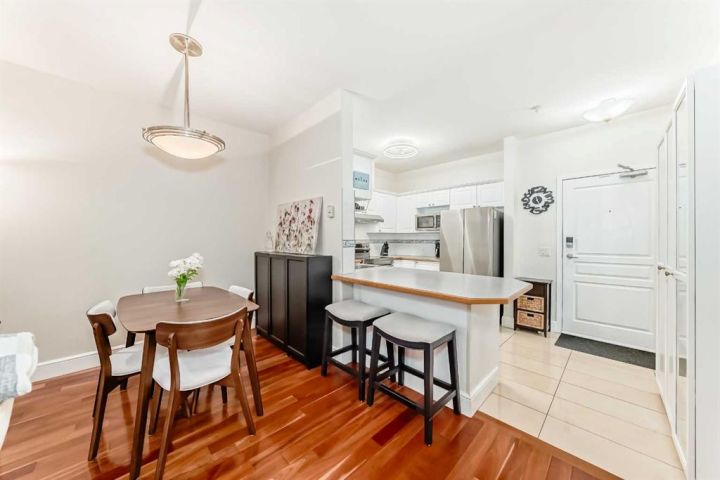 Welcome to this wide open and tidy one bedroom main floor unit in the sought after Bonavista Estates complex. Incredible complex that offers all the amenities you will ever need. A huge social room with pool table, kitchen & eating areas, card table & games overlooking a central fireplace. There is a movie theatre room with row seating and big screen projection TV and a handy full size gym as well. The unit is nice and open with gleaming hardwood & tiled flooring everywhere except the bedroom. Nice 9 foot ceilings and large windows provide loads of natural light. The kitchen has new SS appliances, tiled floors and like new white kitchen cabinets. Overlooking the kitchen you will find a good sized dining area and a large living room with a central gas fireplace that is bookcased with two oversized windows and has a recessed builtin niche great for the TV. The walkout leads to a large and private covered patio which overlooks a huge green space with loads of mature trees. The main living area is kept cool in the summer with a newer wall AC unit. The Primary bedroom is a good size with a large window, his n her double closets and a full 4 pce bathroom with tiled floors and nice deep soaker tub. There is a handy 2 pce powder room as well which has the stacker washer/dryer. Dont miss the titled underground heated parking stall (#82) where you will also find the oversized storage locker~one of the bigger ones in the building! Move in ready in a great complex.