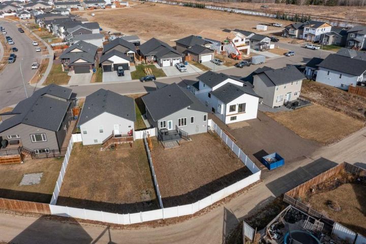 Beautifully upgraded bi-level located in the newer community of Aurora in Blackfalds. The stunning curb appeal is complimented by the attractive blend of stone work, wood accents and vertical siding. A welcoming front entrance greets you inside which offers a wide staircase plus a black gunpowder metal railing. A show case of a kitchen you will enjoy everyday in. Upgraded two tone cabinets, full surround quartz counter tops, all matching Black appliances with an upgraded gas stove, deep corner pantry for extra storage, floating shelves plus modern style light fixtures. Excellent size dining area and living space with plenty of windows all equipped with custom blinds. Garden door off back which leads out to the relaxing SW facing deck equipped with gas line for BBQ which overlooks the massive fully fenced yard. Wonderful three bedroom main floor plain with a generous Primary Bedroom offering you plenty of closet space plus your own private en suite with dual vanity and stand up shower. Save the extras steps and appreciate the convenience of the main floor laundry as well. Professionally developed basement is a great design for family and entertaining. Large media area perfect for gaming or streaming a favorite movie but then follow through the Barn Doors to the massive family room with plenty of space for games tables or even office/studio section. An additional bedroom for guests plus another three piece bath with walk in shower offering full tile surround, wide entrance and safety bars. Huge storage area at back of home ideal for all your seasonal clothing and decorations. A/C unit already in place for the warm next season plus the finished attached garage offers a rough in for gas heater. Built with quality by True Line developments you can buy with the assurance of a great home. Home is located within walking distance to small neighborhood shopping plaza plus other close by amenities.