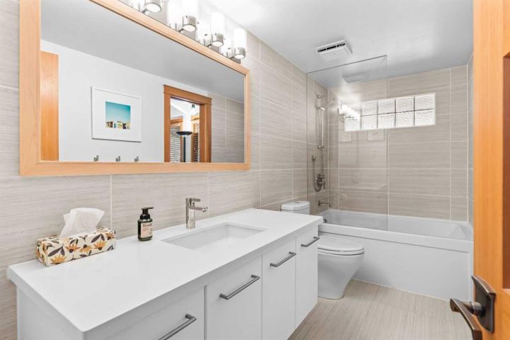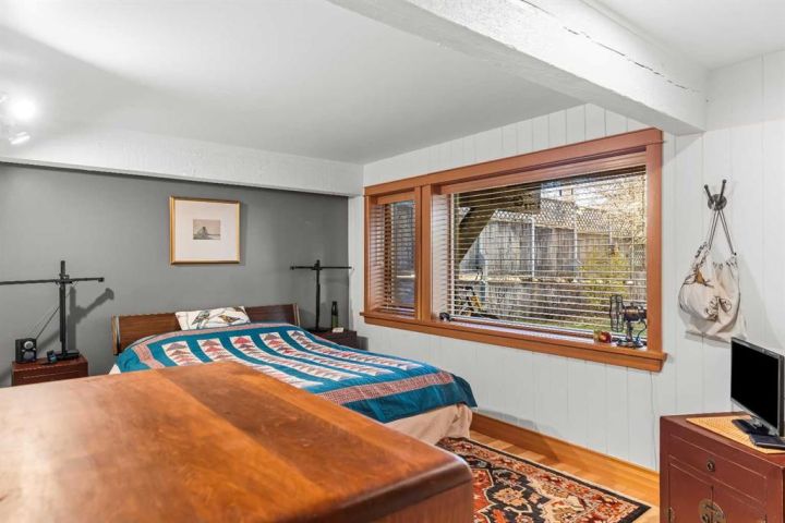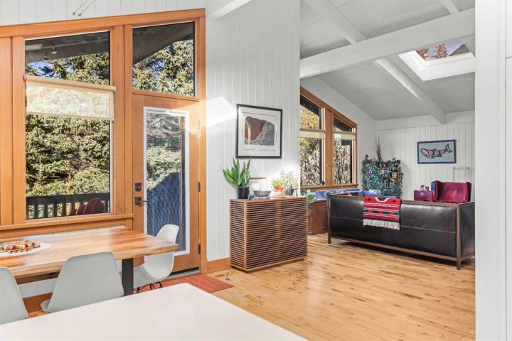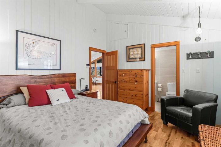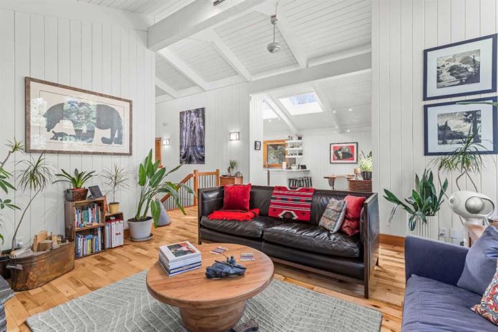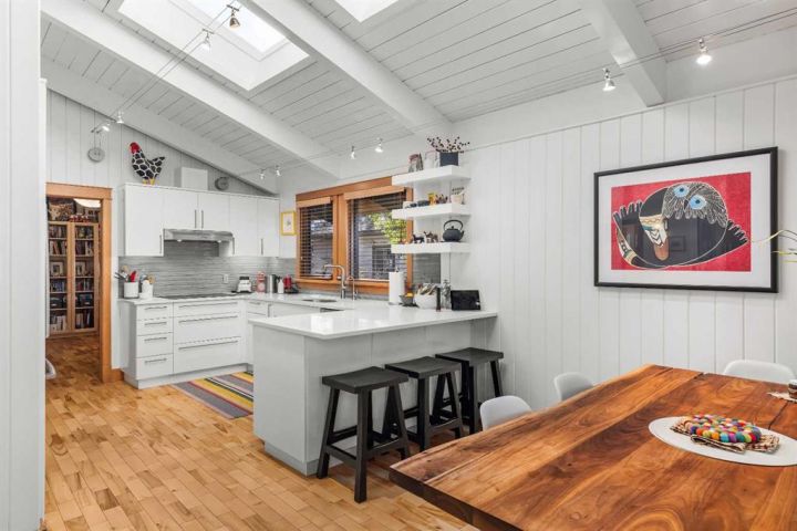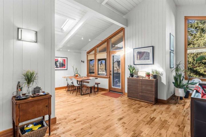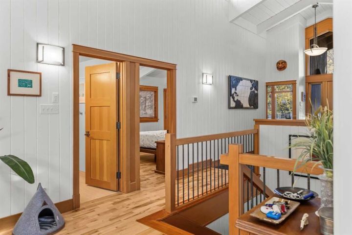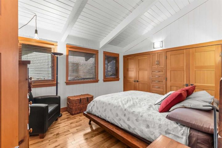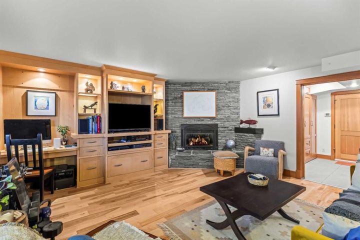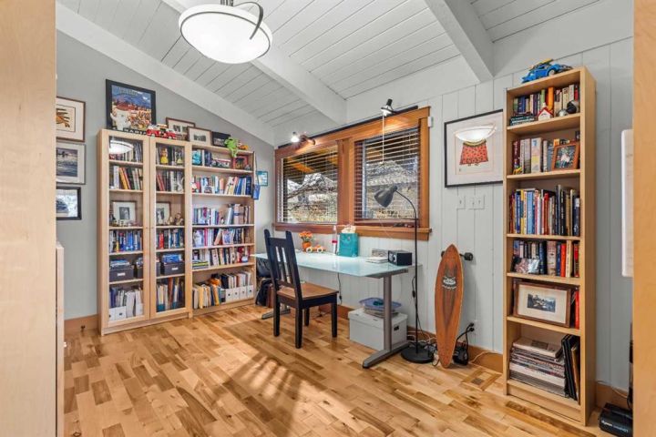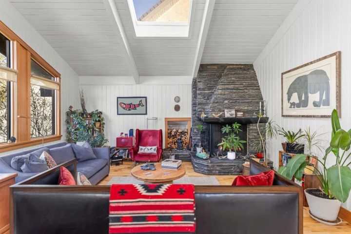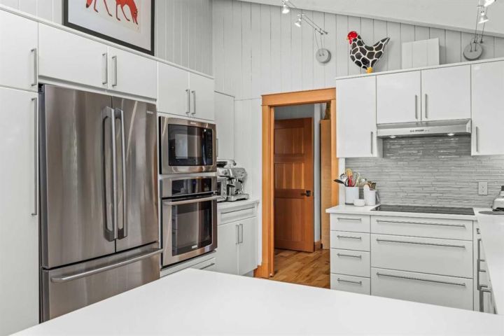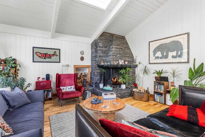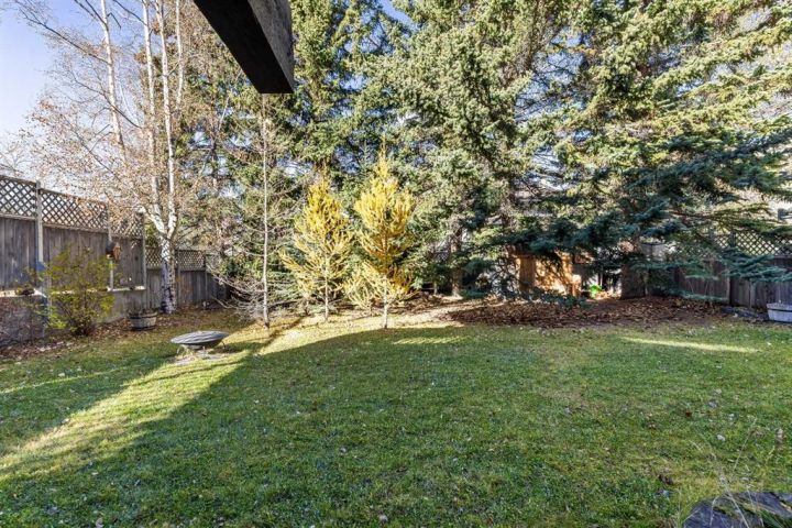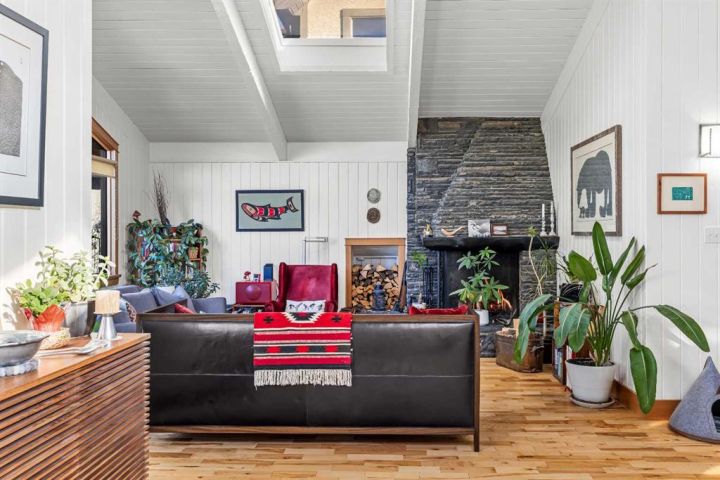 Unique Mountain Modern Four Bedroom Bungalow with Walkout Lower Level with Mountain Views, Loads of Sunshine and Large Private Backyard! Designed by local renowned architect Phillippe Delasalle this home features: Rundle rock foyer; hardwood floors; cedar panelled walls and ceilings; vaulted ceilings with exposed structural wood beams and numerous sky lights; Douglas Fir doors, baseboard, trim, hand railing, and stairs with open risers; custom fir and maple built ins; beautiful custom corner floor to ceiling rock faced wood burning fireplace with wood mantel; recently renovated kitchen with stainless steel appliances and Quartz counter-tops; renovated full four piece bathroom upstairs and three piece bathroom downstairs; cozy gas fireplace in spacious family room walking out to backyard; heated garage and workshop with additional storage; two additional parking spaces outside. This home truly must be seen to be appreciated!