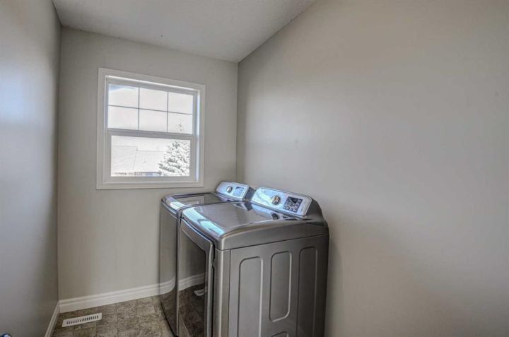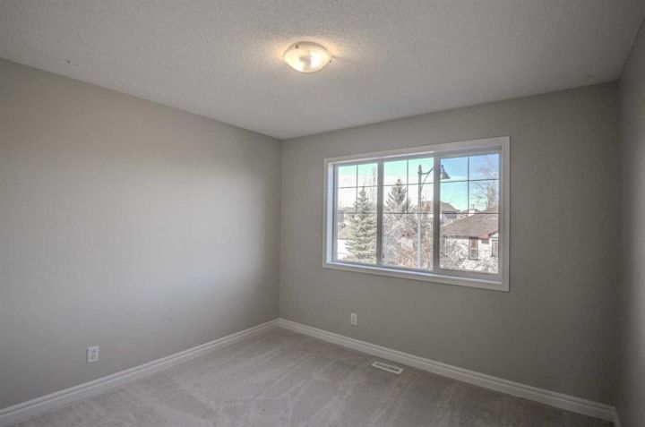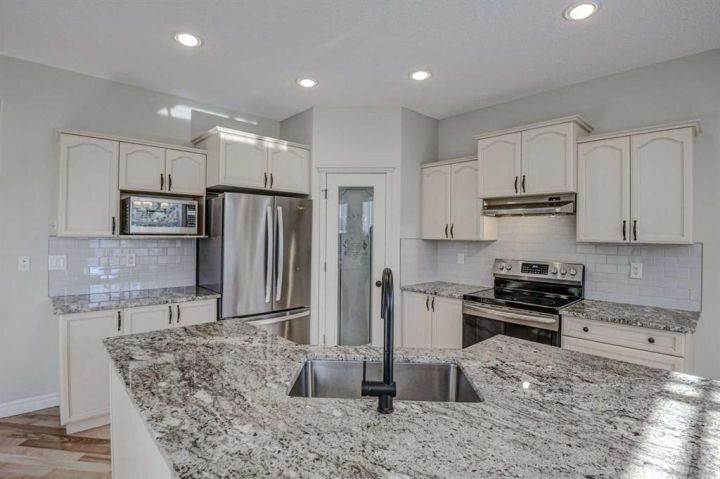 Prestwick Estates – Beautiful 3-bedroom, 2 ½ bath home with an oversized double garage and a self-contained legal one-bedroom carriage suite. The main floor features 9-ft ceilings, a large kitchen with new granite countertops, stainless-steel appliances, a huge island perfect for entertaining, a spacious great room with gas fireplace, a front flex room, and a main floor den with French doors. Refinished hardwood floors on the main level add warmth throughout. Upstairs offers three bedrooms, a convenient laundry room, and two full baths, including a generous primary suite with double doors, walk-in closet, a 5-piece ensuite with soaker tub, a separate 4-ft shower, and dual sinks. The basement is ready for development with rough-in plumbing and two large windows. The self-contained one-bedroom legal carriage suite is currently rented for $1,375/month and features vaulted ceilings, a galley kitchen, a 4-piece bath, and updated in-suite laundry. Recent updates in the main house include new granite counters, refinished hardwood floors, new carpet, fresh paint throughout, and new shingles ordered. The yard is nicely landscaped with a covered front porch, large south-facing rear deck and mature trees. Lots of parking with an oversized double garage and a double wide parking pad off the paved alley. Located on a quiet street in the desirable McKenzie Towne community, this home is just a short walk to schools, parks, High Street shops, and the community splash park.