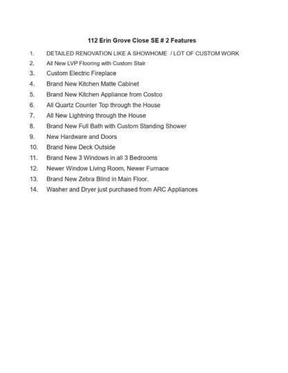 DETAILED RENOVATION LIKE A SHOWHOME | LOT OF CUSTOM WORK | All New LVP Flooring | Custom Electric Fireplace | Brand New Kitchen Matte Cabinet | Brand New Kitchen Appliance from Costco | All Quarzt Counter Top through the house | Custom Standing Shower | New Hardware and Doors | Brand New Deck | Brand New 3 Windows in all 3 Bedrooms | Newer Window Living Room | Newer Furnace | Brand New Zebra Blind in Main Floor. Welcome to #2, 112 Erin Grove Close SE, a 3 bedroom 1.5 bath two-storey townhome nestled in the heart of Calgary’s Erin Woods community. This home has been fully renovated from top to bottom with premium materials, exceptional craftmanship, functional and style. Luxury vinyl plank floor throughout the house, brand new bedroom windows, brand new kitchen cabinets brand new appliances and bathroom amenities, new deck. Back lane is accessible with one assigned parking slot, and lots of parking right in front of the house. On entering the main foyer, you will find a bright living room, with large windows and a stylish fireplace providing a cozy and modern feel. Kitchen has been fully renovated with quartz counter top, with a large windows overlooking the deck and backyard. Upstairs boasts 3 good sized bedrooms and a full bathroom with modern lights and standing shower. The basement is spacious and not finished, awaiting your personal touch. Located in the tranquil Erin Woods neighborhood, this home is just minutes from schools, parks, shopping, and offers easy access to Deerfoot and Stoney Trail, making commuting a breeze. The area is known for its quiet streets and abundance of green spaces—ideal for families and outdoor enthusiasts. Affordable and move-in ready, this house is a gem and can't be missed. Book your showing today before it's gone.