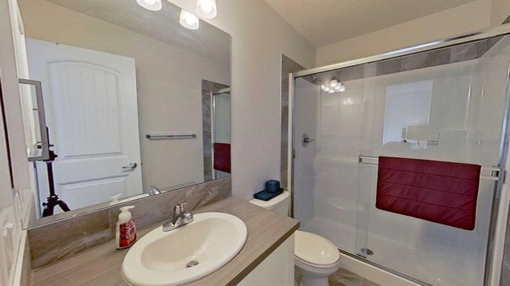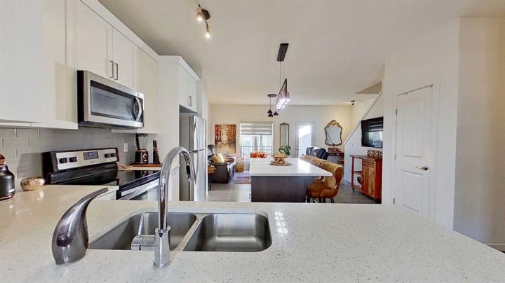Welcome to 132 Legacy Point, a beautifully designed townhome built by Aldebaran Homes. Bright and airy, this corner unit residence offers a low-maintenance lifestyle ideal for comfortable modern living. The double attached garage with an additional double parking pad provides ample parking and storage. The entry level features a spacious flex room that can serve as a bedroom or home office, a welcoming foyer, and a functional built-in bench with storage. The main level offers an open-concept layout with 9' ceilings, laminate flooring, and upgraded lighting fixtures throughout. The kitchen includes quartz countertops, stainless steel appliances, and a large island that’s perfect for cooking and entertaining. Two balconies—one at each end of the home, including one with a propane barbecue connection—bring in abundant natural light and fresh air. Upstairs, the primary suite includes a walk-in closet and private ensuite. Two additional bedrooms and a four-piece bath complete this level. The home is located steps from Legacy’s environmental reserve and scenic pathways, within the estate area, and offers convenient access to schools, shopping, and amenities. The complex is attractively landscaped and well maintained. Willing to sell home furnished.