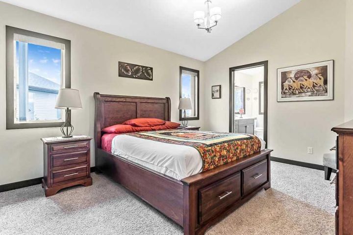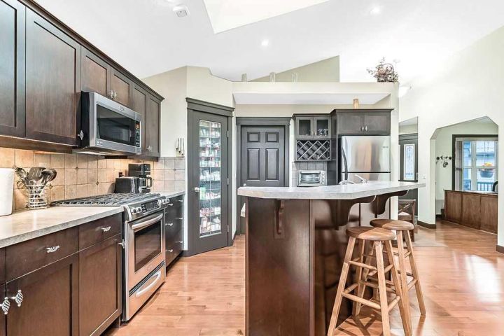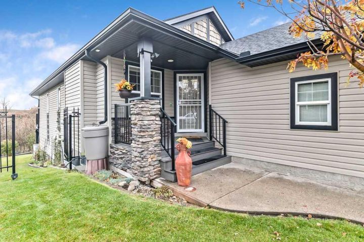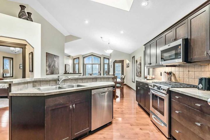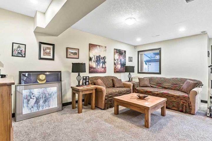 Beautiful walkout bungalow in Diamond Valley with stunning views and backing onto green space. This home has so many awesome features including a WEST backyard with mountain views, a fully finished WALKOUT basement with INFLOOR heat and recently updated rear decking. The list goes on with 2 skylights, hardwood flooring, a gas fireplace and newer paint. This home has a spacious primary bedroom on the main floor with a bright ensuite washroom and linen closet. There is a main floor laundry room as well. This home is located on a quiet street with easy access to walking paths, the golf course and shopping. The thoughtful landscaping in the WEST backyard includes a firepit area, lower patio and concrete walkways and multiple gardens and trees. Other extra's include updated triple pane windows on the west side in the living room, a tankless hot water system and 9 solar panels on the south side of the roof. The Solar panels were professionally installed in 2024. You have to see this home to believe it!