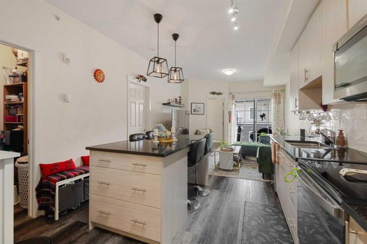 Welcome to Unit #2414 at 298 Sage Meadows Park NW — a beautifully designed top-floor condo built in 2020, nestled in the desirable northwest community of Sage Hill. This modern, move-in ready home offers 2 spacious bedrooms, 1 full bathroom, and stunning East-facing views of the peaceful pond and surrounding park. Inside, you'll find a bright, open-concept layout featuring 9’ ceilings, durable Luxury Vinyl Plank flooring throughout, and an abundance of natural light from oversized windows. The stylish kitchen is a true highlight, equipped with sleek quartz countertops, full-height cabinetry, stainless steel appliances, and a large island with seating—perfect for cooking, entertaining, or enjoying takeout nights. The living area flows seamlessly off the kitchen, offering a cozy space to relax and unwind. Step out onto your private balcony to enjoy your morning coffee with tranquil water views. The primary bedroom features a generous walk-in closet, while the second bedroom offers versatility for guests, a home office, or even a roommate setup. A well-appointed 4-piece bathroom is conveniently located nearby. Additional features include in-suite laundry, titled surface parking, and a storage locker—ideal for seasonal items, sports gear, or extra storage. This well-managed building offers access to scenic walking paths, green spaces, and nearby ponds and parks, all just steps from your door.