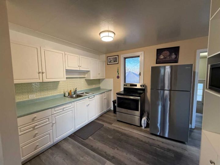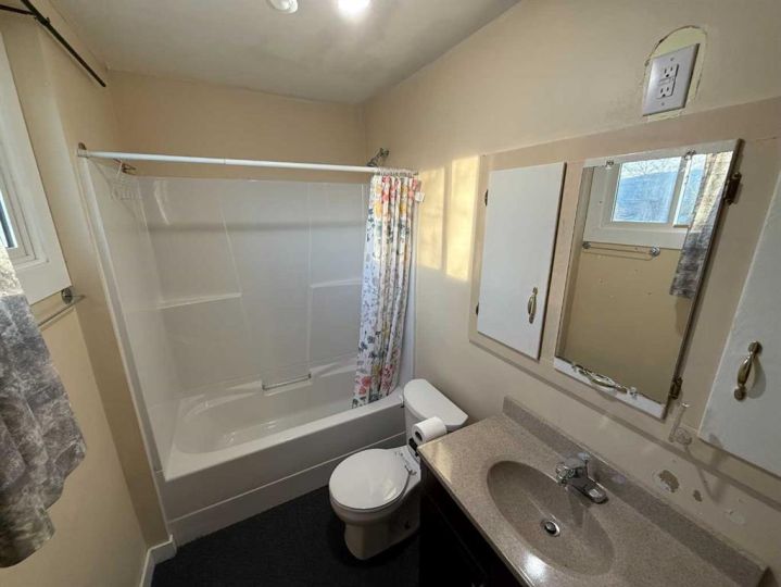 Discover this charming 1950s one and a half story home, nestled on two spacious lots. It features three cozy bedrooms upstairs, a main level bathroom, and an inviting open concept kitchen, living, and dining area filled with character. The partially developed basement would make a great suite or it could be added space for a large family, is nicely laid out with its own kitchen, bedroom, living room, and bathroom, ready for you to complete. There are also two driveways and a separate basement entrance. Additionally there is a versatile garage currently serving as a storage shed or workshop. Schedule a showing to take a look or check out the 360 virtual tour now available in the media section. Floor plans are available in the photos section.