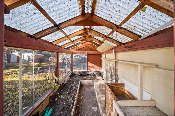 fridge and stove (as is, due to the faulty element), two sheds, greenhouse, China cabinet in the living room, shelving in the garage,