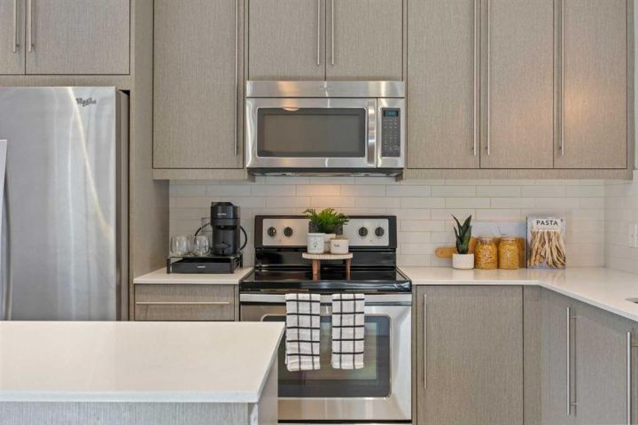 Dishwasher, Dryer, Electric Stove, Microwave, Refrigerator, Washer, Window Coverings