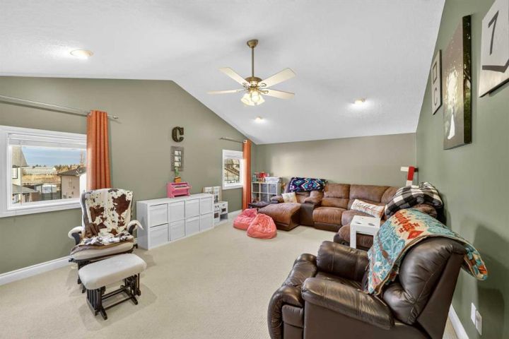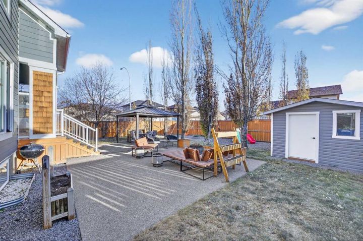 Welcome to this charming two-story home, perfectly situated on a quiet corner lot in one of Carstairs’ most family-friendly neighborhoods. Just a 3-minute drive to the elementary school and a short walk to Carriage Lane Park and the Carstairs Nature Space, this location offers an ideal blend of small-town comfort and everyday convenience. The main floor features Hardie board siding, slate and hardwood floors, and a gas fireplace with custom stonework and mantle that adds warmth to the living area. The kitchen and dining area open to a south-facing backyard oasis complete with a gazebo, aggregate patio, custom garden shed, and RV parking—perfect for summer gatherings and outdoor relaxation. Upstairs, enjoy vaulted ceilings in both the Primary Suite and Bonus Room, with the bonus room showcasing a built-in entertainment unit. The Primary Suite includes a spacious ensuite and walk-in closet, providing a private retreat. A convenient upstairs laundry room with extra storage adds to the home’s practicality. The oversized double attached garage offers plenty of room for vehicles, tools, and toys. Additional highlights include air conditioning, a high-efficiency furnace with upgraded air cleaner, and durable Hardie board siding for lasting curb appeal. This home is a pre-listing inspection available upon a successful offer.