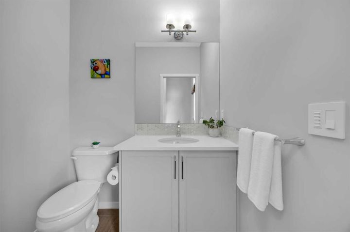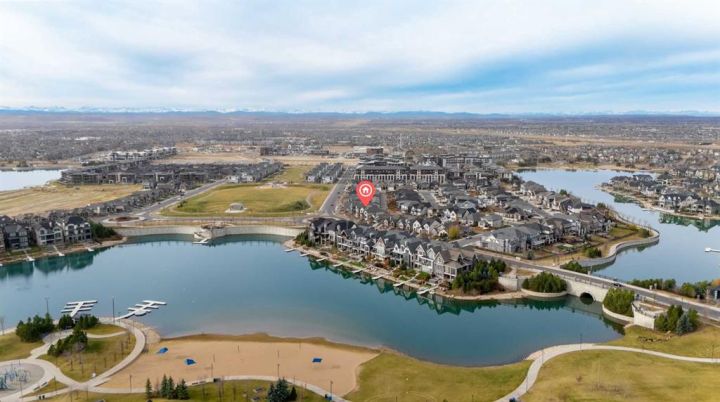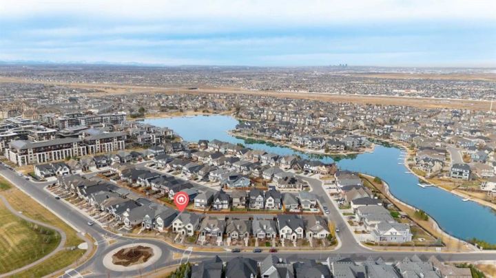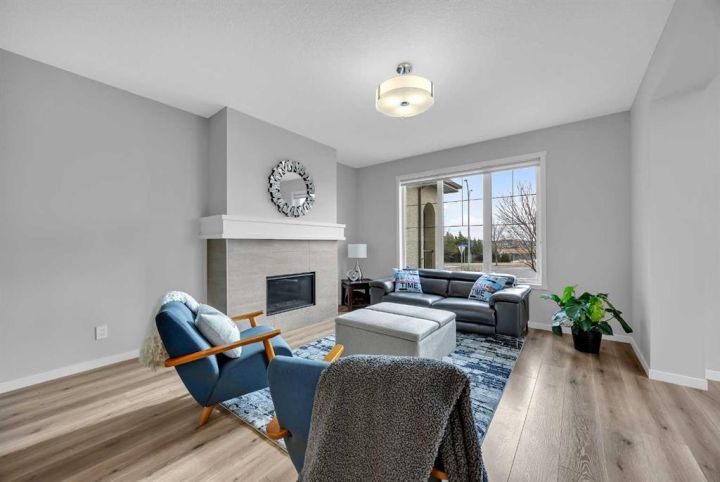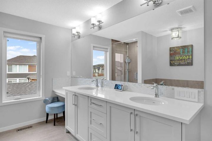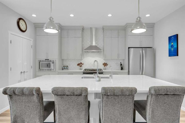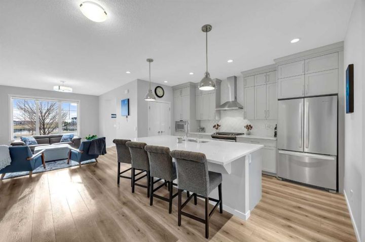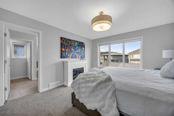 This executive paired home in Mahogany offers 1,888 sq. ft. of living space, a double detached garage, and incredible lake views. The main floor is bright and inviting, featuring oversized triple-pane windows, 9 ft. ceilings, and luxury vinyl plank flooring throughout. The stunning kitchen sits at the heart of the home and showcases extended Pewter cabinetry with soft-close doors and drawers, stainless steel appliances (including a built-in microwave and chimney hood fan), quartz countertops, and a large center island perfect for gathering with family and friends. A BBQ gas line adds convenience for outdoor entertaining. The living room takes full advantage of the lake views and includes a cozy gas fireplace, ideal for winter evenings. The spacious dining area easily accommodates a large table and provides access to the backyard patio through sliding doors. The home also features central air conditioning for year-round comfort. Upstairs you’ll find two bedrooms and a convenient laundry room complete with a front-load washer and dryer. The owner’s suite is a bright and relaxing retreat featuring a massive walk-in closet and a spa-inspired 5-piece ensuite with a soaker tub, separate shower, and private water closet. Located in an amazing estate area, just steps from the lake and beach, this home perfectly combines luxury, comfort, and the beauty of Mahogany’s lakefront lifestyle.