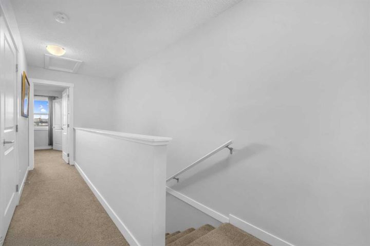 Welcome to your new home in Kings Heights! This beautifully maintained 975 sq ft two-storey townhome offers a bright open-concept layout with stunning luxury vinyl plank flooring throughout the main floor, flowing from the spacious living and dining areas into a larger-than-average kitchen featuring quartz countertops, stainless steel appliances, and plenty of counter and cabinet space—perfect for cooking and entertaining. A convenient two-piece bathroom completes the main level. Upstairs, you’ll find brand-new carpet (October 2025), two generous primary bedrooms each with its own ensuite, ample closet space, and large windows that fill the rooms with natural light, along with upper-floor laundry for added convenience. The tandem double garage below provides room for two cars or extra space for storage, a gym, or a workshop. Recent updates include a new garburator (May 2024) and a brand-new washer (September 2025). Located in the sought-after, family-friendly community of Kings Heights—close to schools, parks, restaurants, and shopping, with a new overpass into Airdre, tons of extra street parking, this home combines comfort, style, and exceptional value. Welcome home!