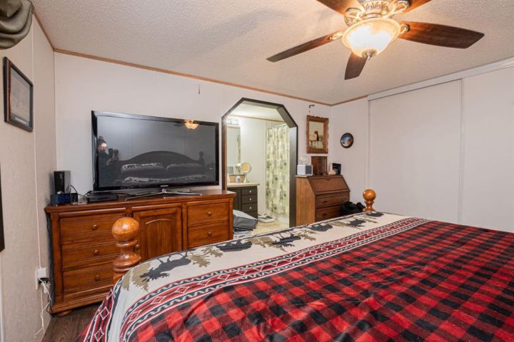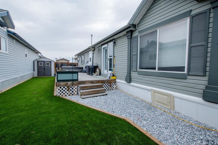Welcome to this charming 3 bedroom, 2 bathroom mobile home in the Creekside community! This well maintained property offers low maintenance landscaping and a fully fenced yard for added privacy and convenience. Enjoy plenty of parking options with a paved front parking pad, a single detached garage in the back, plus additional RV parking for your toys or guests. The home features an open floor plan with bright living spaces, perfect for relaxing or entertaining. The kitchen boasts stainless steel appliances and tons of cabintrey for storage. The primary bedroom is privately located at the rear of the home and features its own ensuite. The two good sized bedrooms and full bathroom complete the home. Located in a peaceful neighbourhood, with a fee of $175 monthly covering partial water, sewer, trash and snow removal, this home is ready for new ownership. Book your showing today!